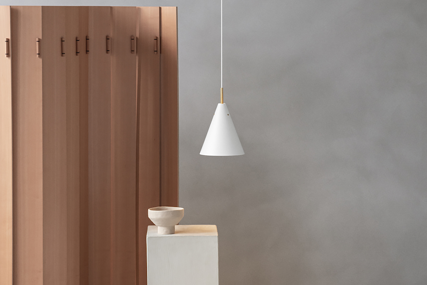 Lampan Mosaik ger ett mjukt och jämnt nedåtriktat ljus som optimeras av den koniska skärmformen. Öppningen överst i armaturen släpper igenom ljus som elegant lyser upp mässingsrören.