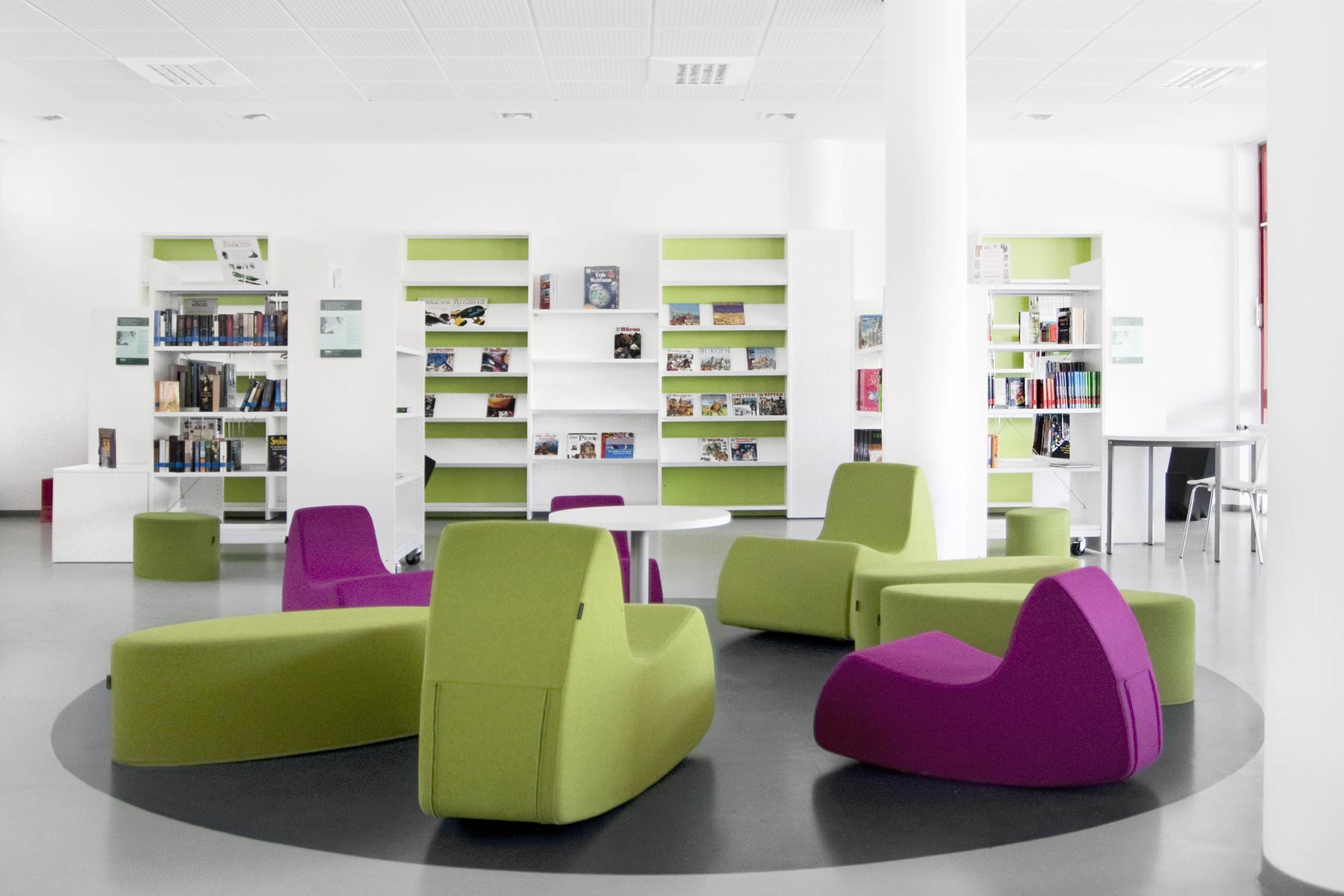 Den gröna och vita interiören ger en naturlig och frisk atmosfär och hänger samman med grönskan i den intilliggande atriumgården. Den är designad för att ge plats och inspiration till både självstudier och kommunikation mellan eleverna. Det är ett friskt och luftigt rum som göra lärandet roligt pch erbjuder ett avslappnat forum för skolans olika arrangemang.