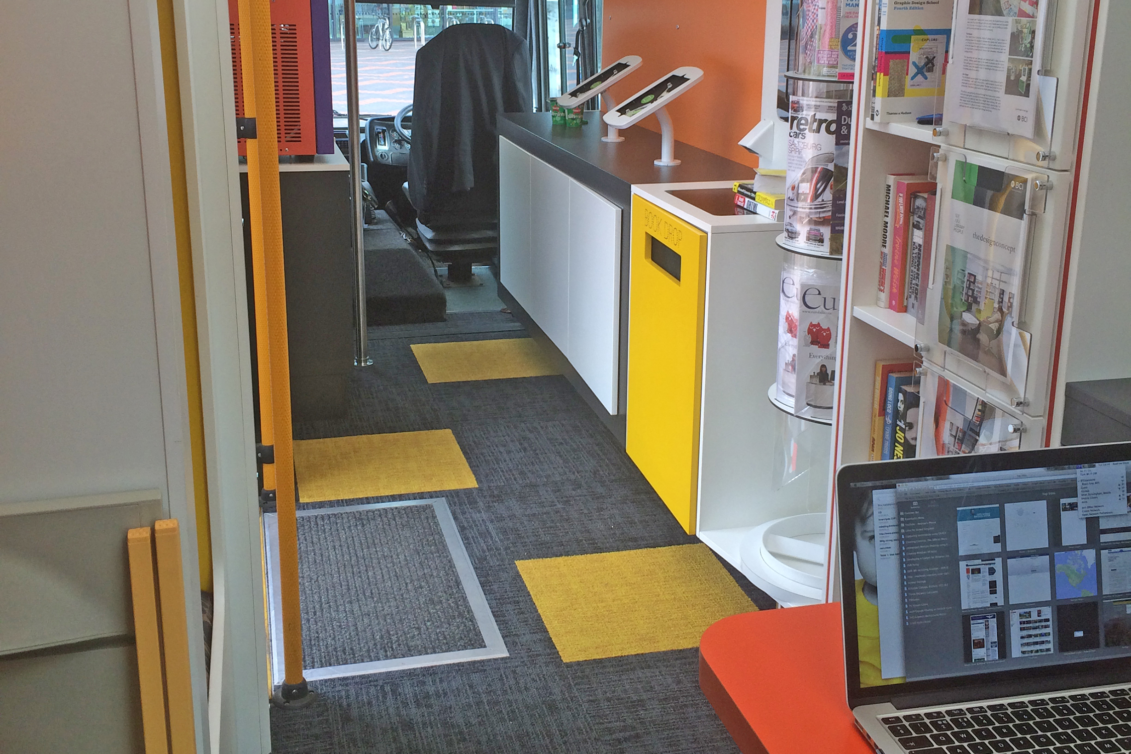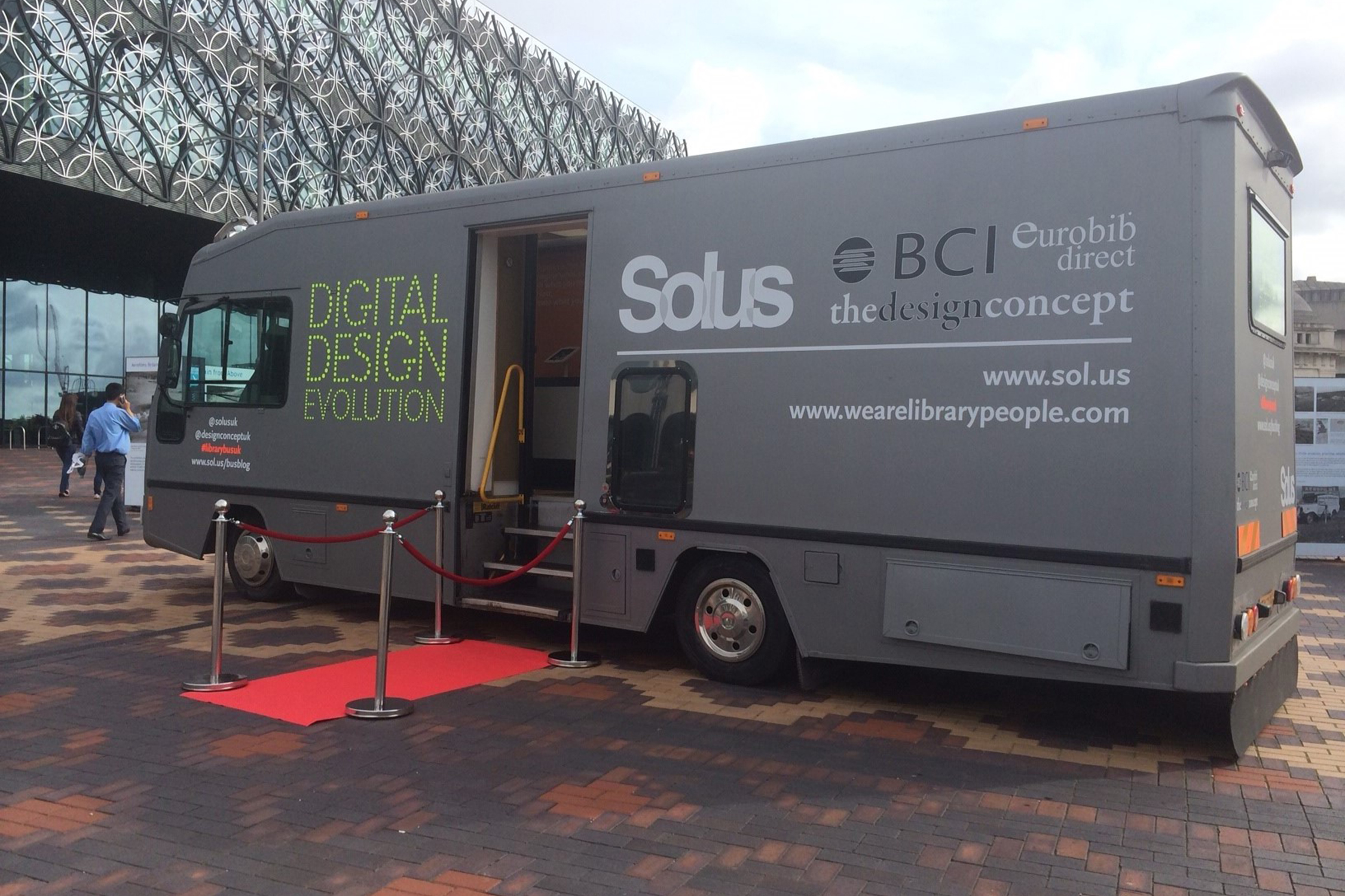 Stig in och upptäck bibliotekens framtid! Bokbussen har inretts med ett urval produkter från Eurobib Direct; Turbino och Cube liksom Cocoon tillsammans med 60/30 Klassisk stålhylla från BCI. Idén är att smälta samman våra produkter och vår formgivning med den integrerade digitala tekniken från Solus direkt till våra kunder.