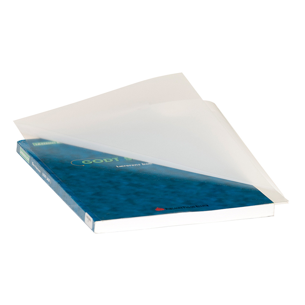 Märkbart styvare och tjockare plastfilm än normal bokplast.