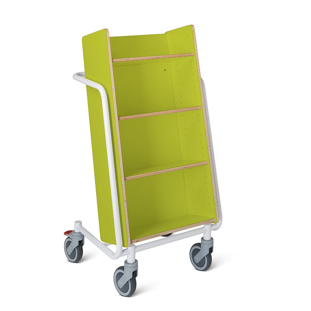 Enkelsidig vagn med 4 lutande hyllplan varav 3 är flyttbara för att passa olika bokstorlekar.