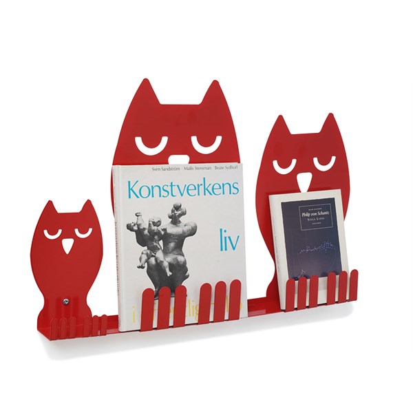 Vi har placerat vår populära ugglefamilj på en vägghängd exponeringslist för att de på ett lustfyllt sätt ska kunna presentera böcker och andra media.