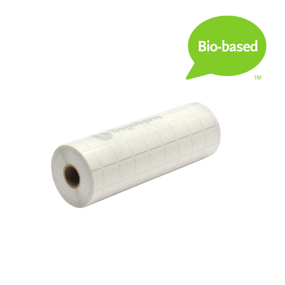 Den självhäftande, blanka plastfilmen är tillverkad av plast med 75% biologisk råvara (sockerrör) och vattenbaserat akryllim.
