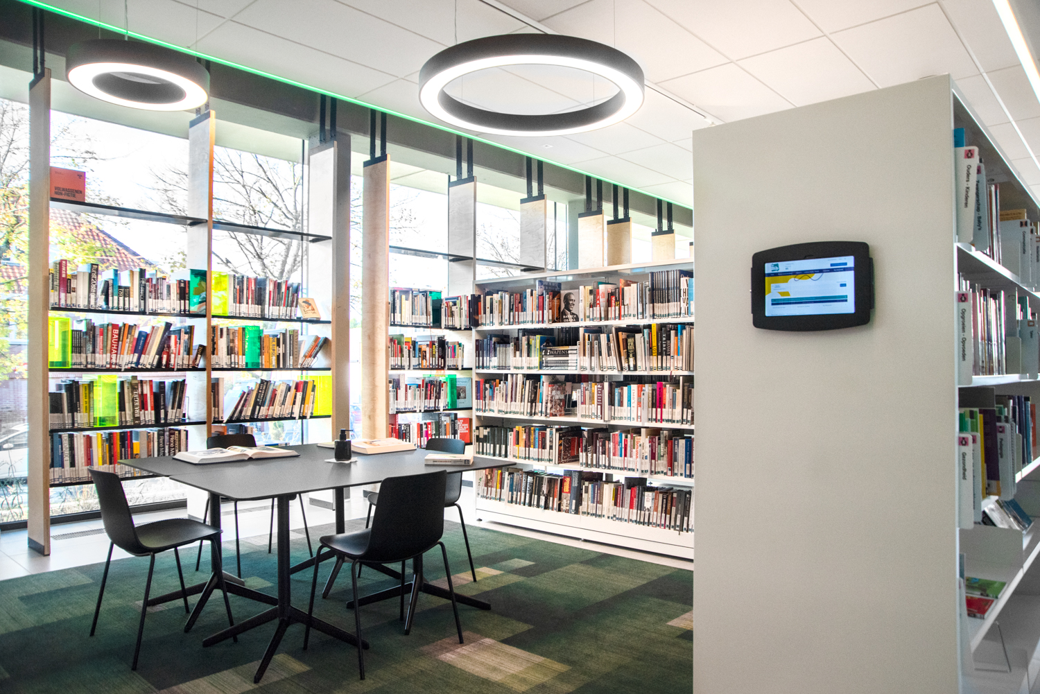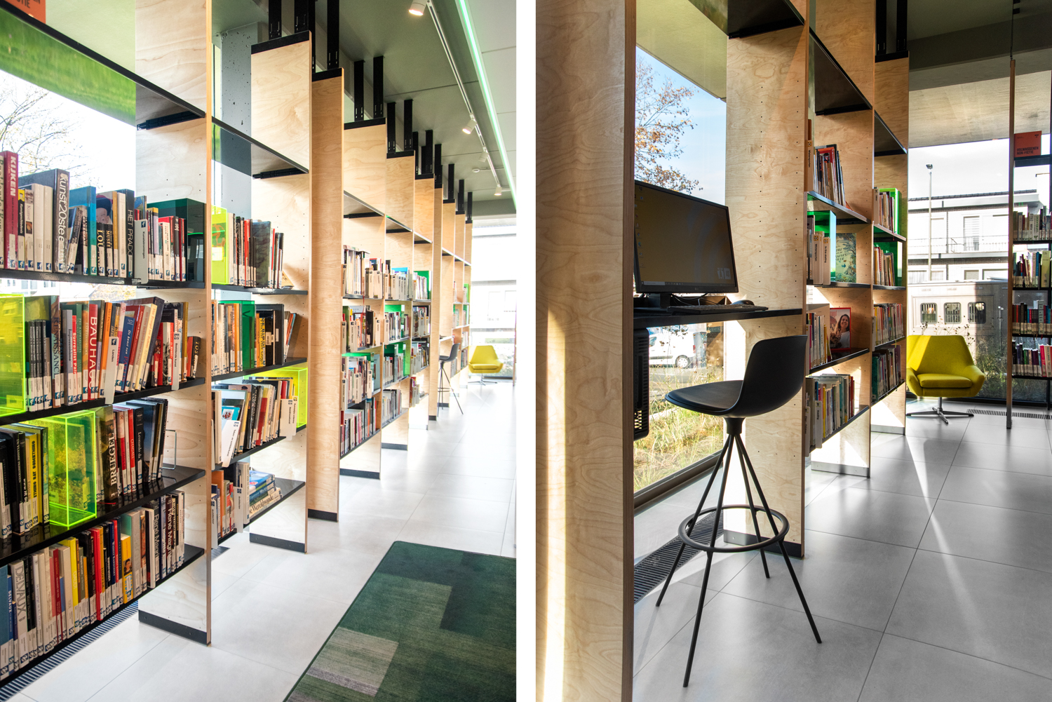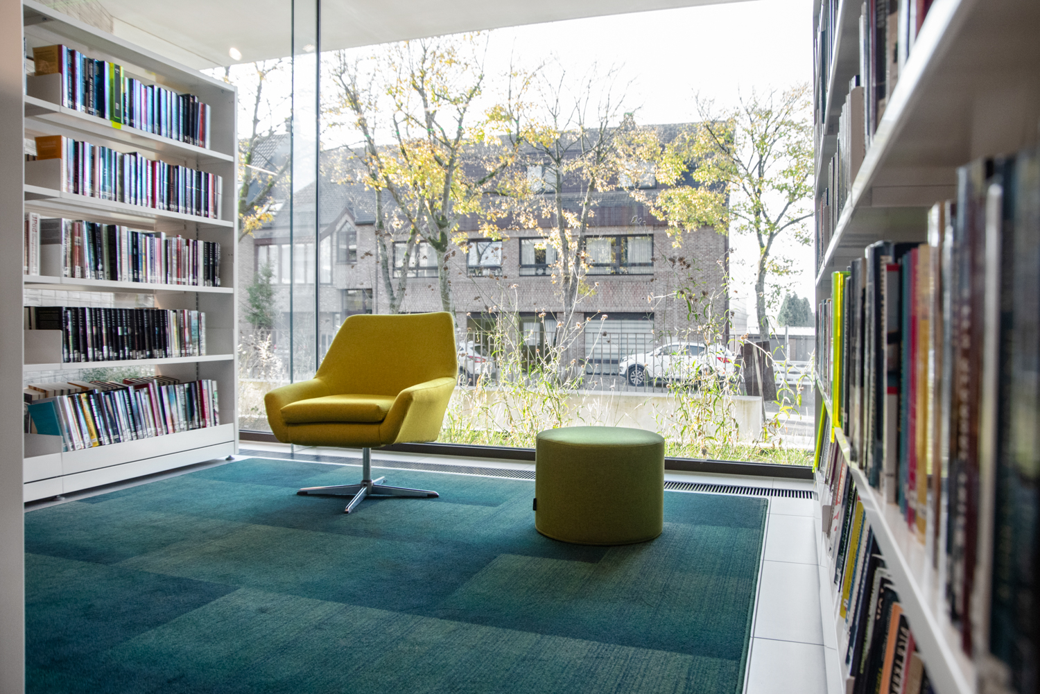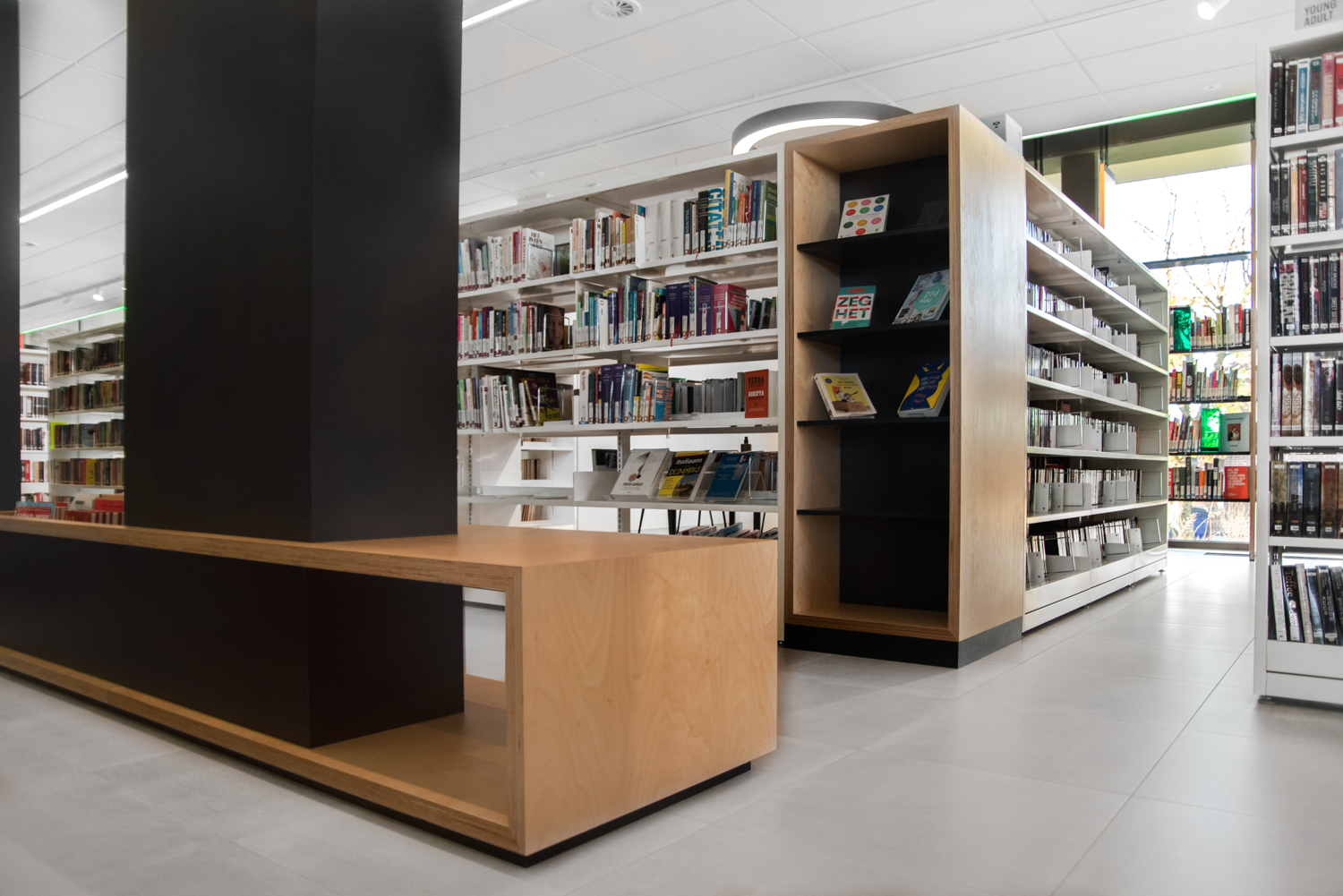 Mitt i den belgiska provinsen Limburg finns detta varma och öppna bibliotek som kännetecknas av massor med ljus och värme. Inredningen kombinerar standard och specialtillverkade biblioteksmöbler.