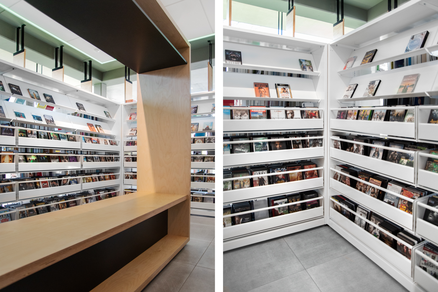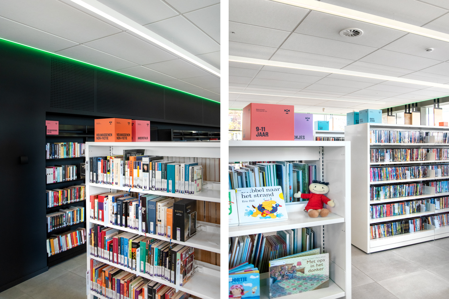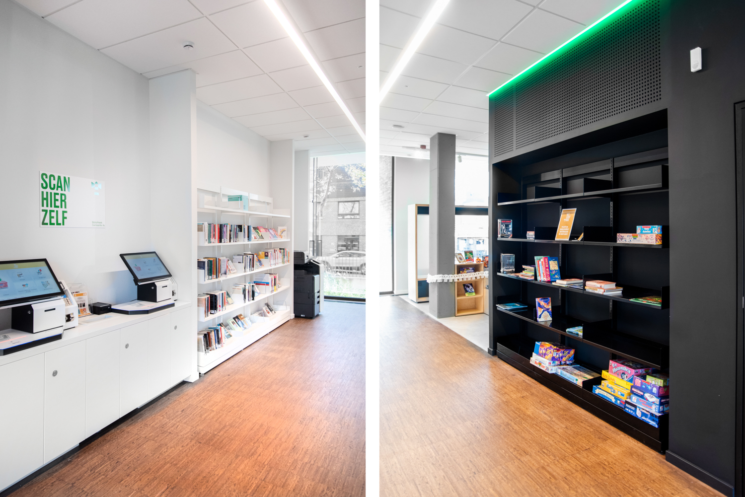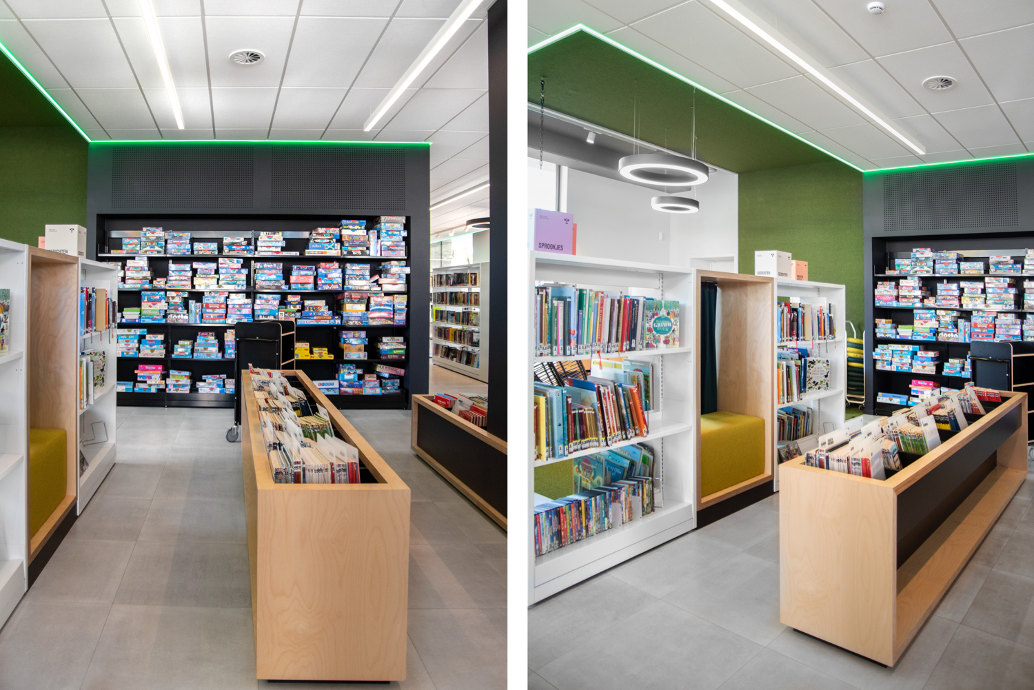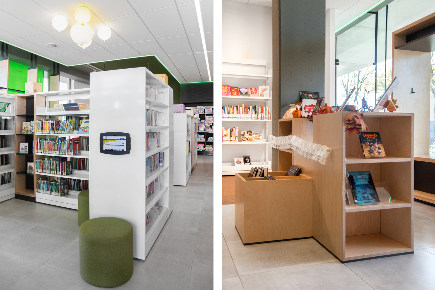 Mitt i den belgiska provinsen Limburg finns detta varma och öppna bibliotek som kännetecknas av massor med ljus och värme. Inredningen kombinerar standard och specialtillverkade biblioteksmöbler.