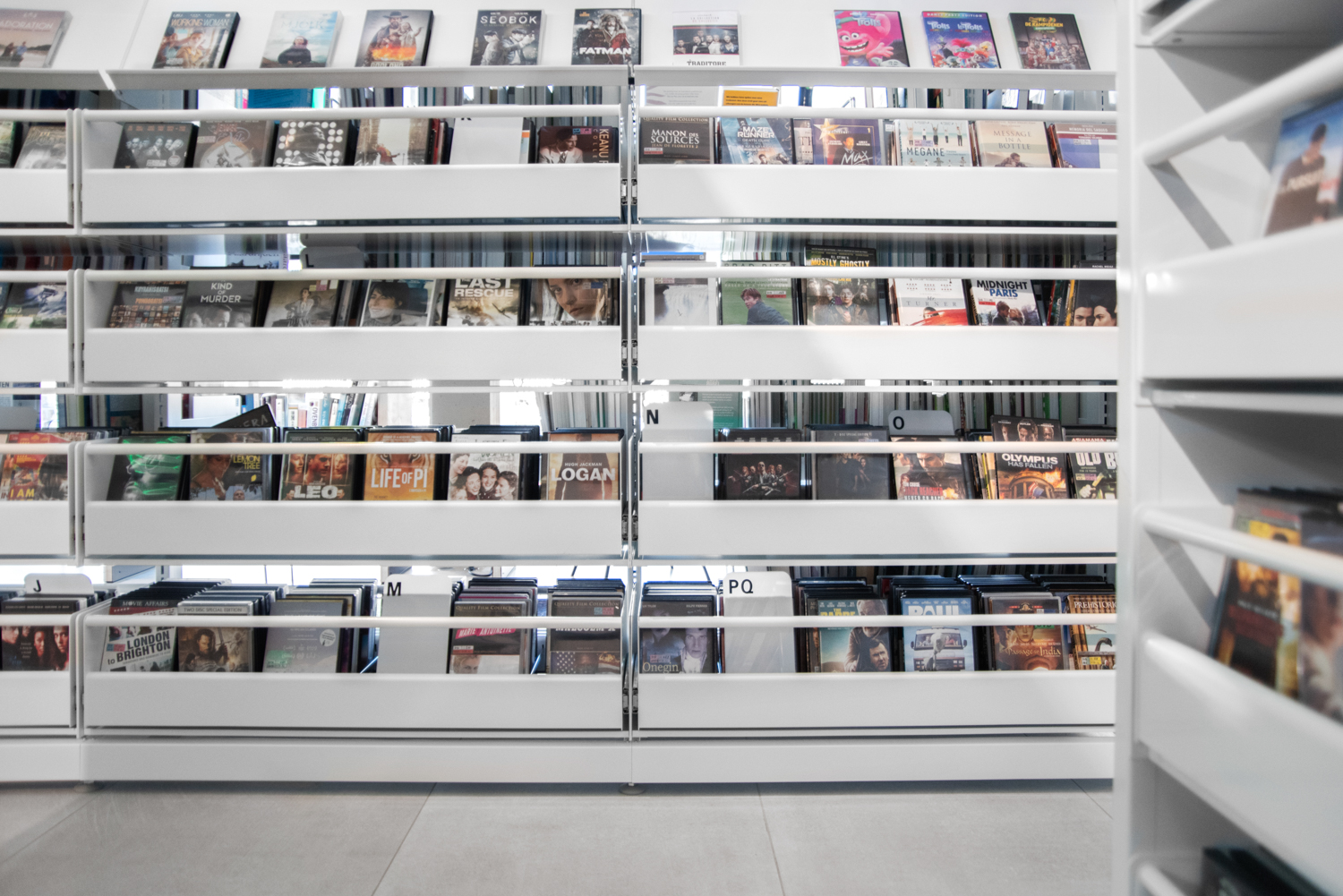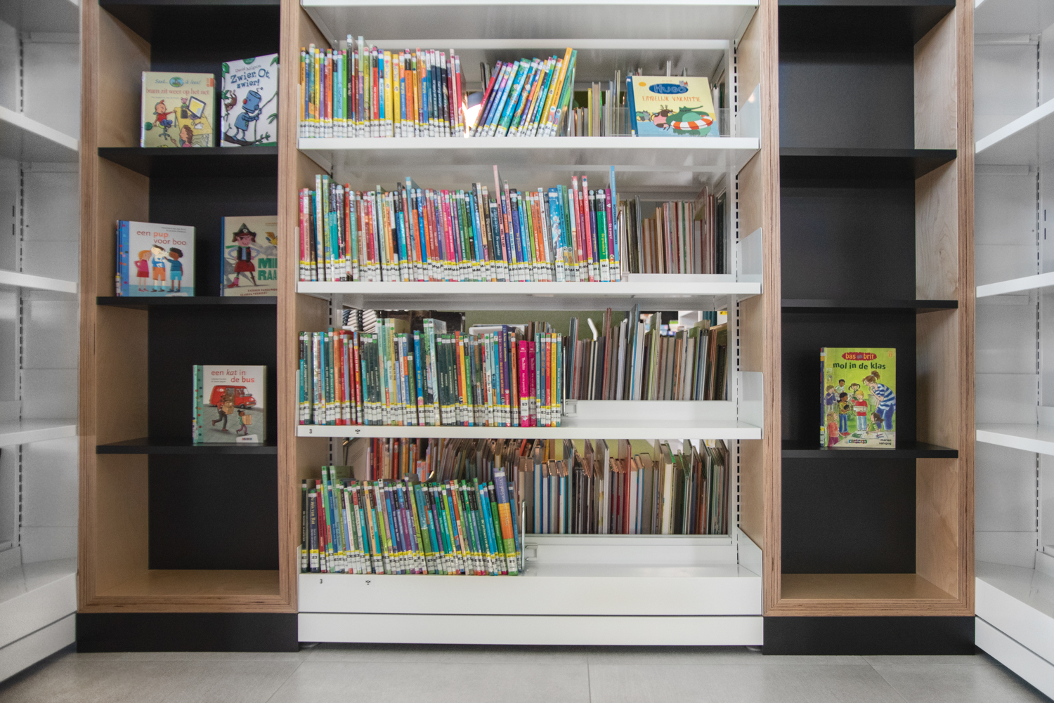 I flera hyllor är den nedersta hyllplanet snedställt så att de lägst placerade böckerna syns tydligare. Samtidigt har det gjorts mycket för att presentera nyheter och teman på flera håll i biblioteket.