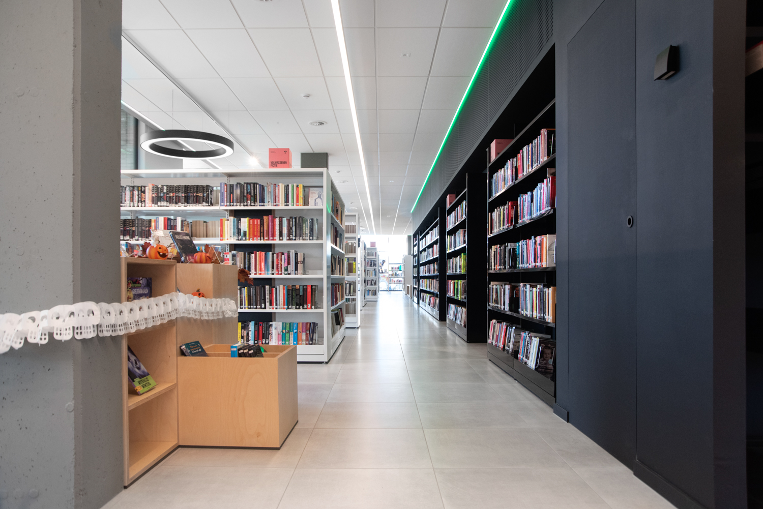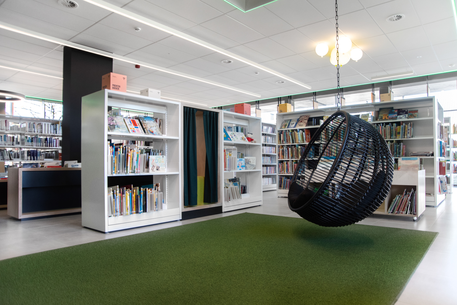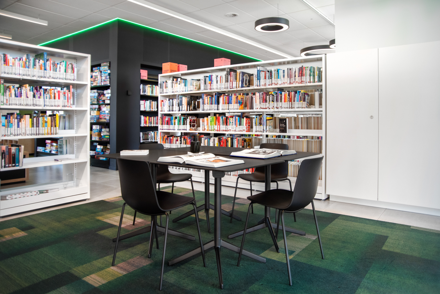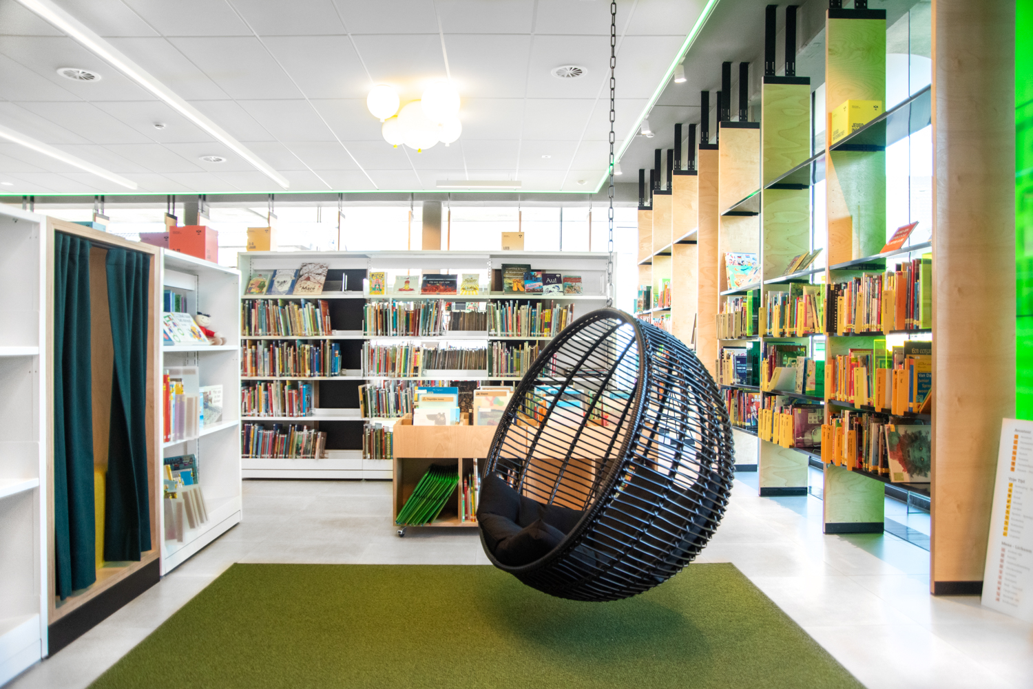 Bibliotekets hyllinredning går i svart och vitt för att dra uppmärksamheten till böckerna, medan de specialtillverkade biblioteksmöblerna tillför värme. De färgglada plastknubbarna bidrar med en frisk fläkt och vackra ljuseffekter i rummet. I biblioteket finns många stora fönster som släpper in dagsljuset.