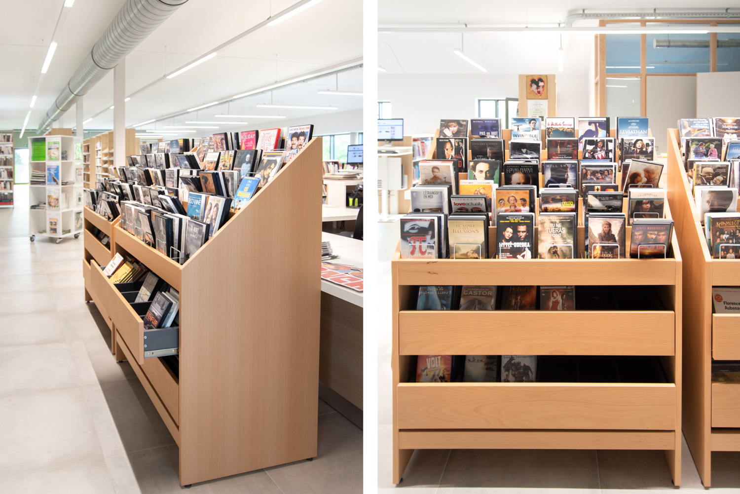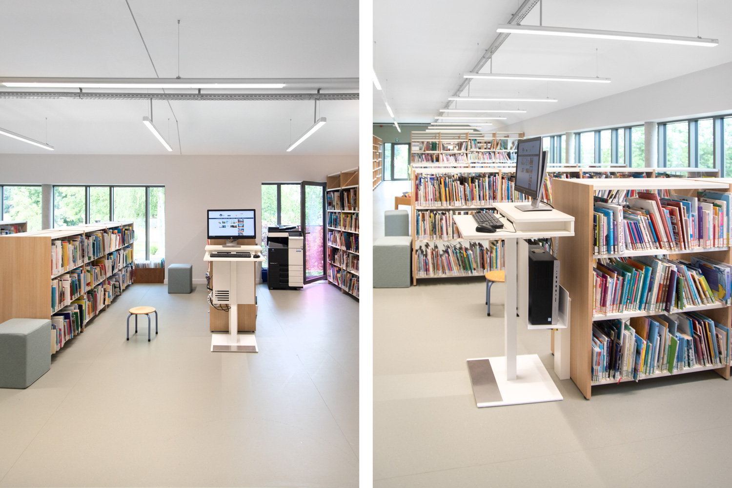 Florenville bibliotek är en del av ett kommunalt projekt med målet att samla olika aktörer i samma byggnad. Vid ingången står en stor disk som är lättillgänglig för besökare med nedsatt rörlighet. Hyllinredningen i trä framstår som elegant i kombination med de färgglada sittmöblerna.