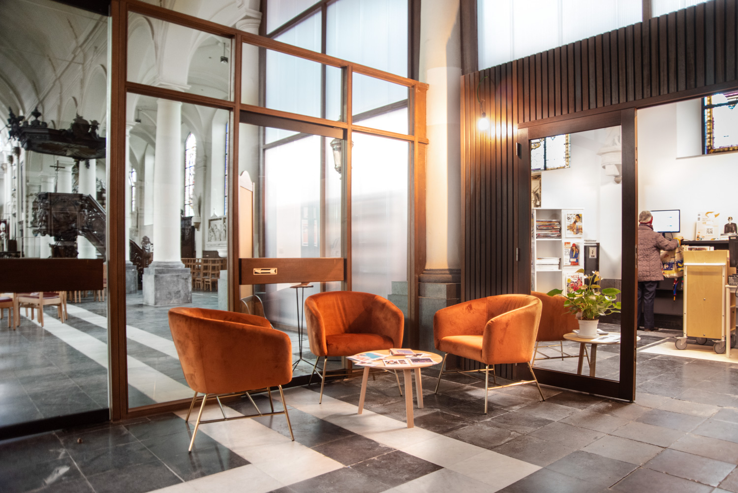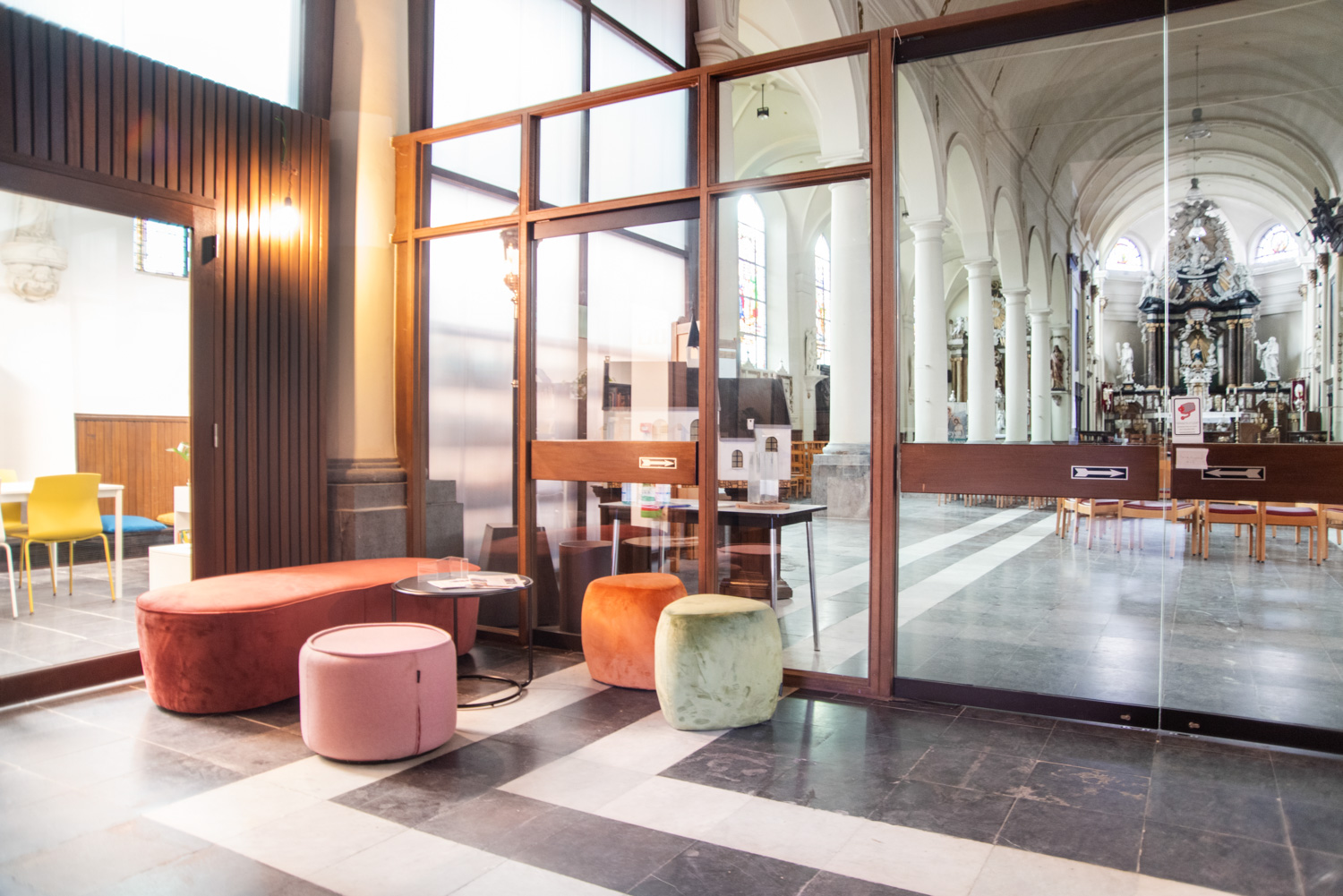 Rummen är smakfullt inredda med respekt för byggnaden: valven har bevarats och det karakteristiska, flödande ljuset från de stora glasmålningarna som är typiska för en kyrka bevaras genom glasväggar som skiljer biblioteket från de kyrkliga aktiviteterna.