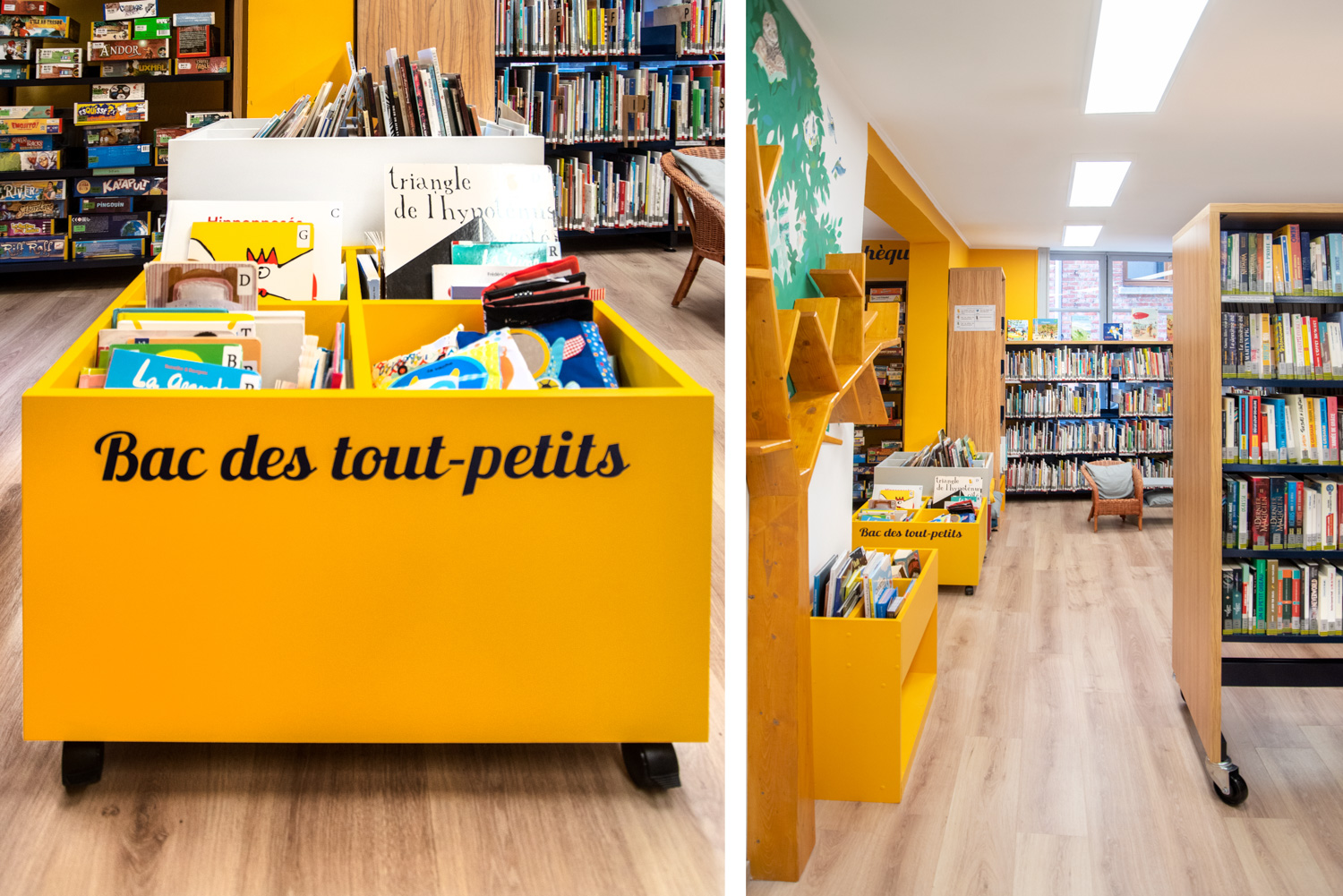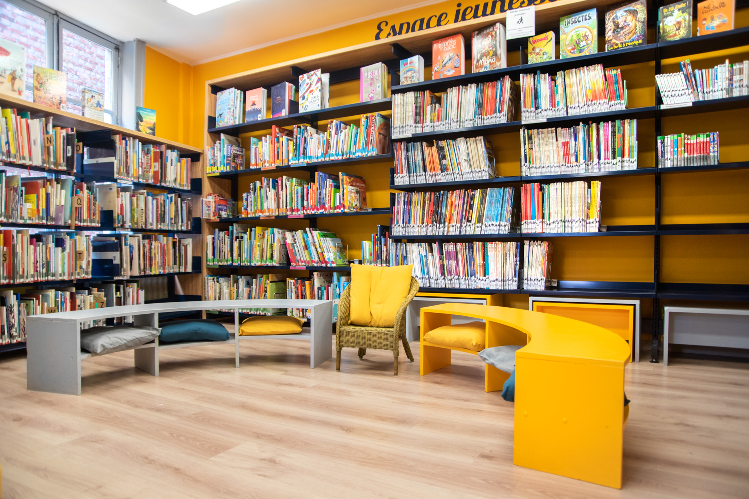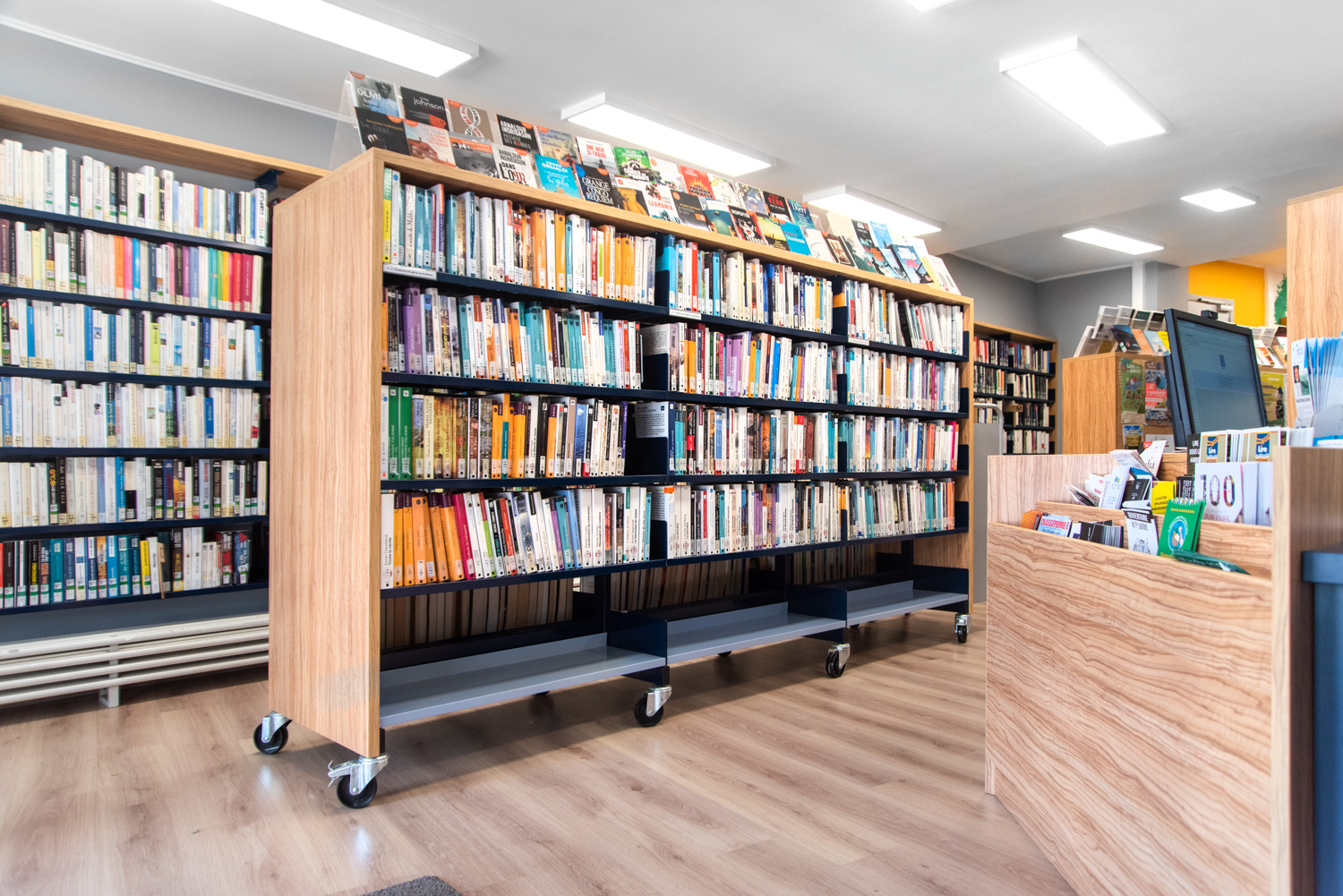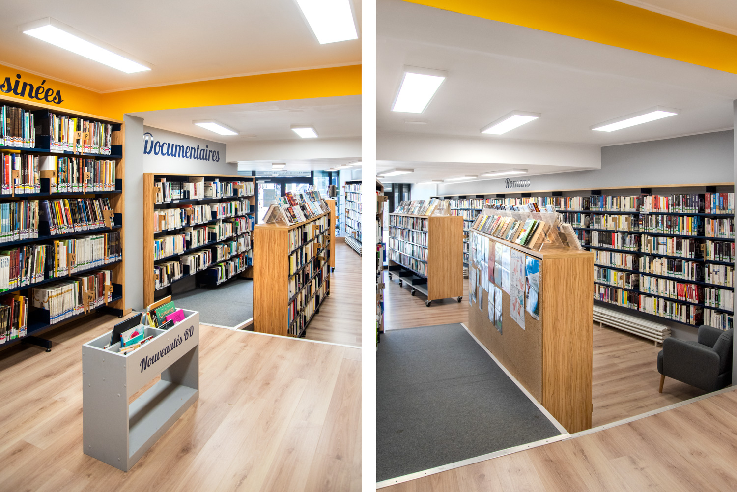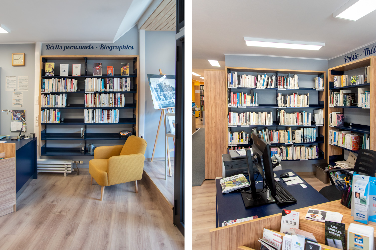 Detta säger bibliotekarien Noëlle Willem. I samarbete med sitt team har hon utnyttjat rummet och gjort biblioteksinredningen till en fröjd för ögat som gör att fler får lust att besöka biblioteket samtidigt som de lättare finner biblioteksmaterialen. Färgvalet är modernt och materialvalet i trä och metall hållbart.