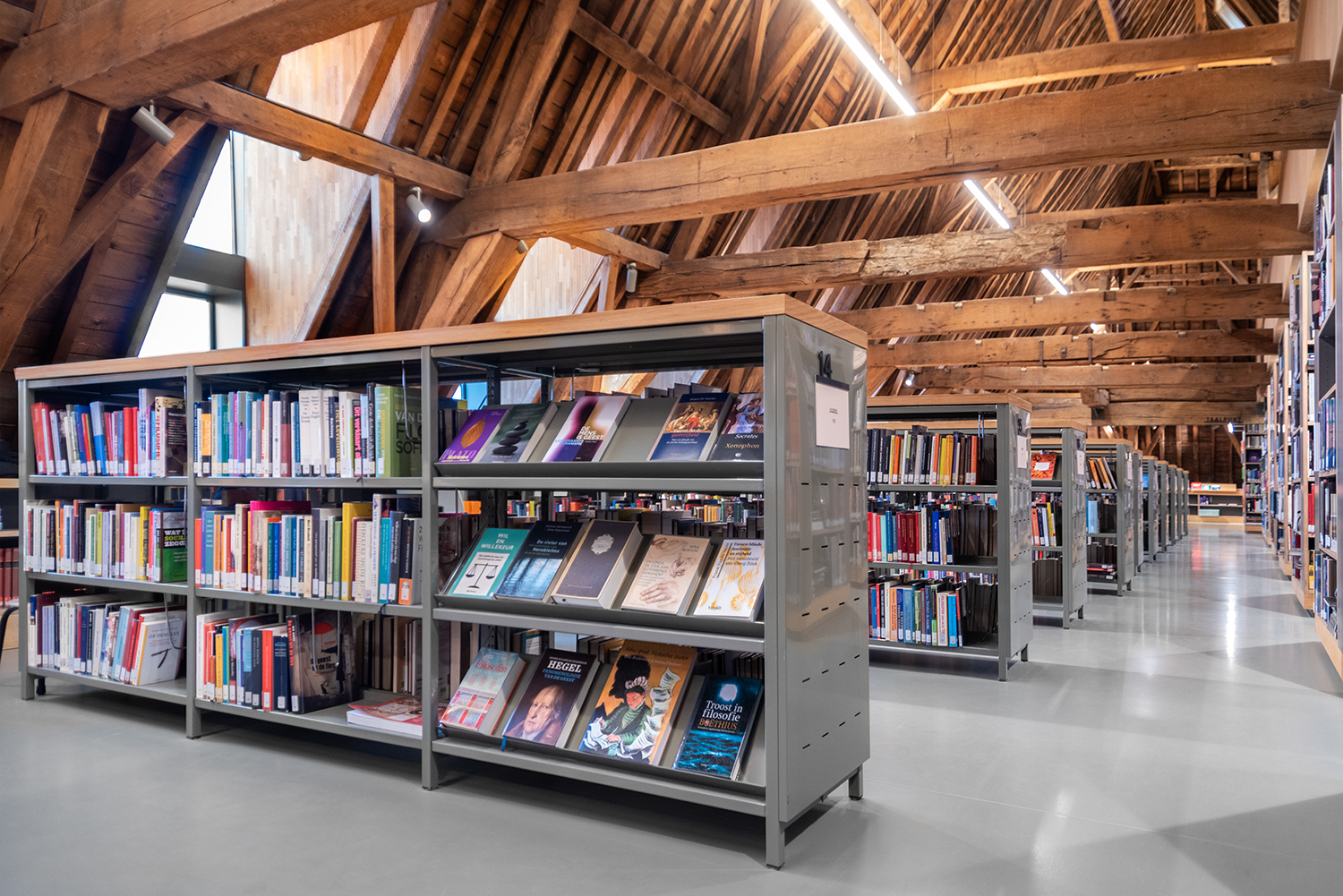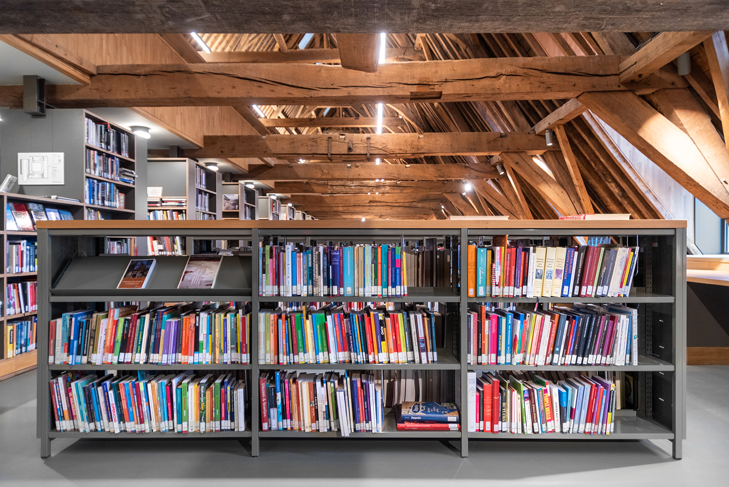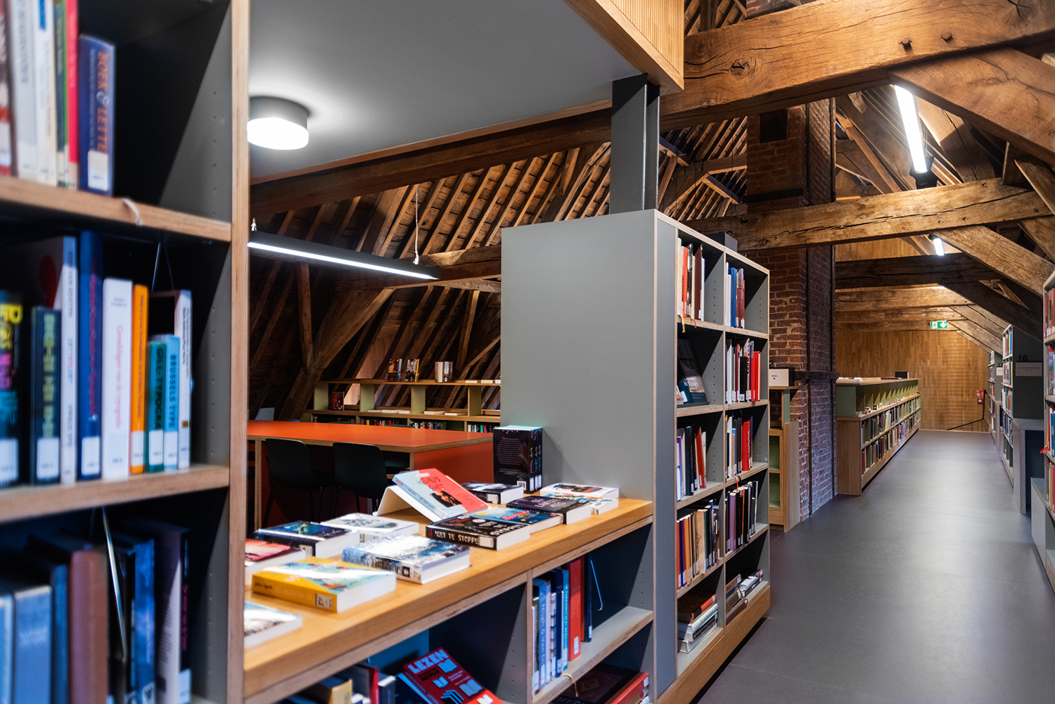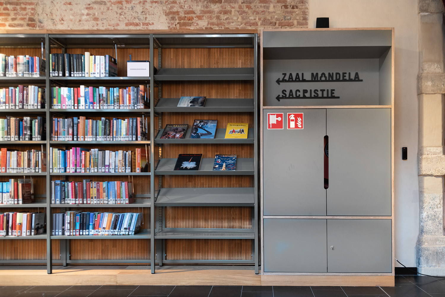 Böckerna är uppställda med framsidorna utåt i låga hyllor, och samlingen följer byggnadens konturer. Biblioteksinredningen är en blandning av specialtillverkning och standardmöbler, hela tiden syftande till ett hållbart utförande. Het Predikheren är med andra ord redo för ett nytt kapitel i sin historia.