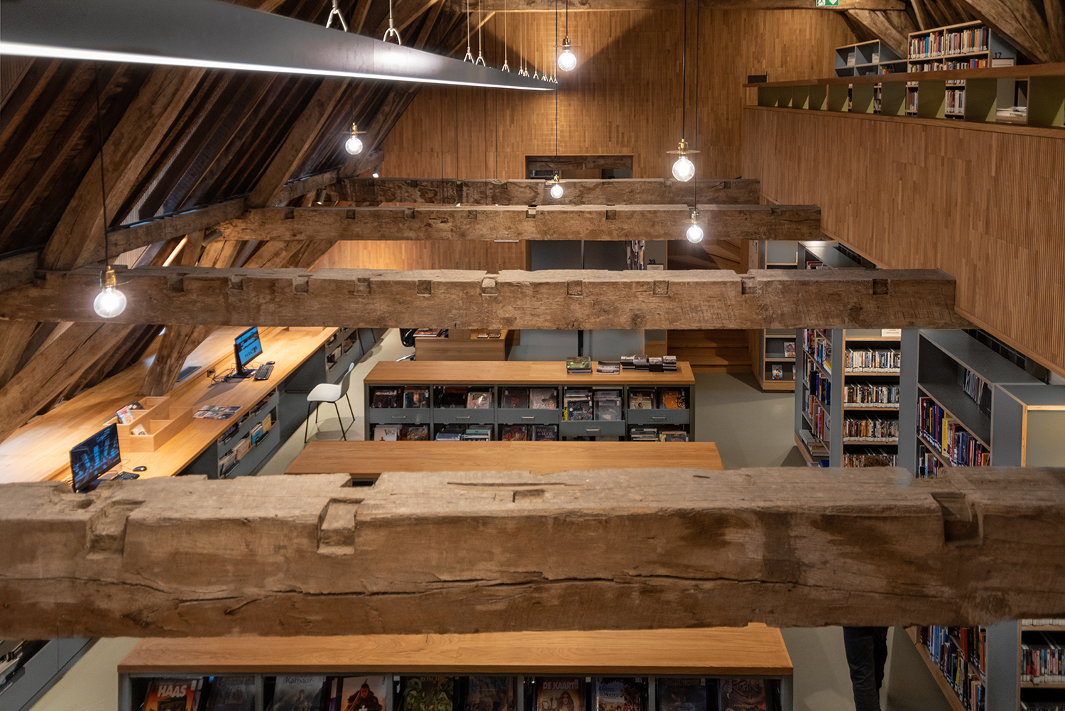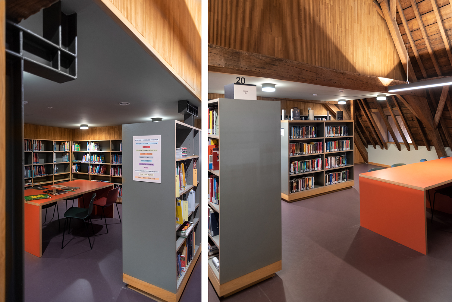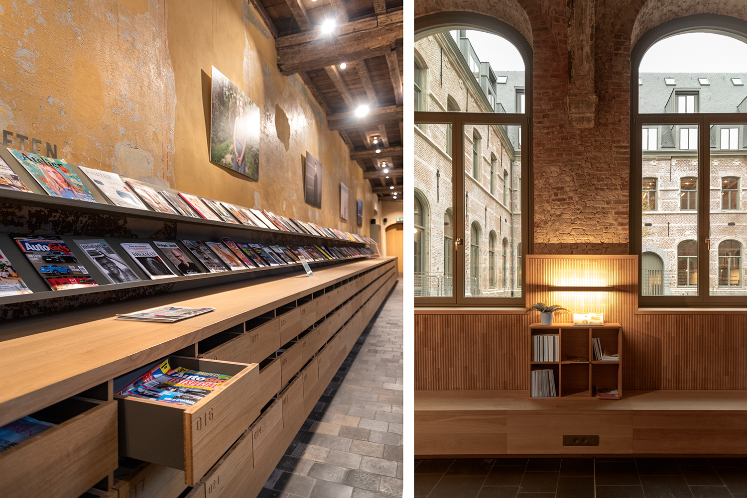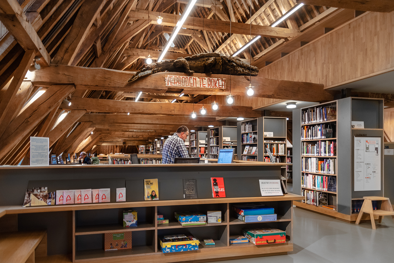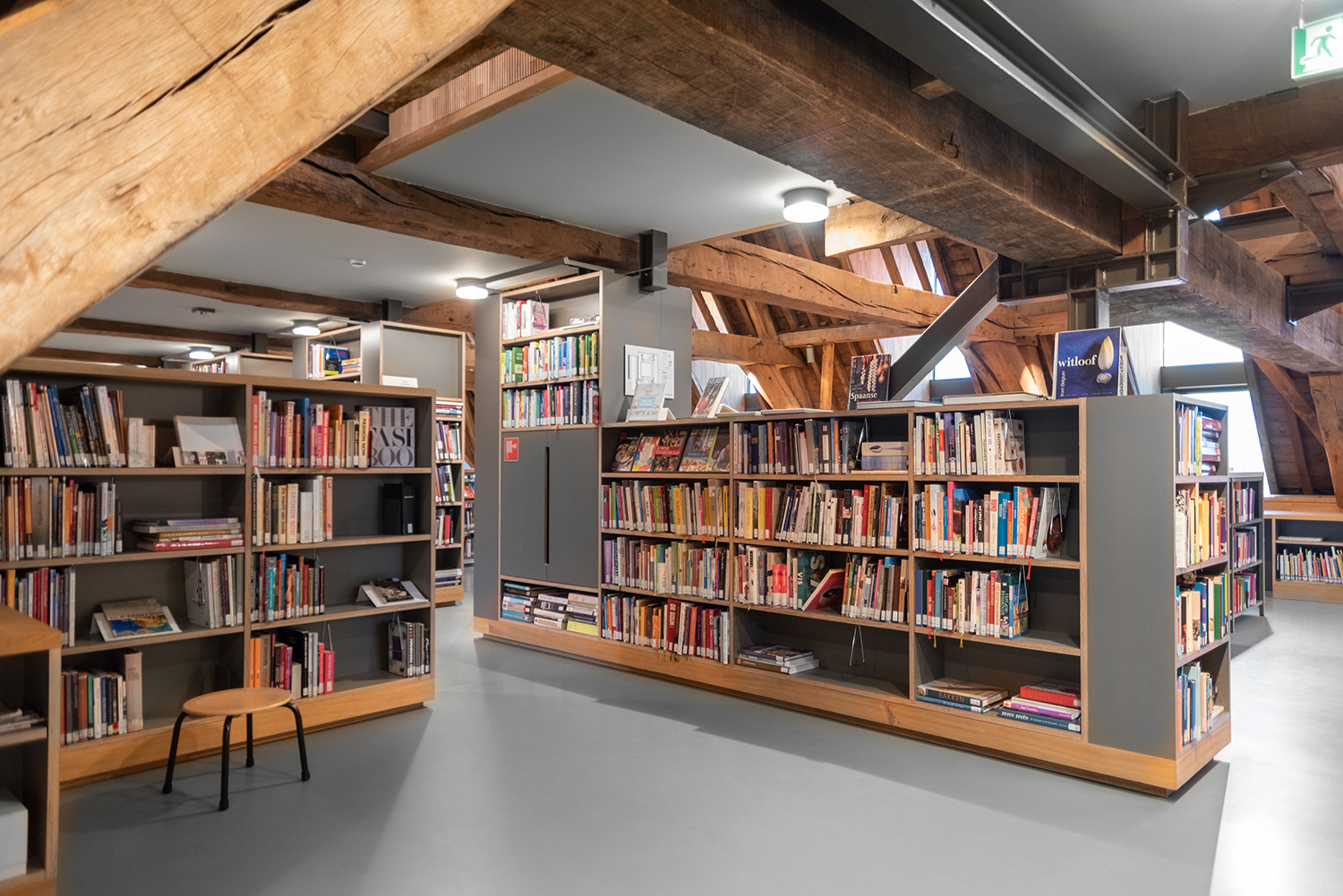 Böckerna är uppställda med framsidorna utåt i låga hyllor, och samlingen följer byggnadens konturer. Biblioteksinredningen är en blandning av specialtillverkning och standardmöbler, hela tiden syftande till ett hållbart utförande. Het Predikheren är med andra ord redo för ett nytt kapitel i sin historia.