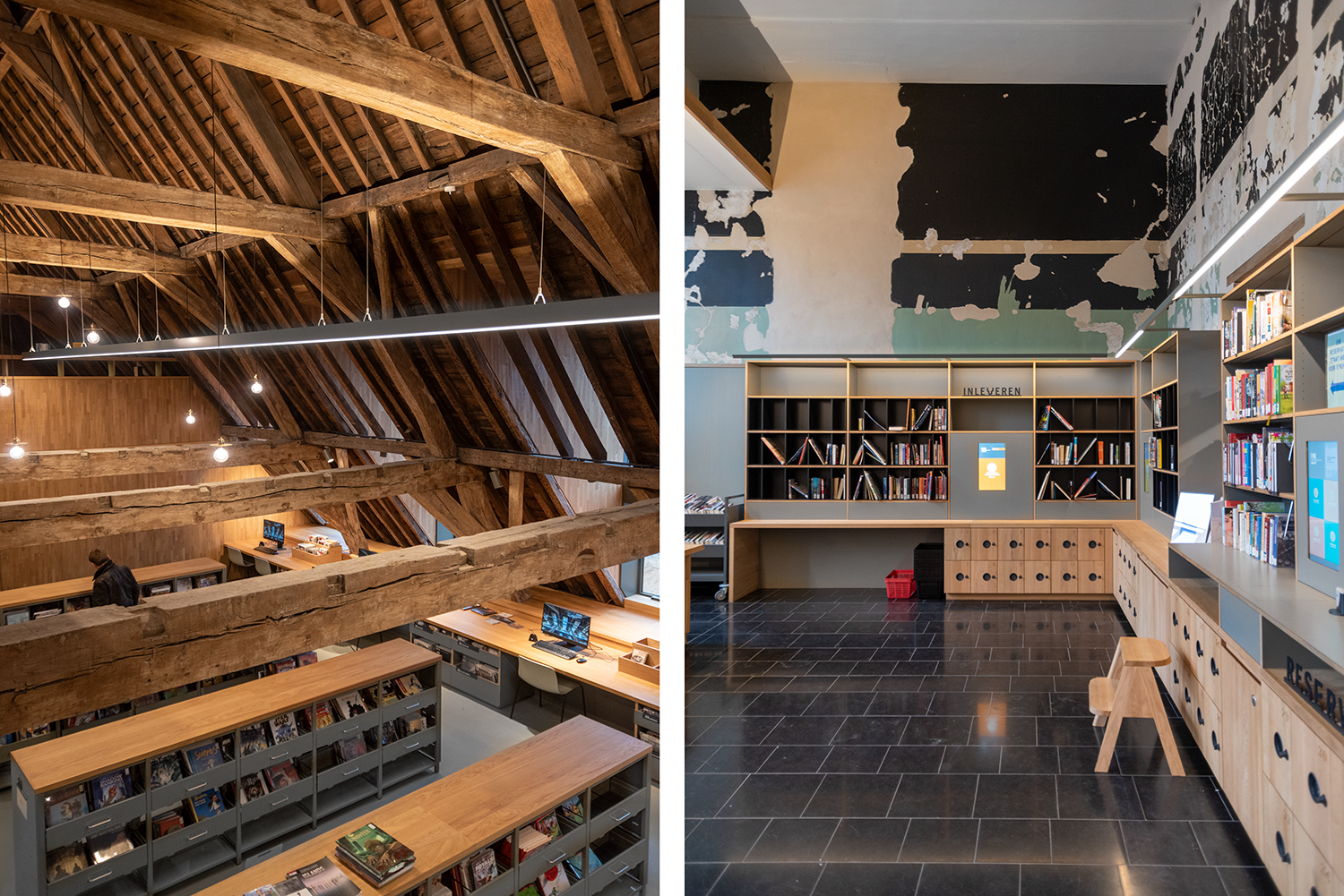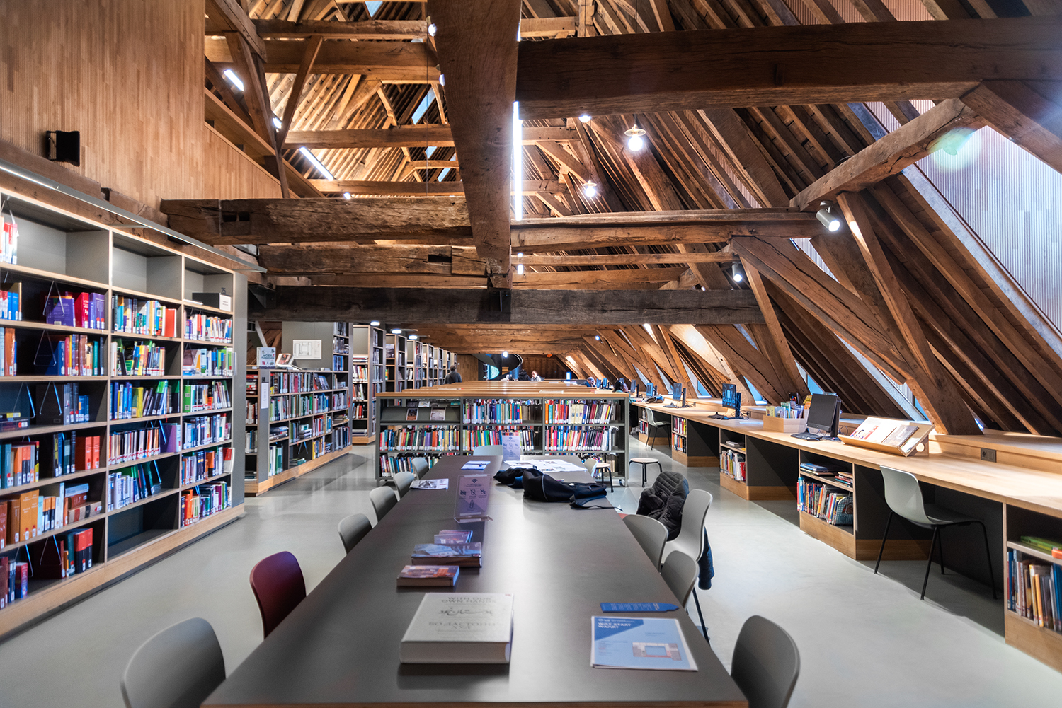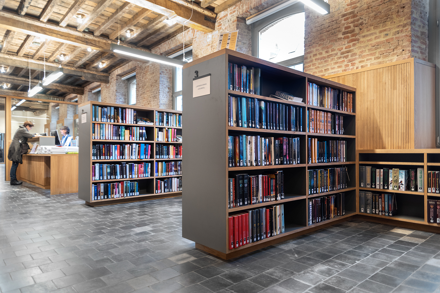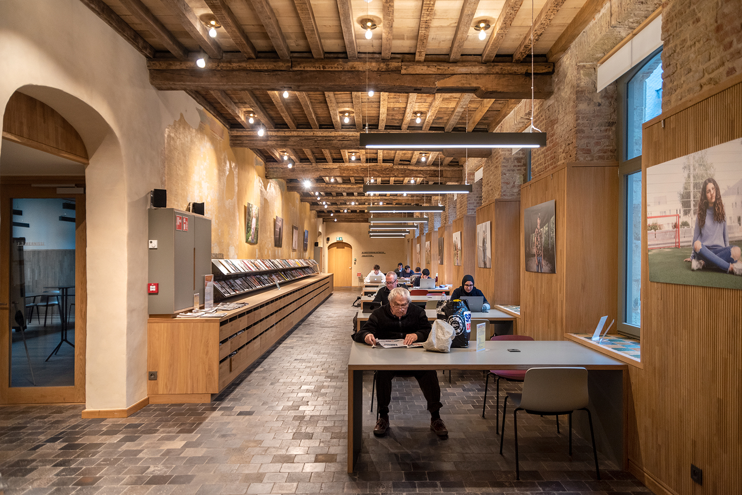 Böckerna är uppställda med framsidorna utåt i låga hyllor, och samlingen följer byggnadens konturer. Biblioteksinredningen är en blandning av specialtillverkning och standardmöbler, hela tiden syftande till ett hållbart utförande. Het Predikheren är med andra ord redo för ett nytt kapitel i sin historia.