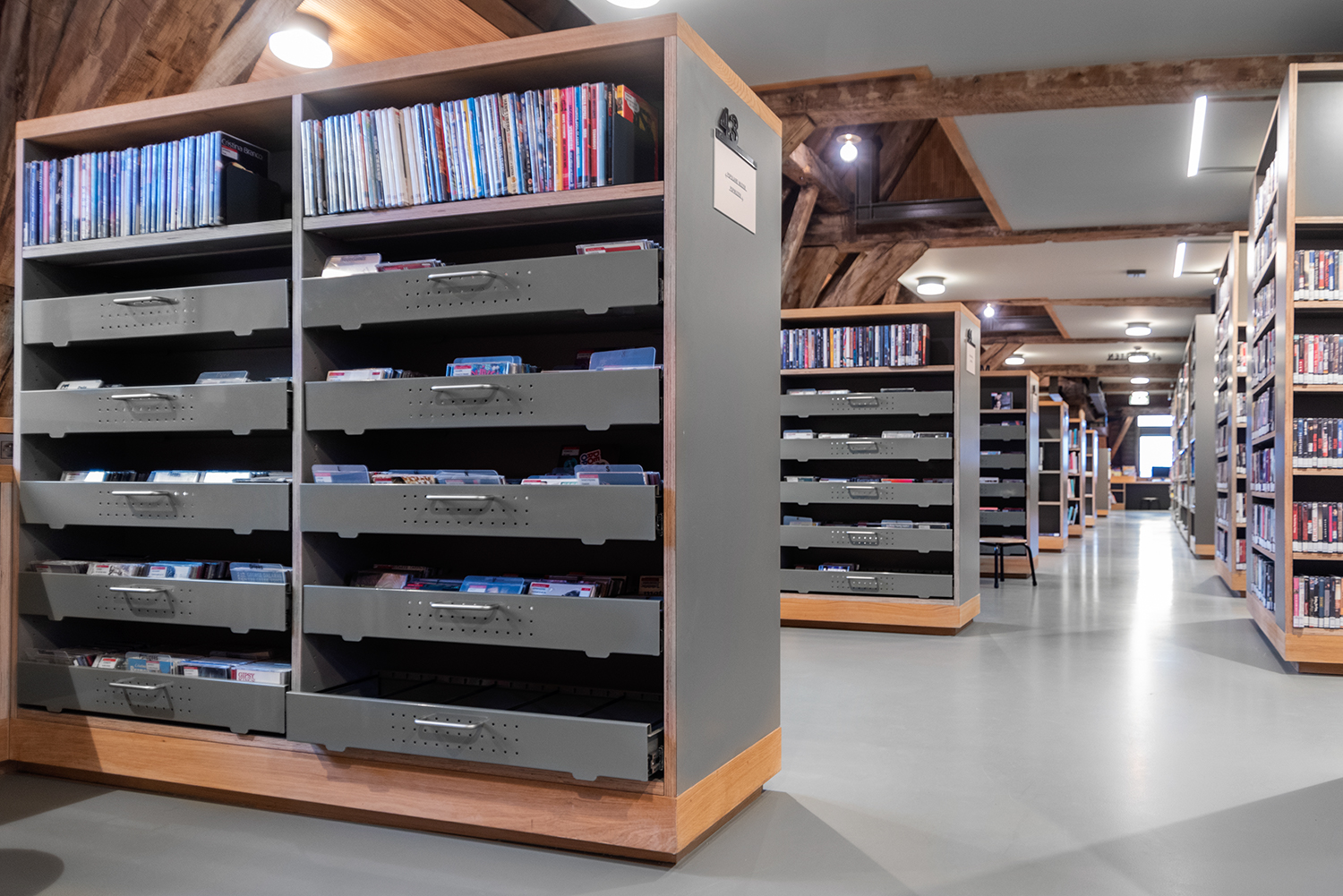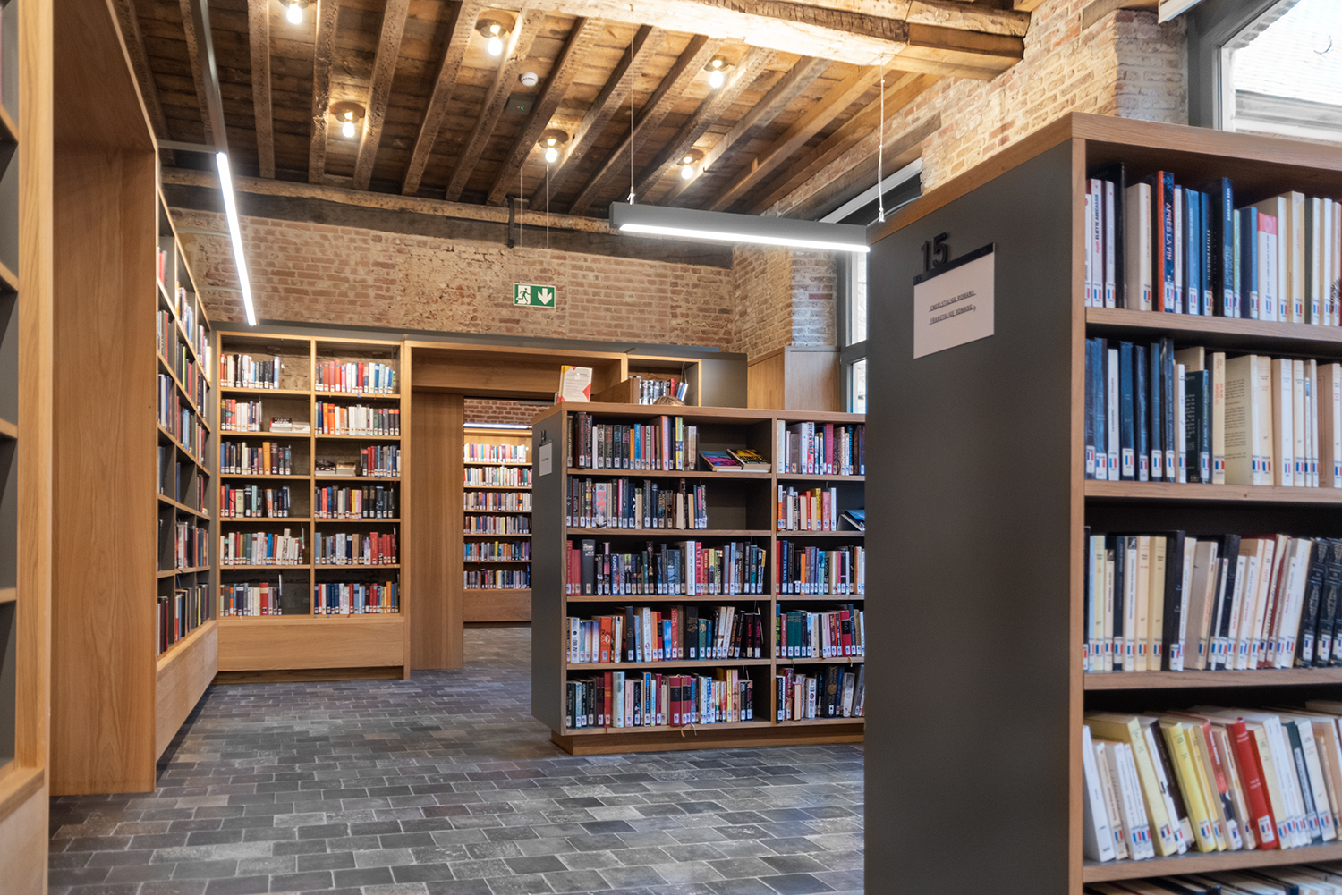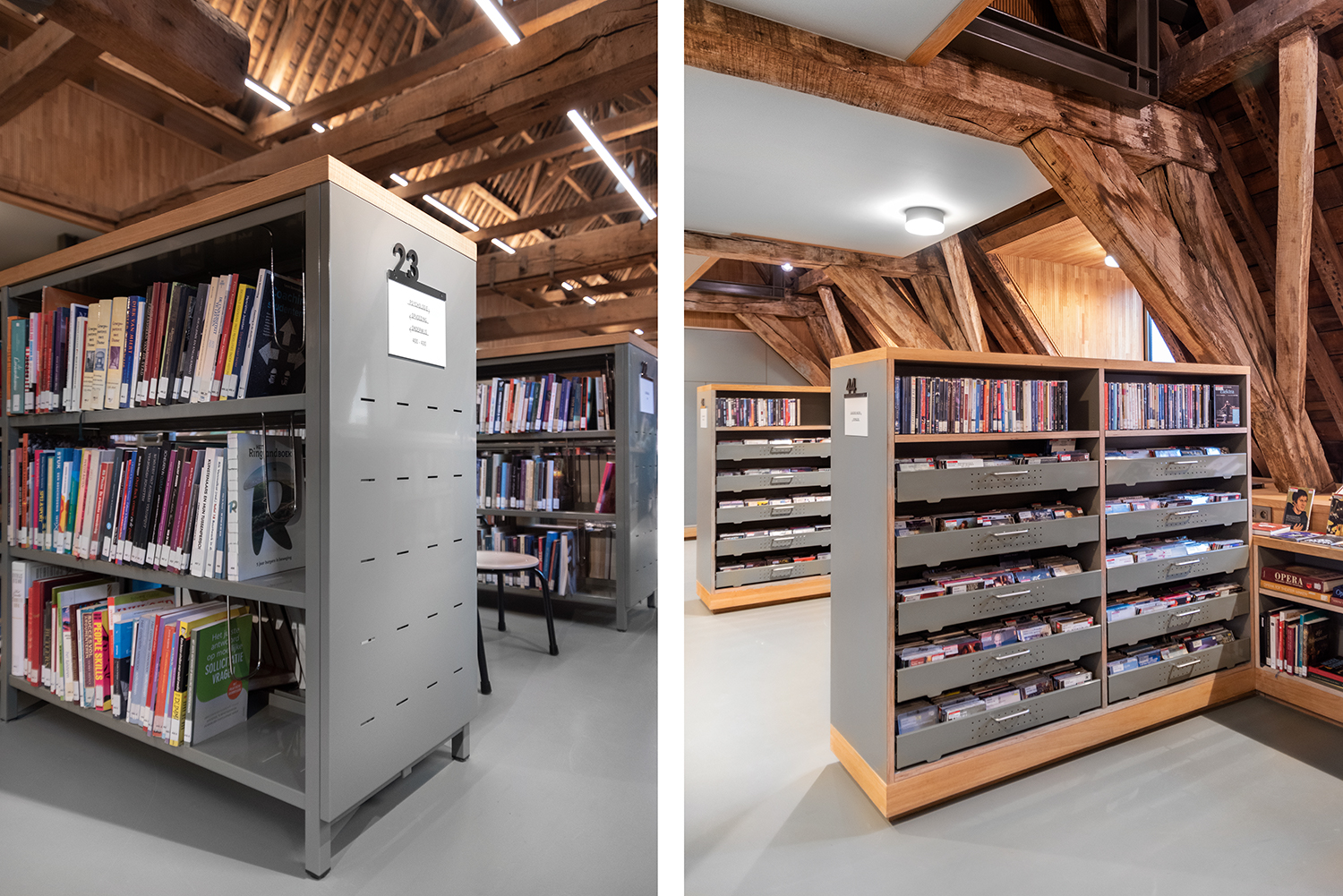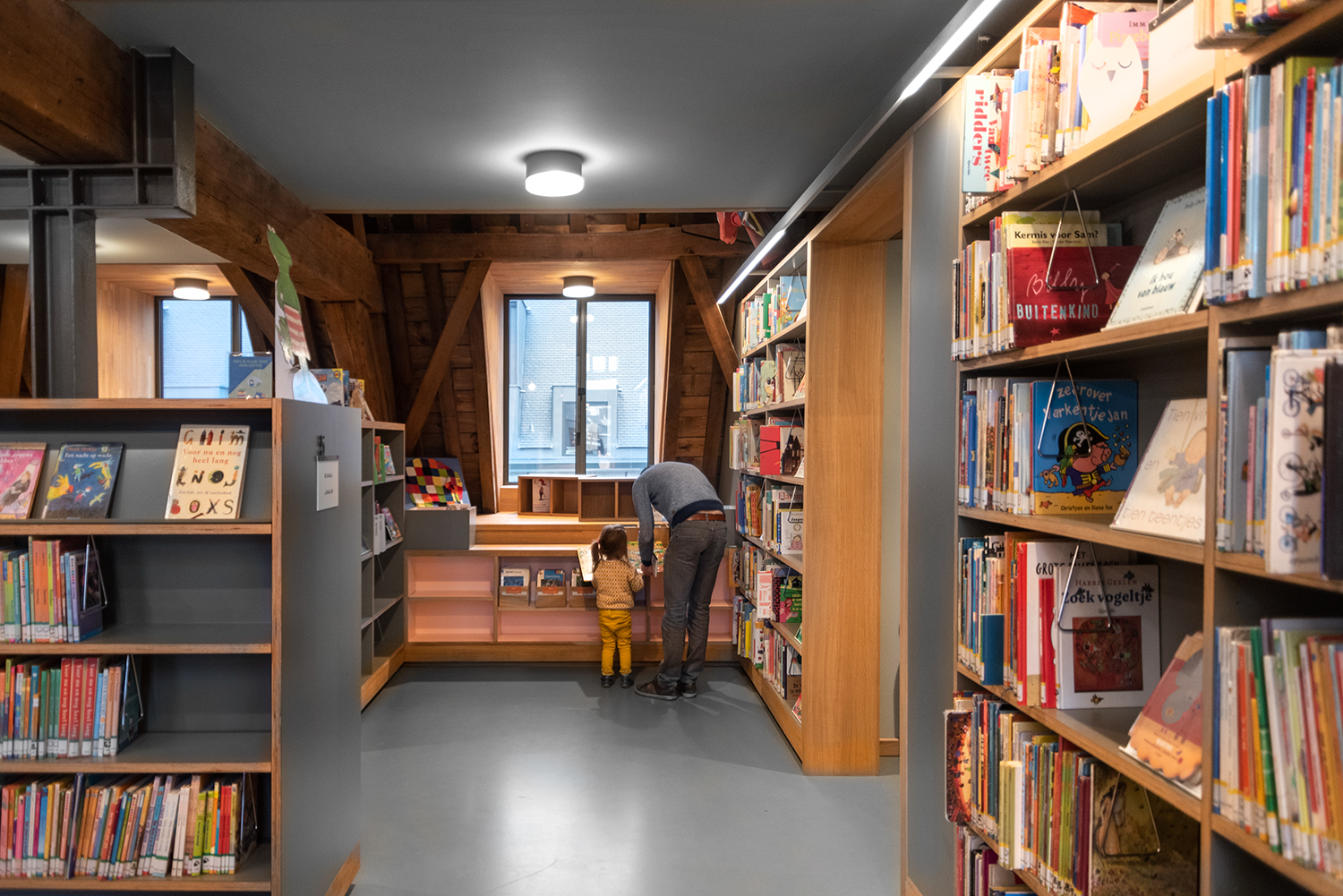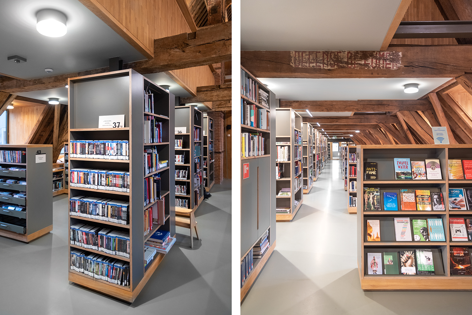 Böckerna är uppställda med framsidorna utåt i låga hyllor, och samlingen följer byggnadens konturer. Biblioteksinredningen är en blandning av specialtillverkning och standardmöbler, hela tiden syftande till ett hållbart utförande. Het Predikheren är med andra ord redo för ett nytt kapitel i sin historia.