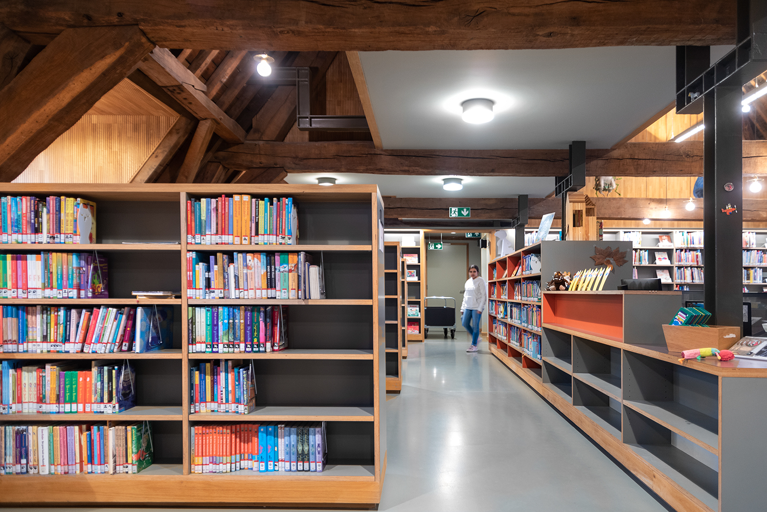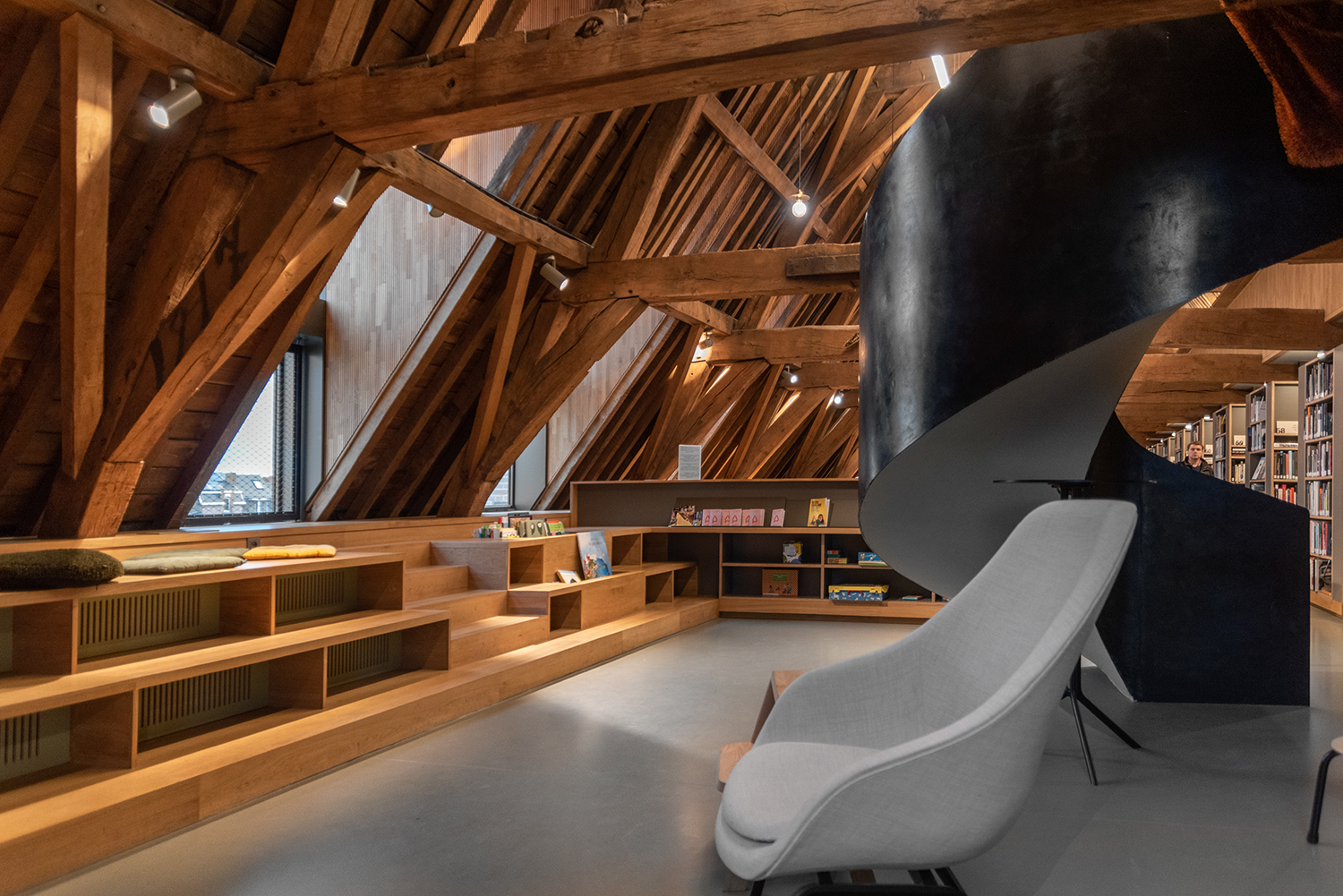 Barn- och ungdomsbiblioteket finns på vinden. En unik plats där de ursprungliga ekbjälkarna fortfarande är en del av takkonstruktionen. Träets värme omfamnar besökarna och fortsätter i inredningen. En idealisk plats för ungdomar att botanisera bland böckerna.
