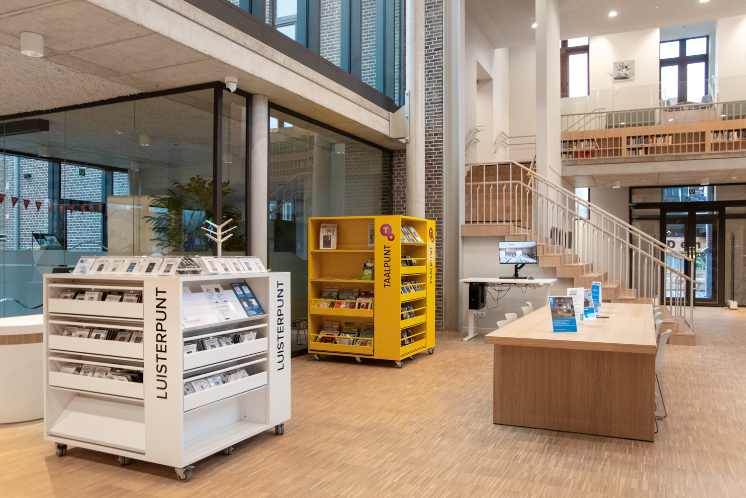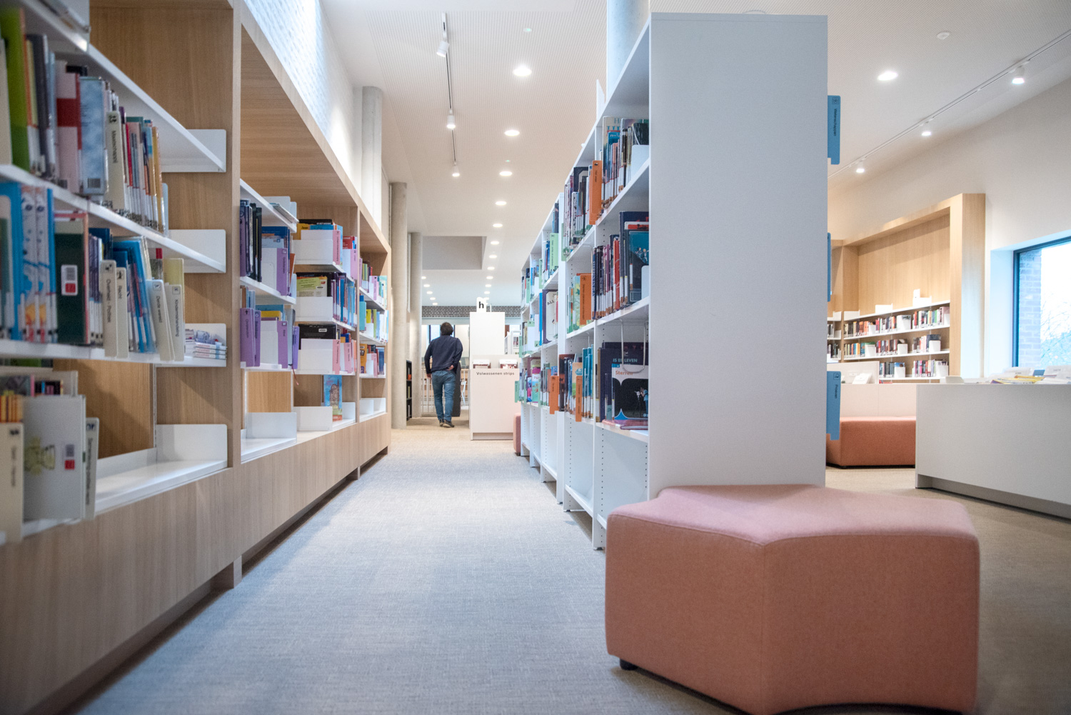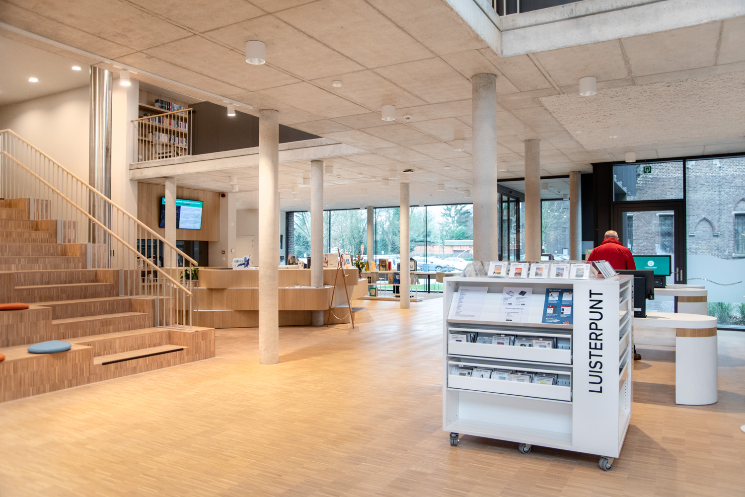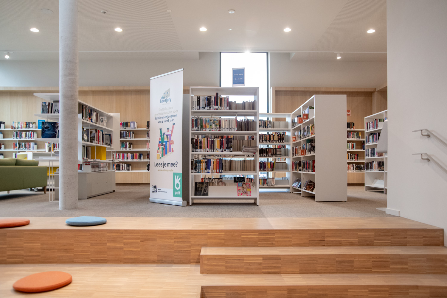 Välkommen till biblioteket i Pelt, som är en del av det mångsidiga och moderna Stroming-centret. När besökarna kommer in i biblioteket märker de genast den rymliga atmosfären med massor av dagsljus som strömmar in genom stora fönsterpartier. Användningen av träparkett och synlig betong skapar en modern och inbjudande estetik. Specialdesignade möbler och hyllsystemet Lingo i vitt bildar en neutral bakgrund som framhäver böckerna.