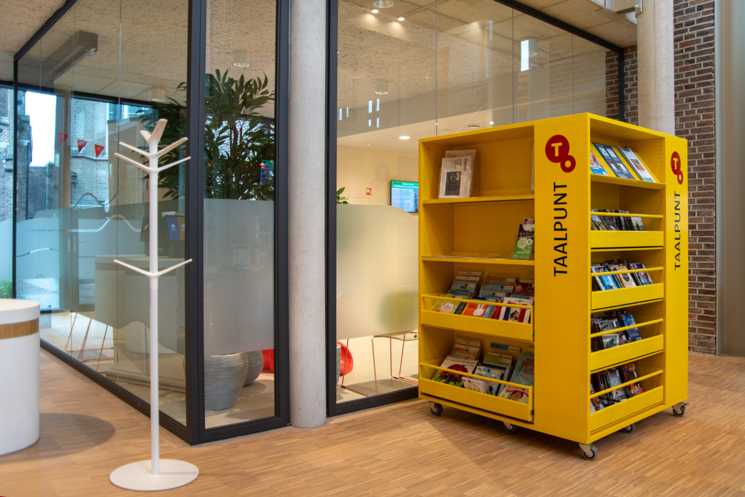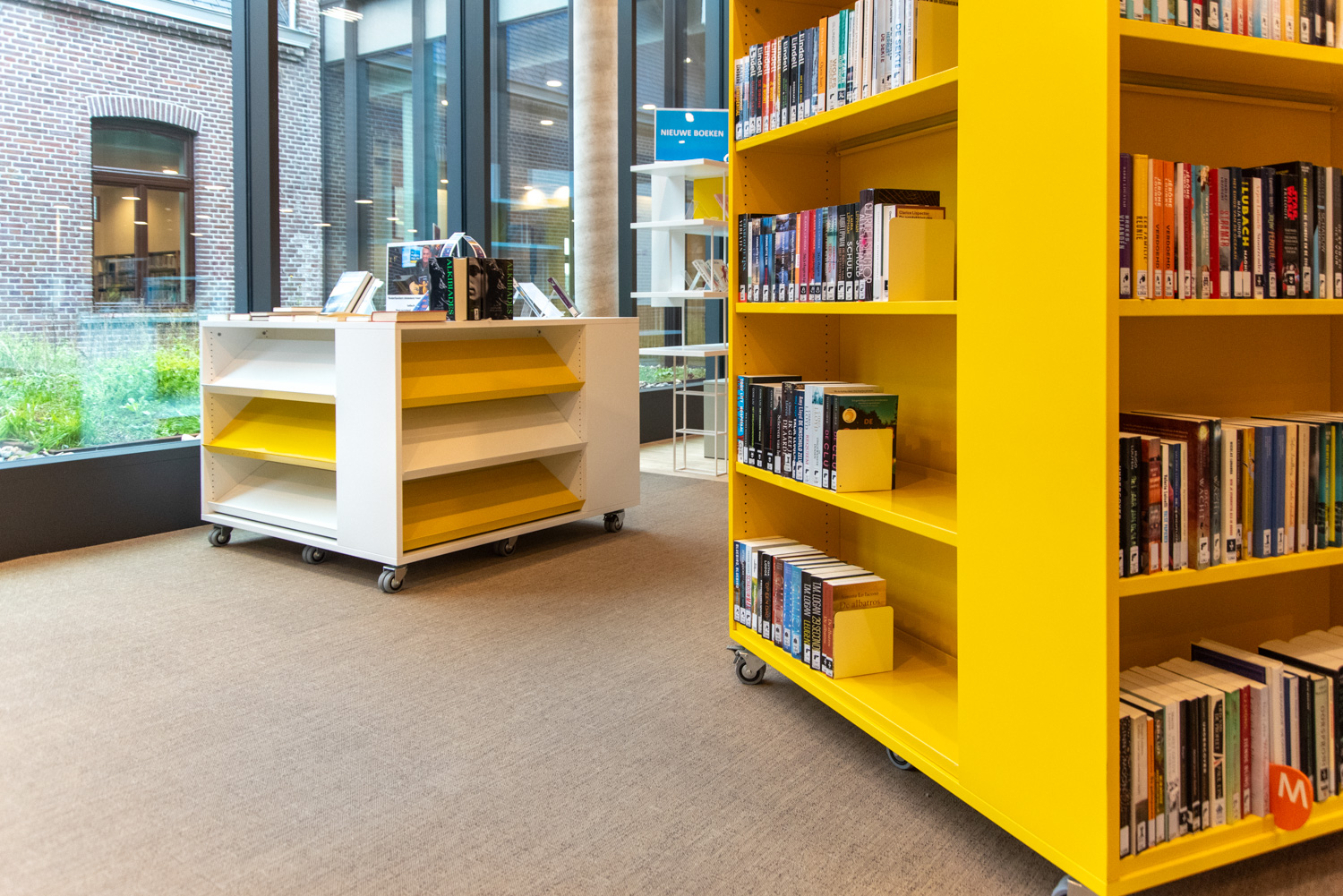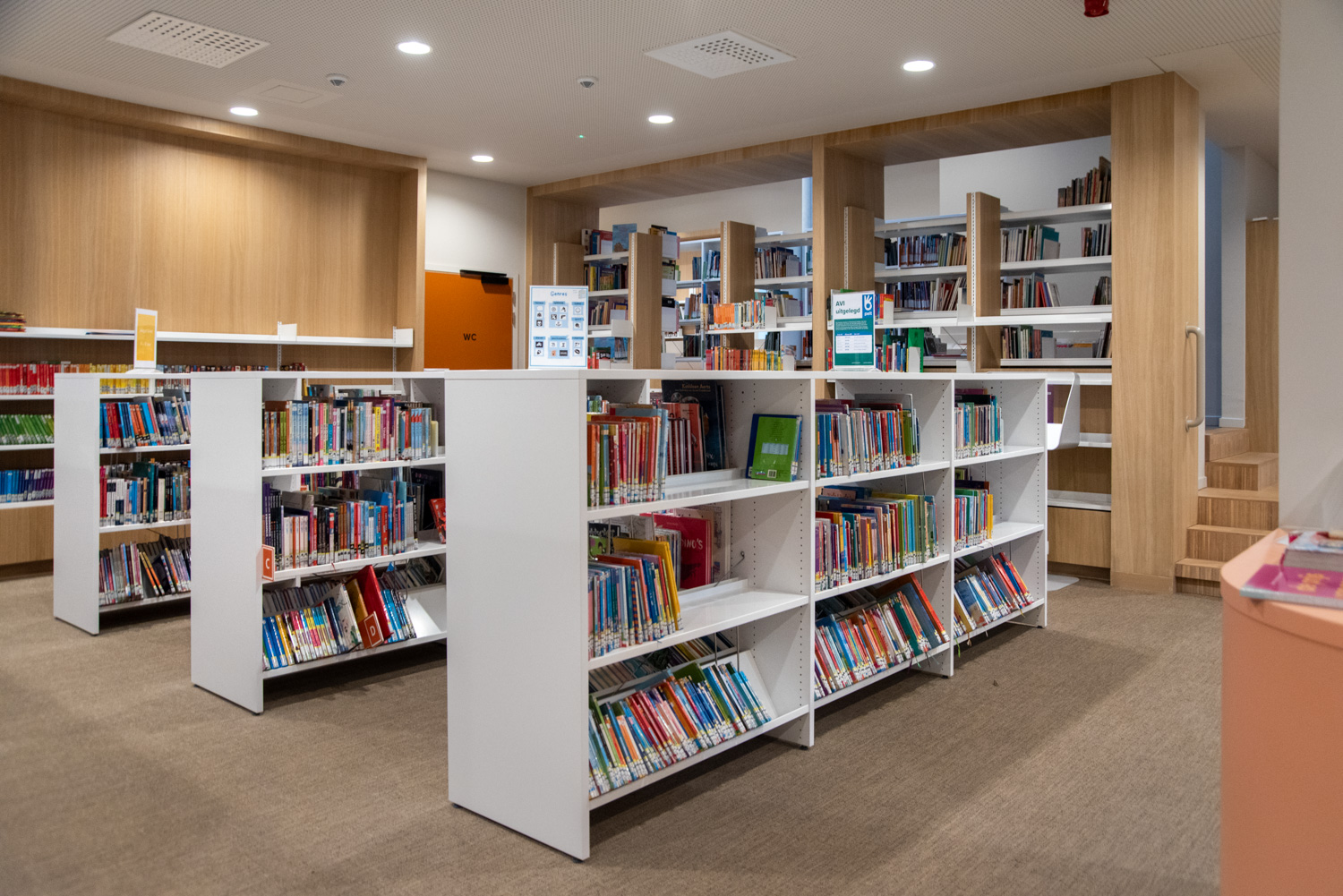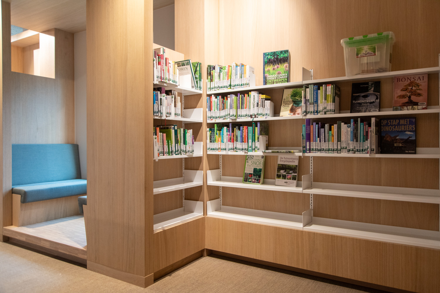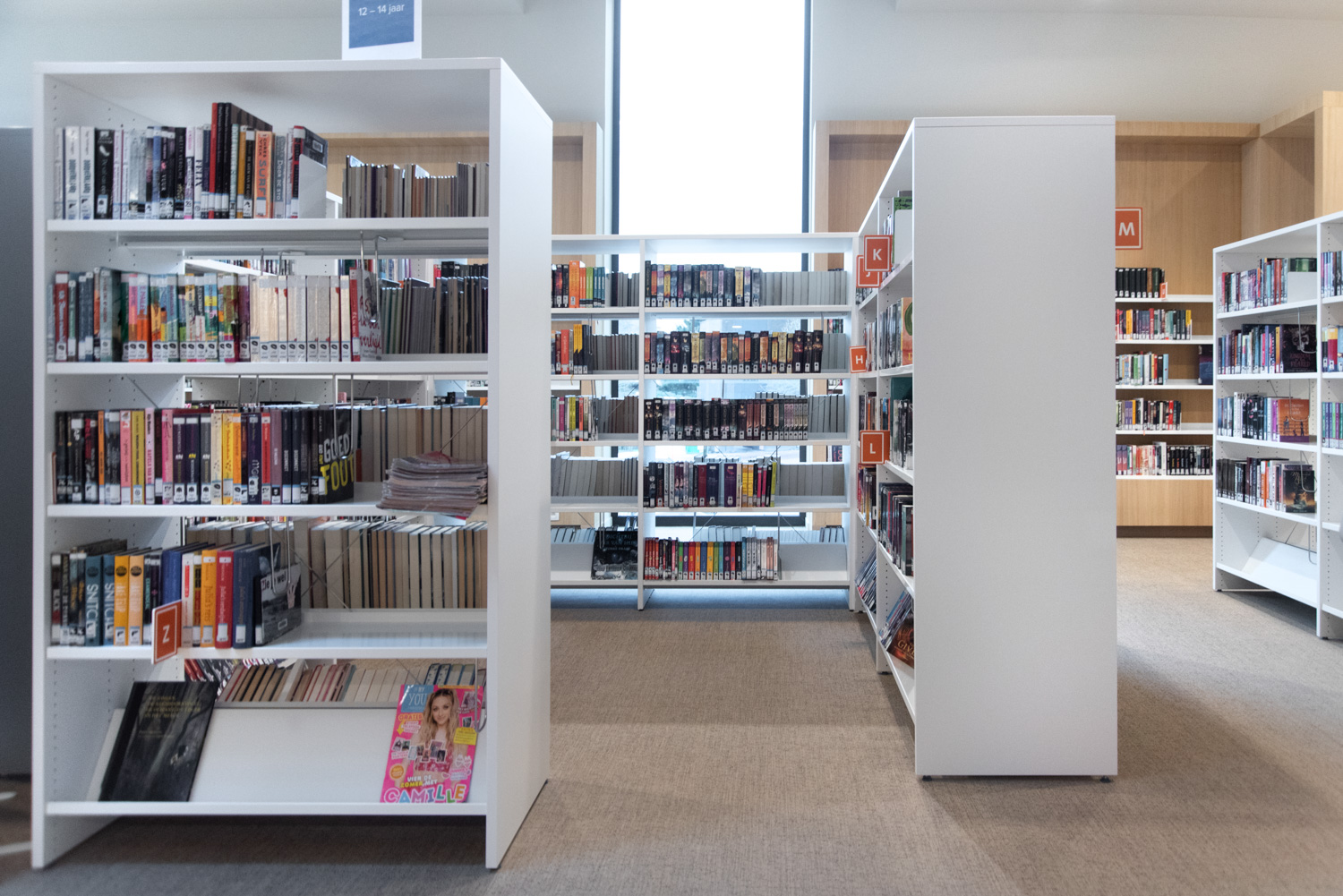 Välkommen till biblioteket i Pelt, som är en del av det mångsidiga och moderna Stroming-centret. När besökarna kommer in i biblioteket märker de genast den rymliga atmosfären med massor av dagsljus som strömmar in genom stora fönsterpartier. Användningen av träparkett och synlig betong skapar en modern och inbjudande estetik. Specialdesignade möbler och hyllsystemet Lingo i vitt bildar en neutral bakgrund som framhäver böckerna.