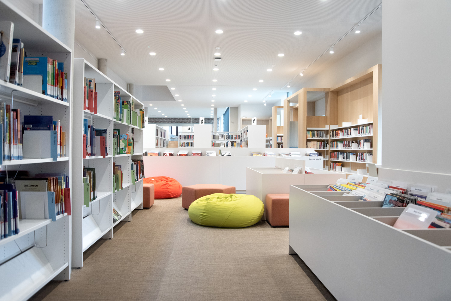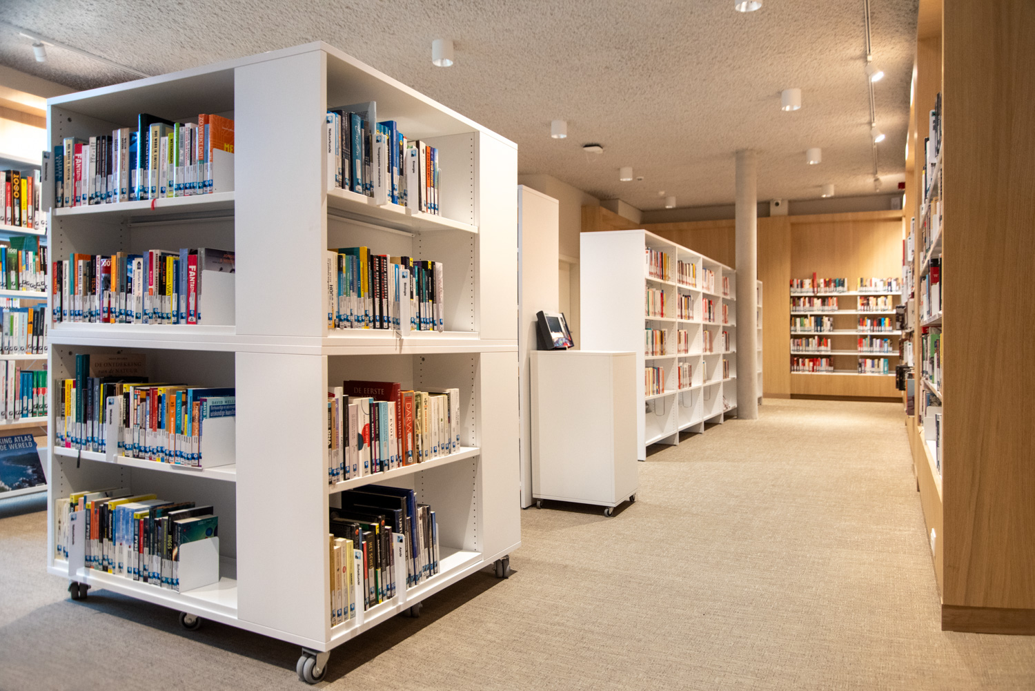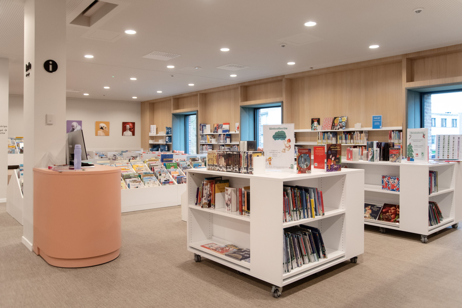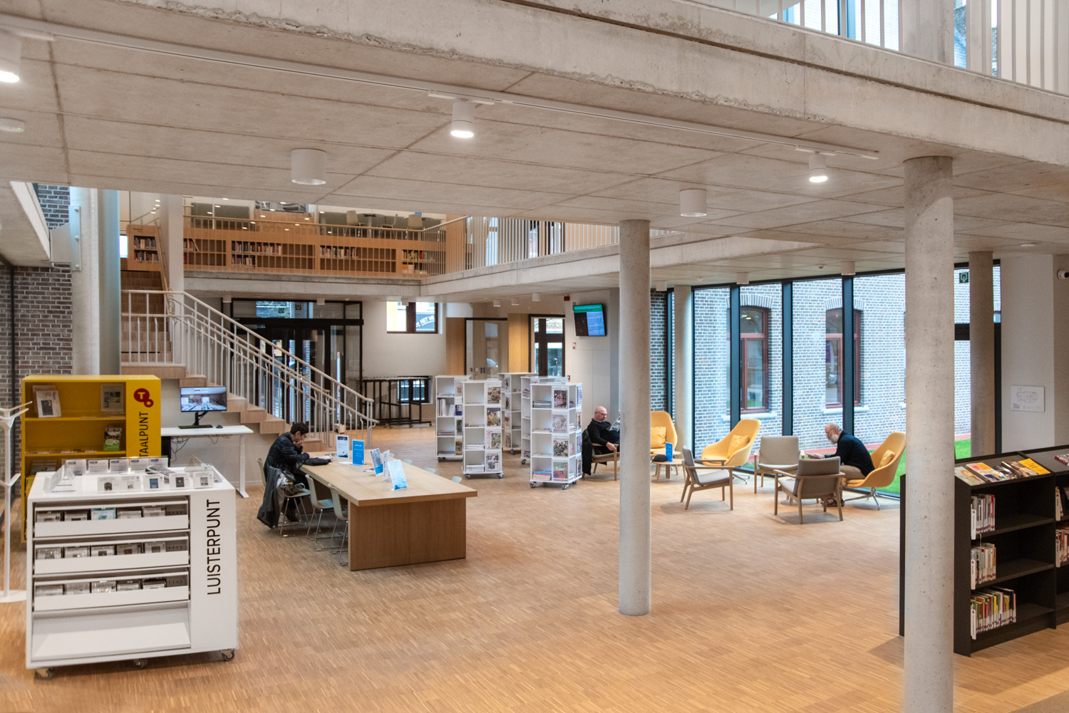 Välkommen till biblioteket i Pelt, som är en del av det mångsidiga och moderna Stroming-centret. När besökarna kommer in i biblioteket märker de genast den rymliga atmosfären med massor av dagsljus som strömmar in genom stora fönsterpartier. Användningen av träparkett och synlig betong skapar en modern och inbjudande estetik. Specialdesignade möbler och hyllsystemet Lingo i vitt bildar en neutral bakgrund som framhäver böckerna.