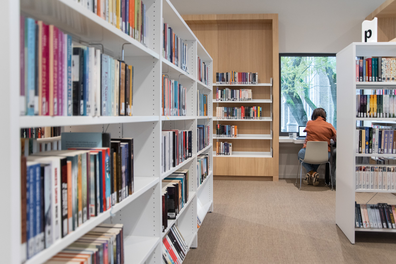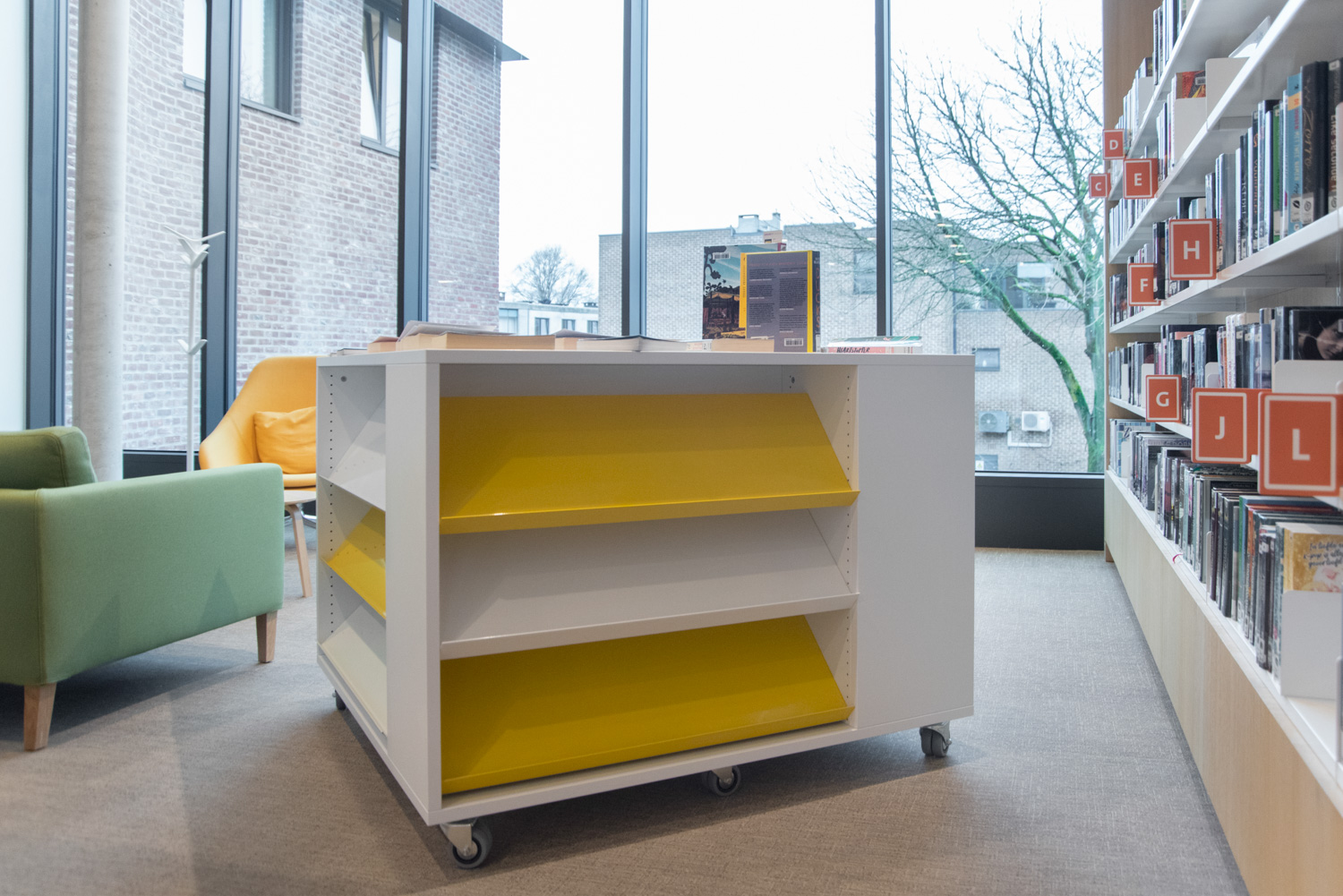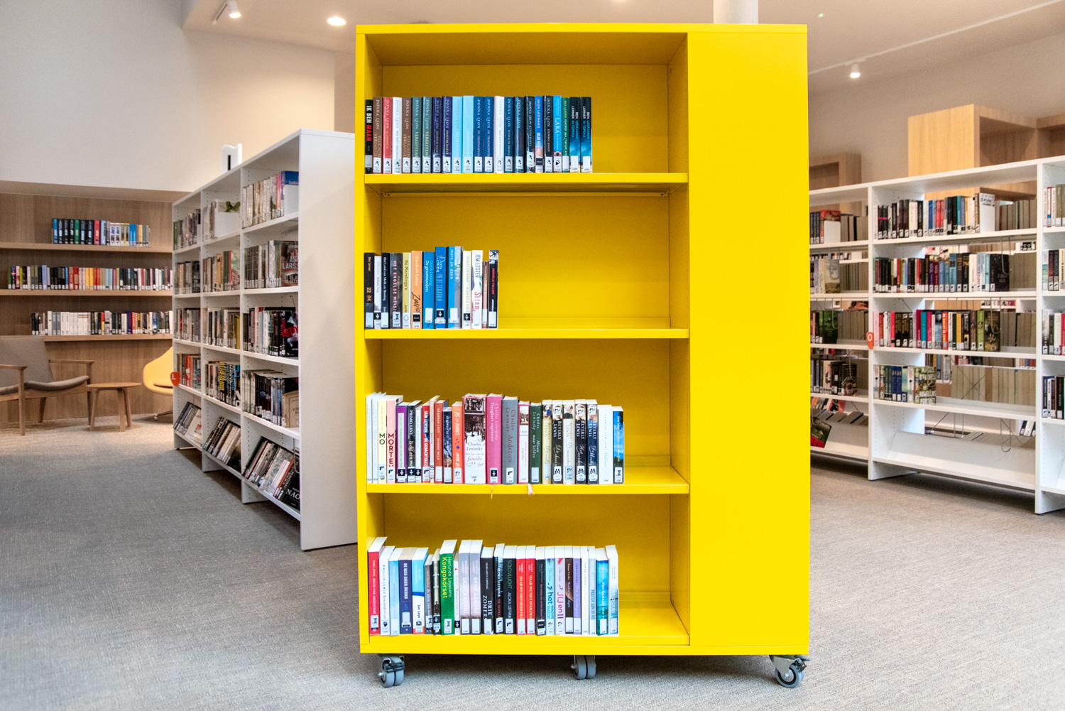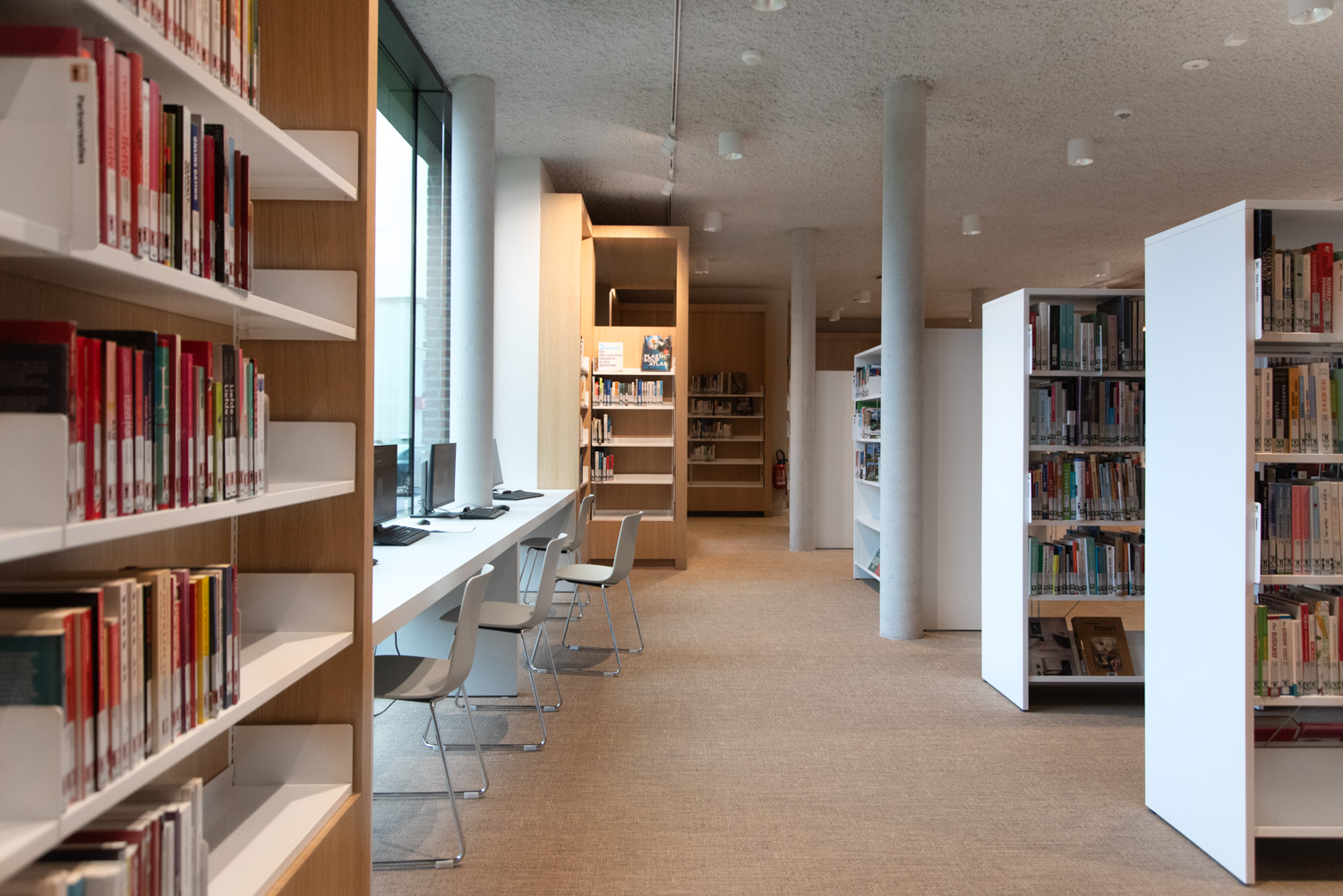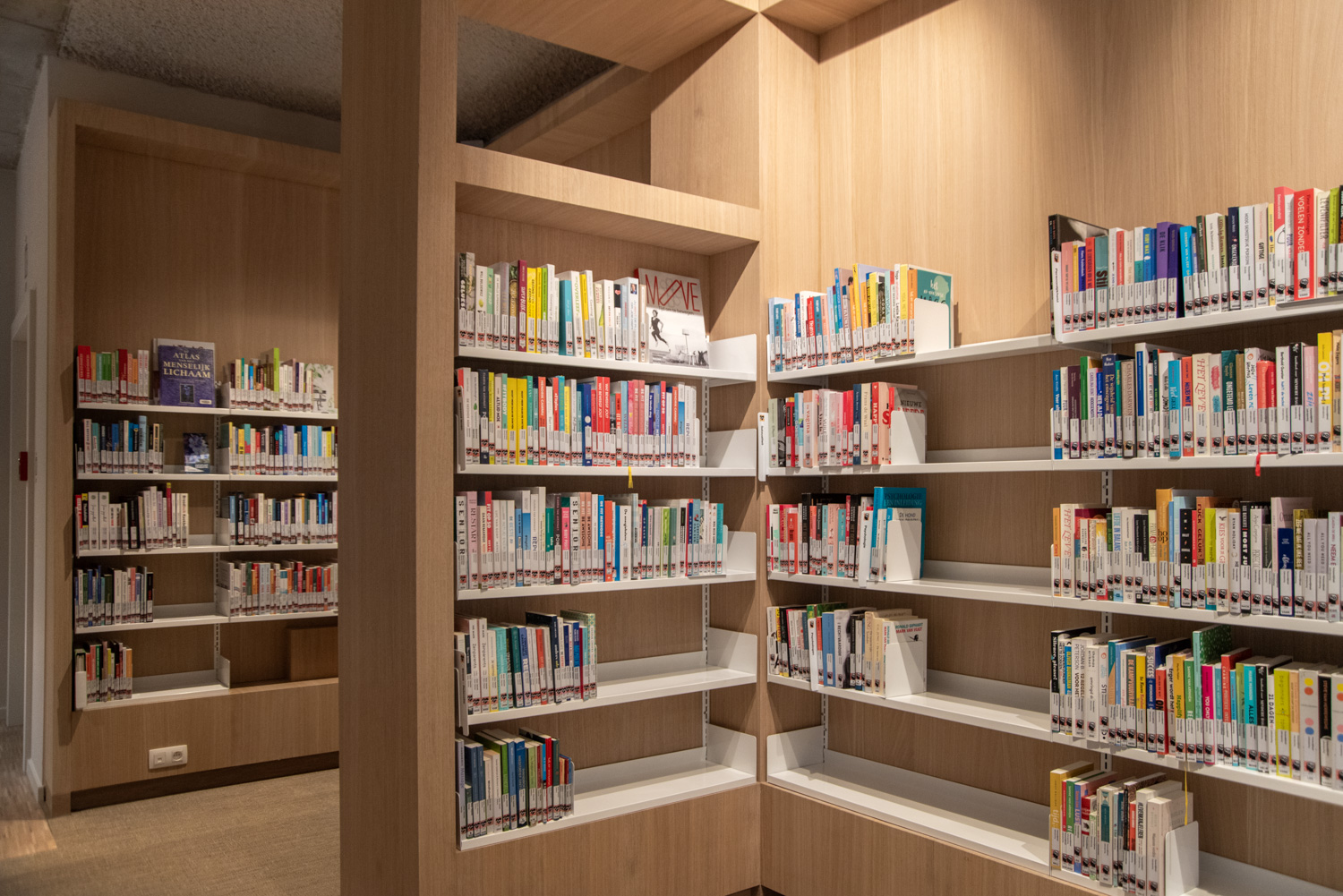Välkommen till biblioteket i Pelt, som är en del av det mångsidiga och moderna Stroming-centret. När besökarna kommer in i biblioteket märker de genast den rymliga atmosfären med massor av dagsljus som strömmar in genom stora fönsterpartier. Användningen av träparkett och synlig betong skapar en modern och inbjudande estetik. Specialdesignade möbler och hyllsystemet Lingo i vitt bildar en neutral bakgrund som framhäver böckerna.