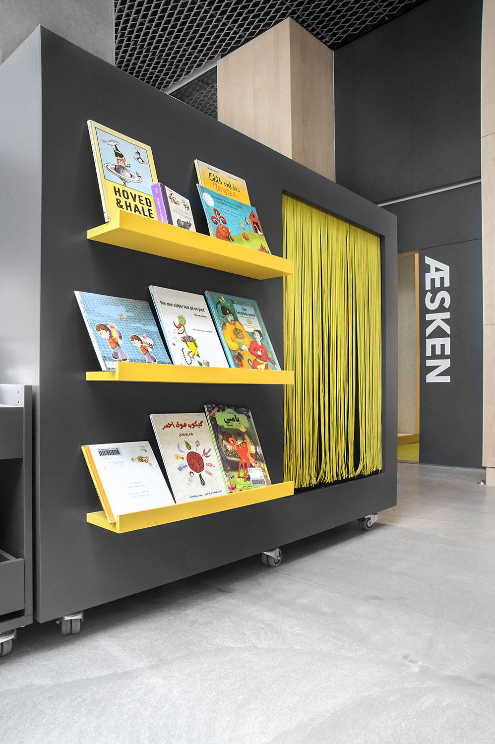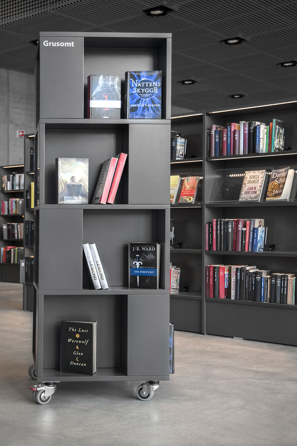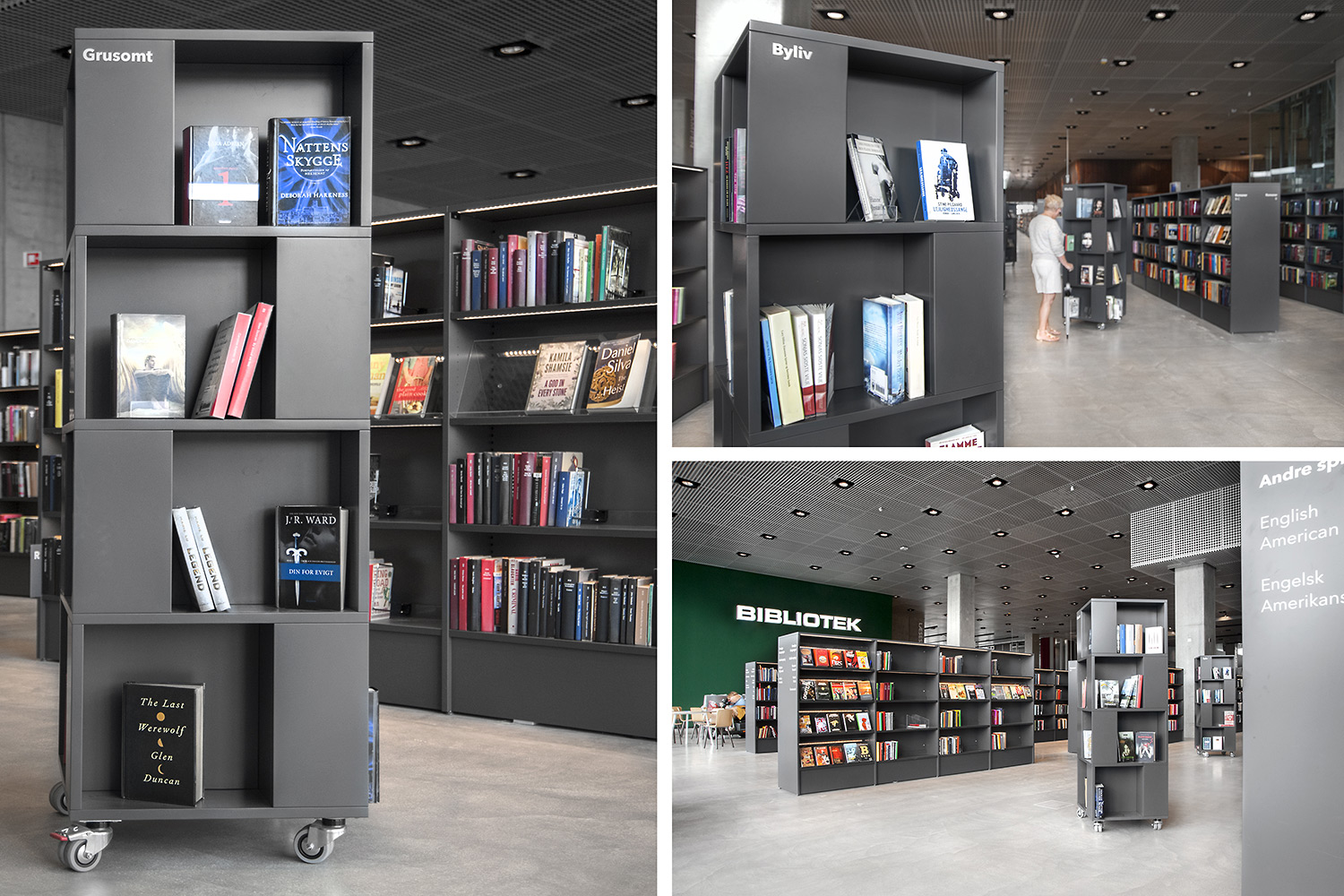På beställarens anmodan att använda så få olika möbelmodeller som möjligt i det nya biblioteket, gjordes bland annat en fusion av våra välkända hyllsystem Ordrup och Frontline Square – resultatet är Ordrup Square!