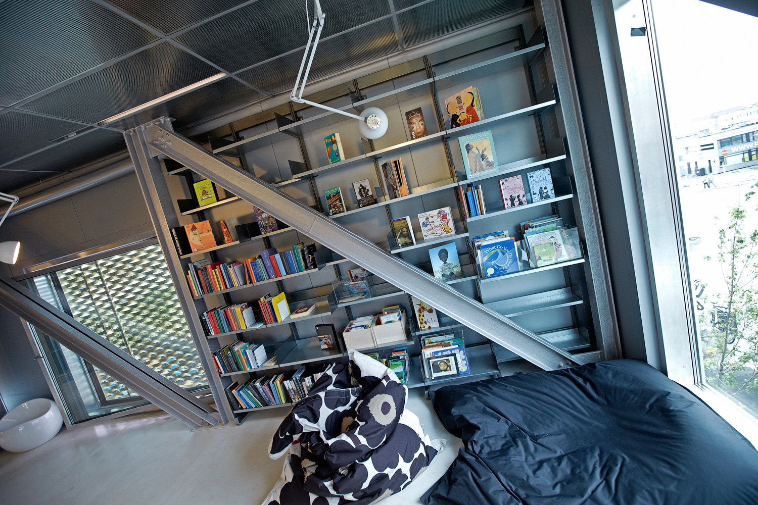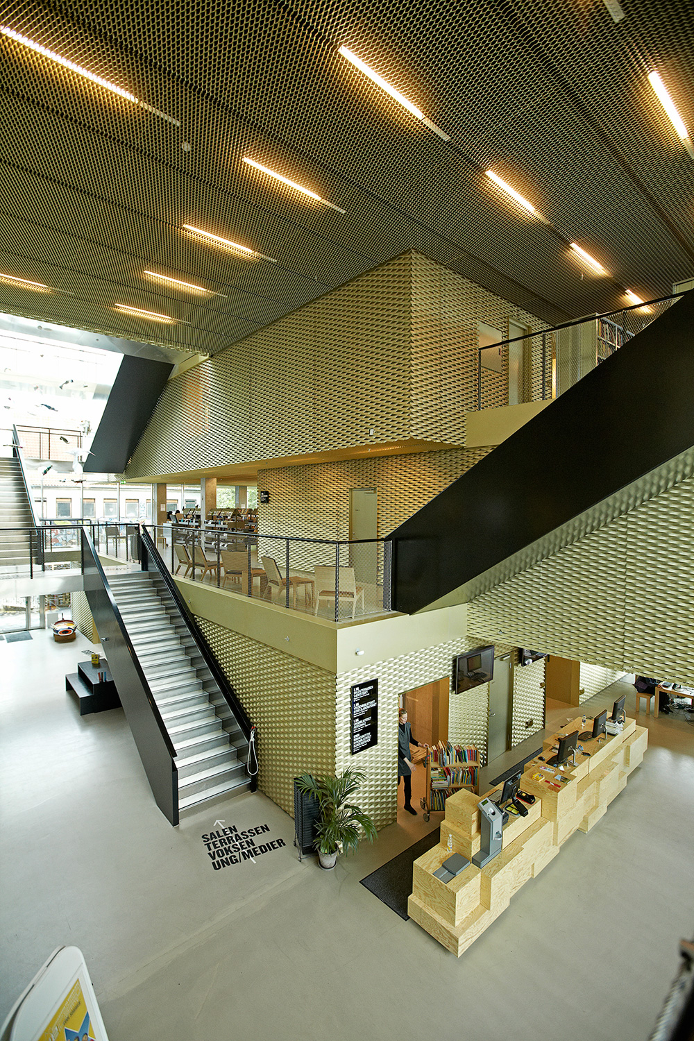 Huset har sin egen själ, och arkitekterna och stadsplanerarna har både fångat och förnyat dess essens. Förgyllda, perforerade plattor täcker fasaden, och byggnaden är sammansatt av fyra block som kan ses som fyra böcker med olika innehåll.