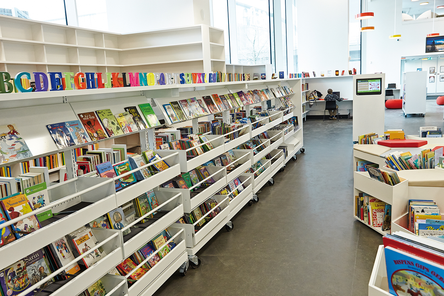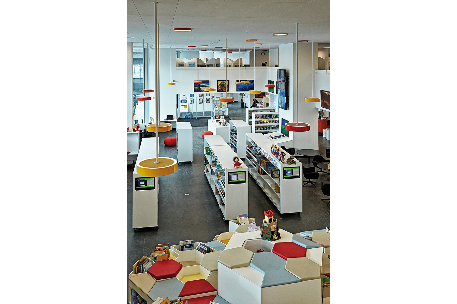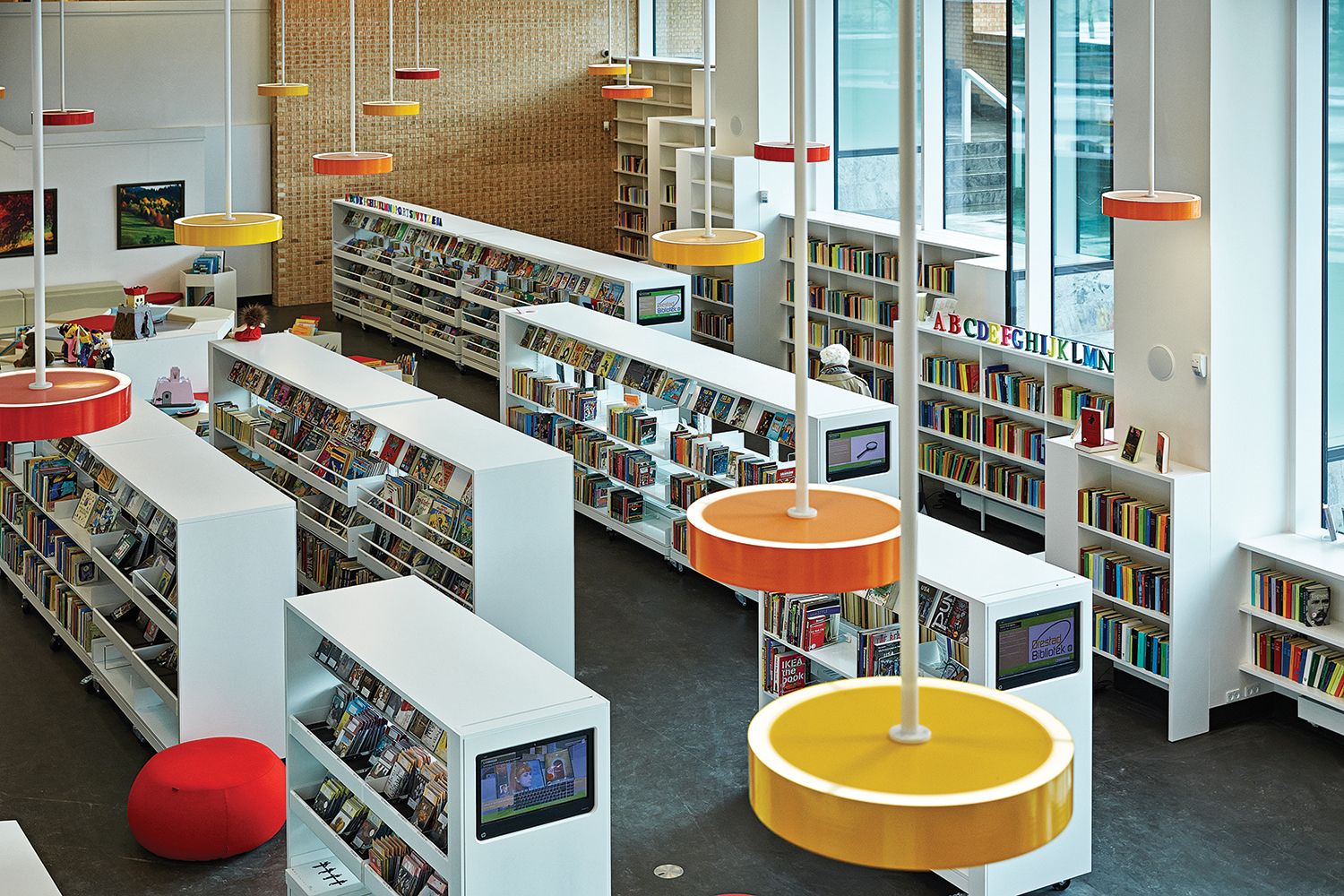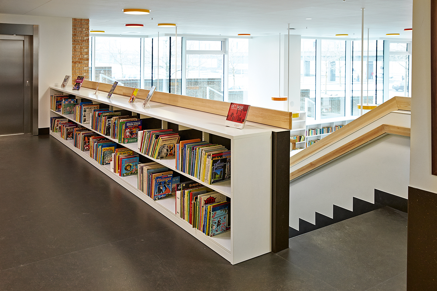 Inredningsstilen fokuserar på flexibilitet och multifunktionella lösningar. Biblioteket kan förvandlas från att vara ett skolbibliotek på dagen till att vara ett folkbibliotek på eftermiddagen. På kvällen öppnar det upp som ett kulturcentrum med plats för föreställningar, föredrag, film och annat.