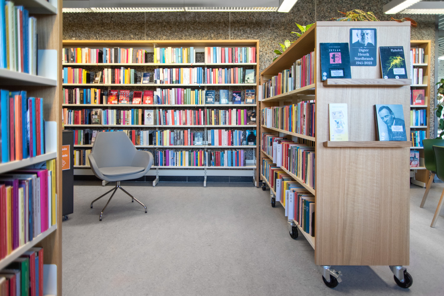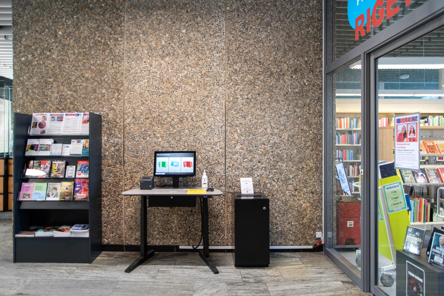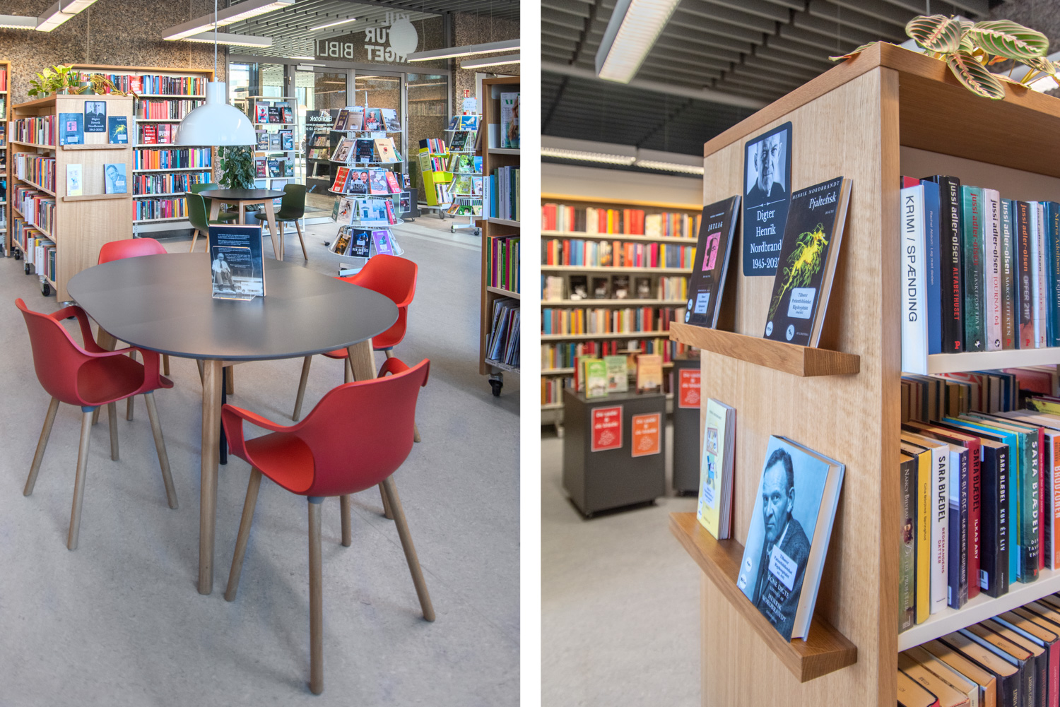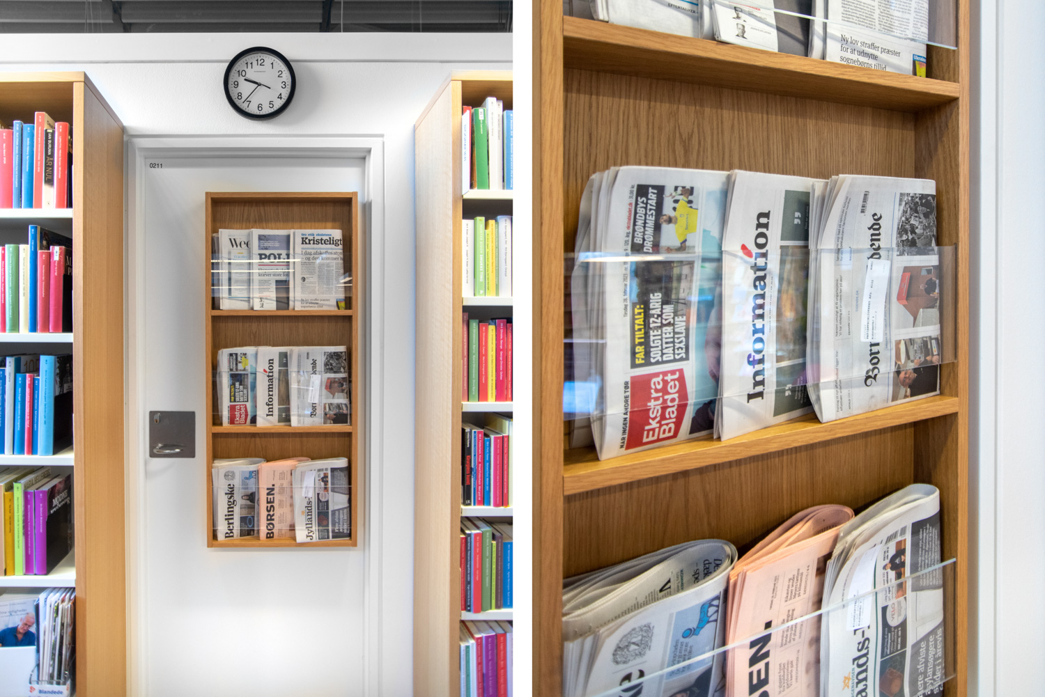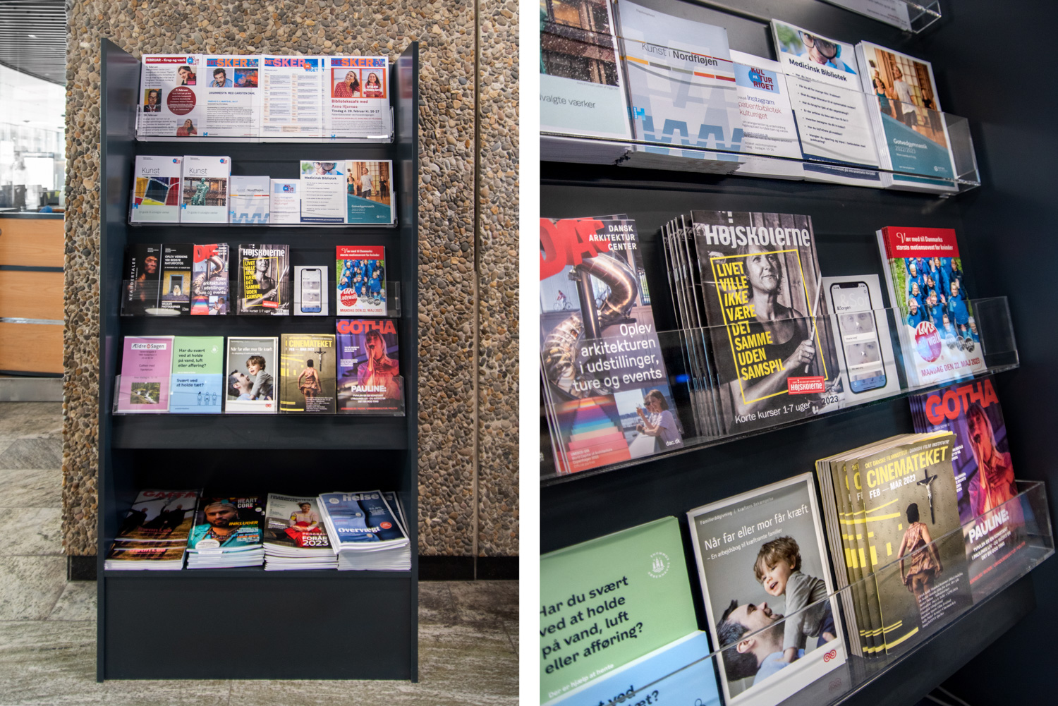 På biblioteket ser man snygga exponeringshyllplan på hyllgavlarna med spännande och iögonfallande läsning. Bland möblerna märks bland annat Hay och Andersen Furniture samt specialdesignade tidnings- och broschyrhållare.