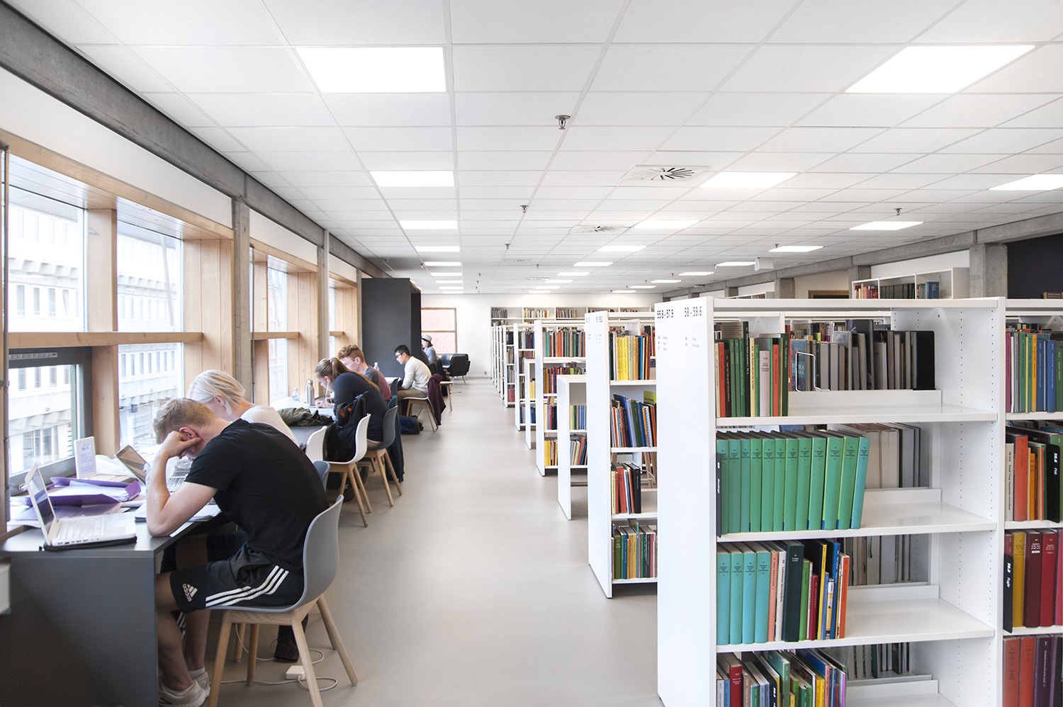 Den breda huvudtrappan ger möjlighet att sitta i och leder upp till andra våningen där en ny studieavdelning är belägen. Här finner man både läsplatser samt mindre klassrum med ett antal studieplatser i. Avdelningen upplevs idag mycket öppnare i sin planlösning och utrymmet utnyttjas mer än tidigare.