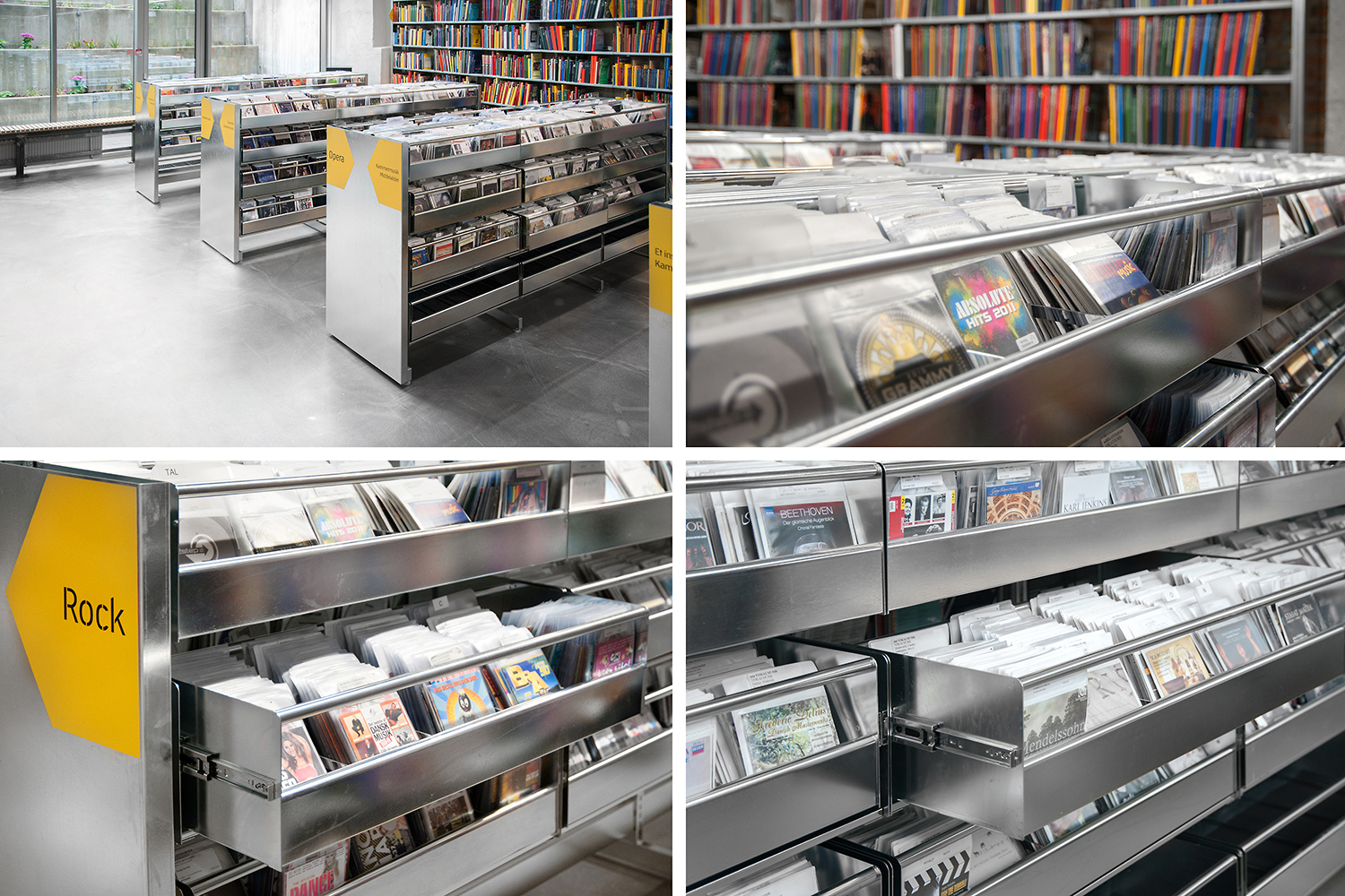 Hyllor, exponeringsmöbler och informationsdiskar är utformade i linje med arkitektens industriella New Yorkuttryck med de senaste trenderna för användarvänlighet, inspiration och medieteknik.