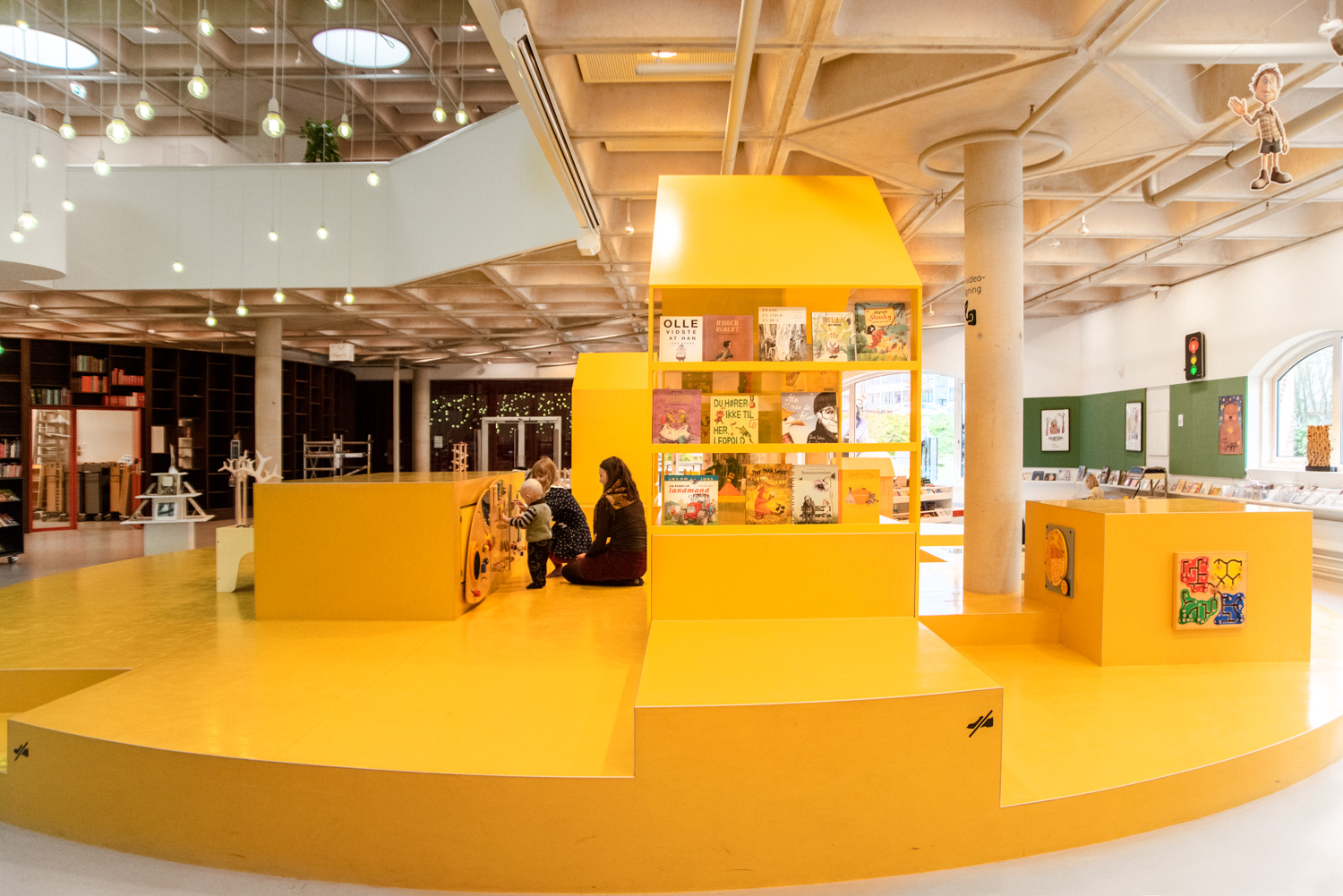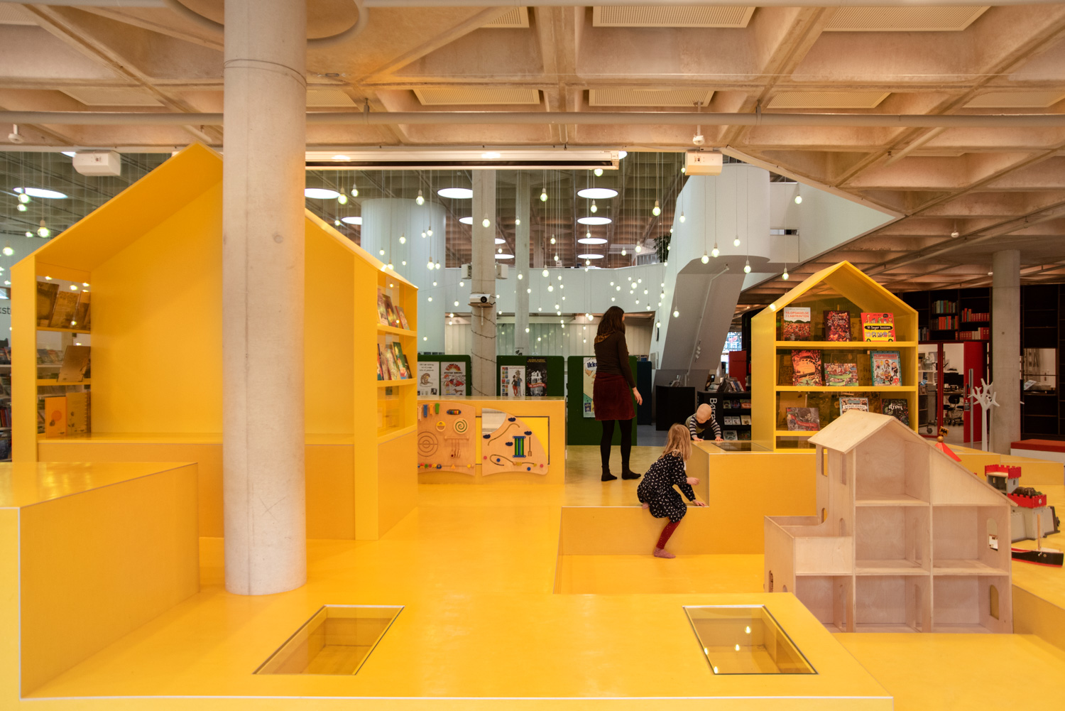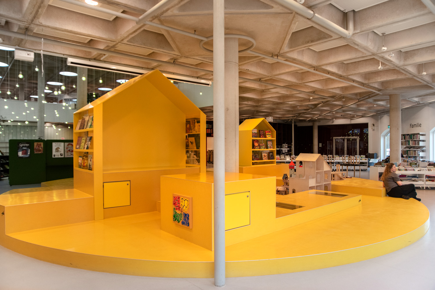 Ovanpå den stora gula ”osten” har man placerat två stora hus med läsgrottor och plats för exponering.