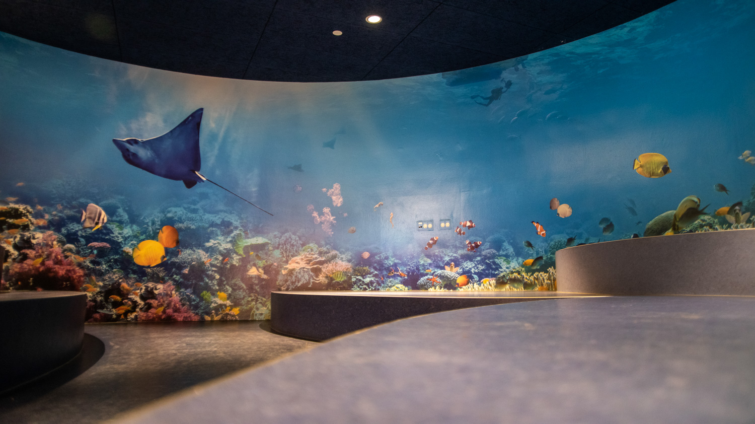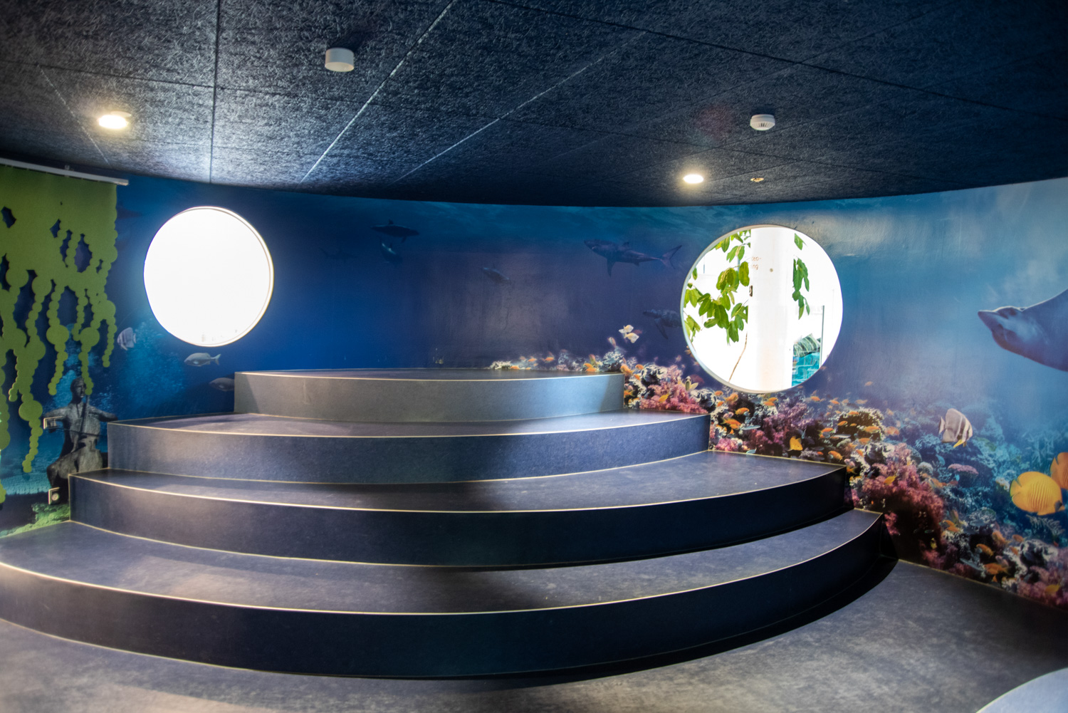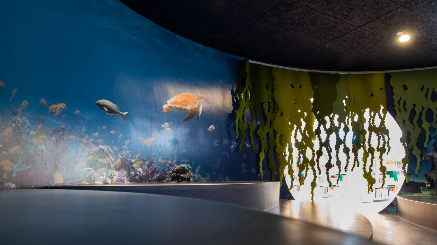 Den runda äventyrsgrottan i mitten av biblioteket har förvandlats till Oceanen, där en stor väggfolie med specialdesignat motiv och en tånggardin ger känslan av att vara under havet. Samtidigt kan barnen gå på jakt efter sjöhästar eller tävla om att först hitta anemonfisk-ungen.
