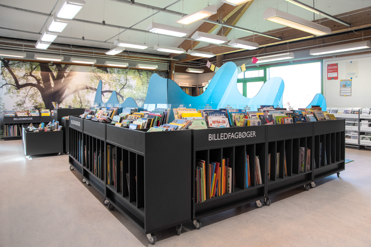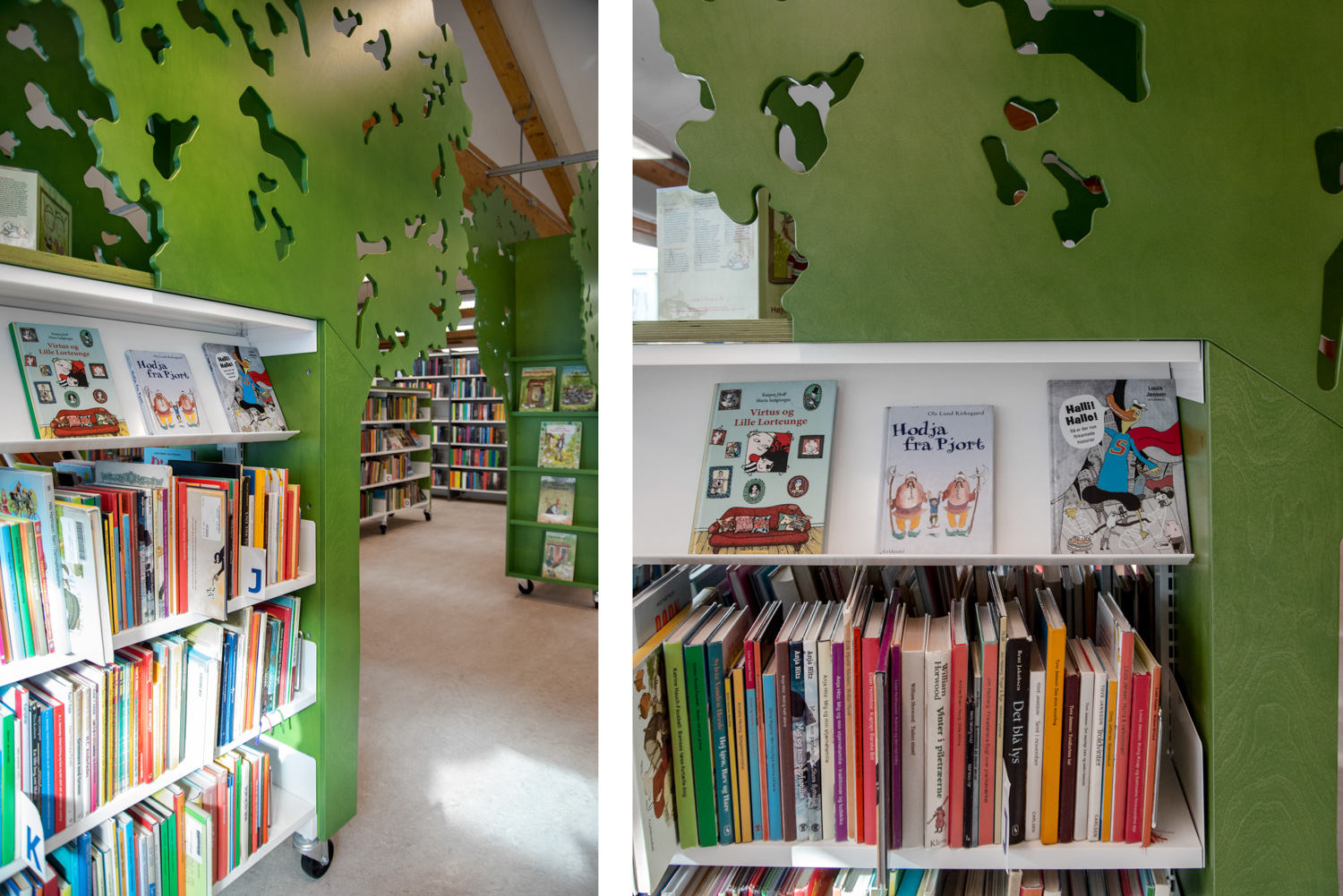 Det gamla barnbiblioteket dominerades av höga hyllor där böcker till både mindre och större barn stod omvartannat. Den nya biblioteksinredningen består av lägre hyllor som skapar rum i rummet. Böcker till olika målgrupper är placerade var för sig, och specialtillverkad biblioteksinredning fokuserar på lek, natur och fantasi.