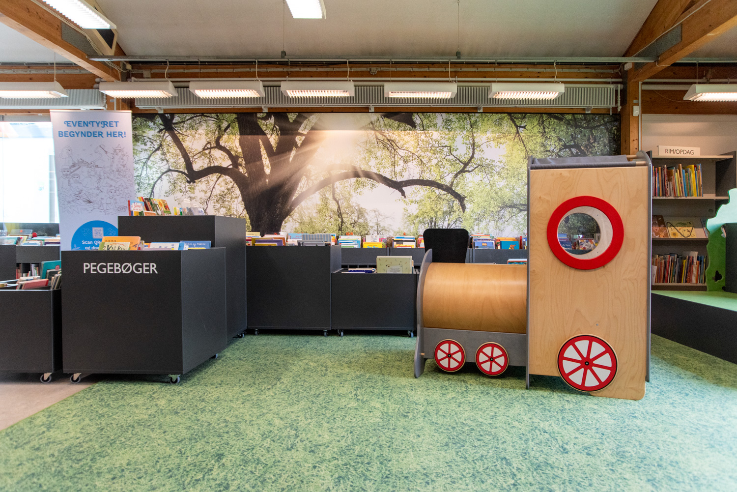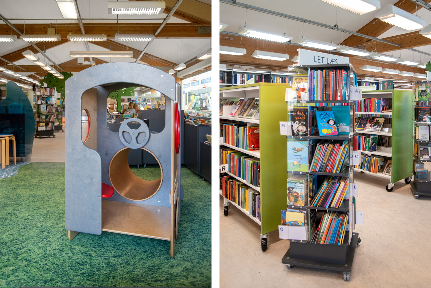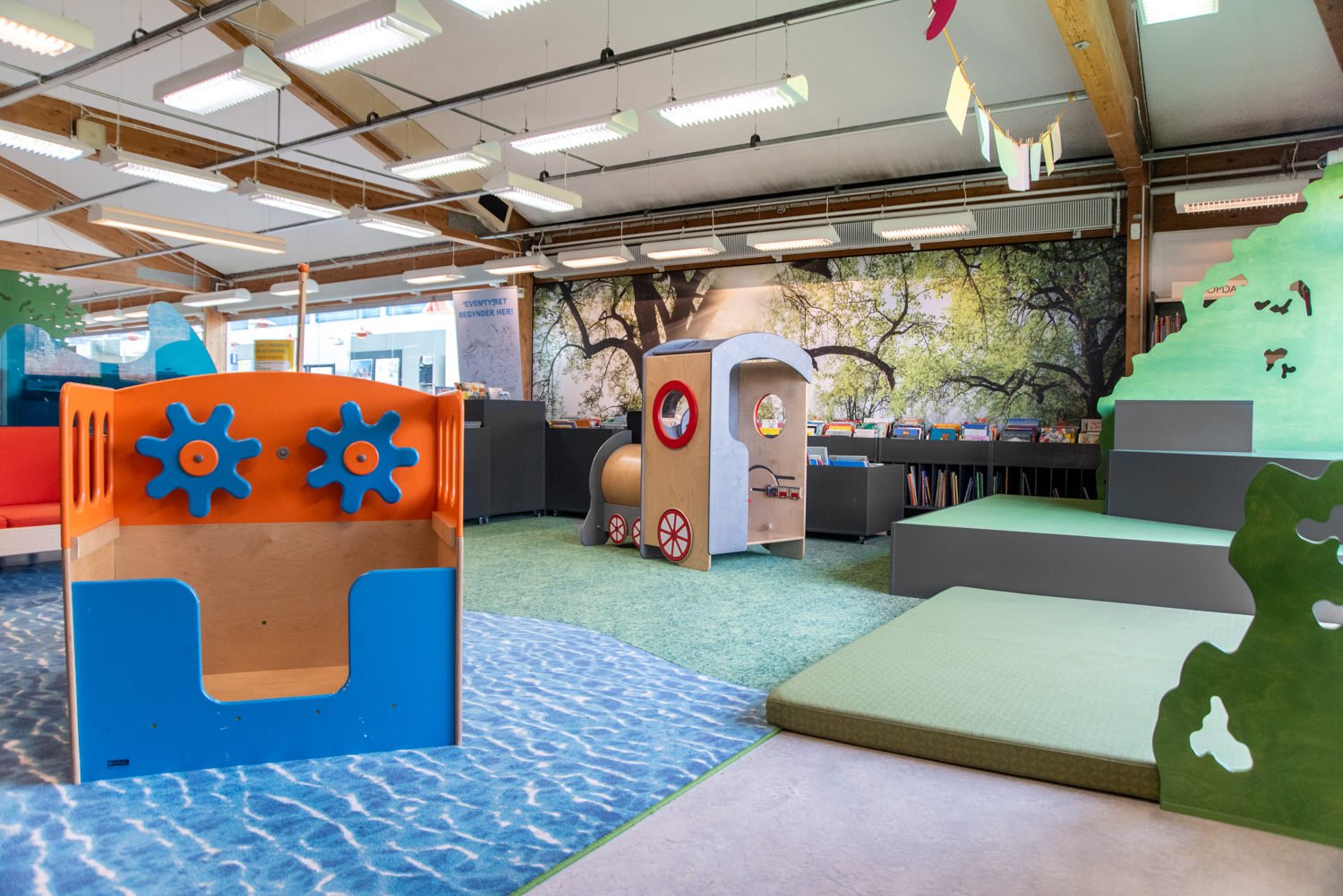 Det gamla lekskeppet och -tåget har bevarats men har nu fått sin naturliga plats. På så vis går den gamla biblioteksinredningen hand i hand med de nya produkterna på detta fantasifulla barnbibliotek.