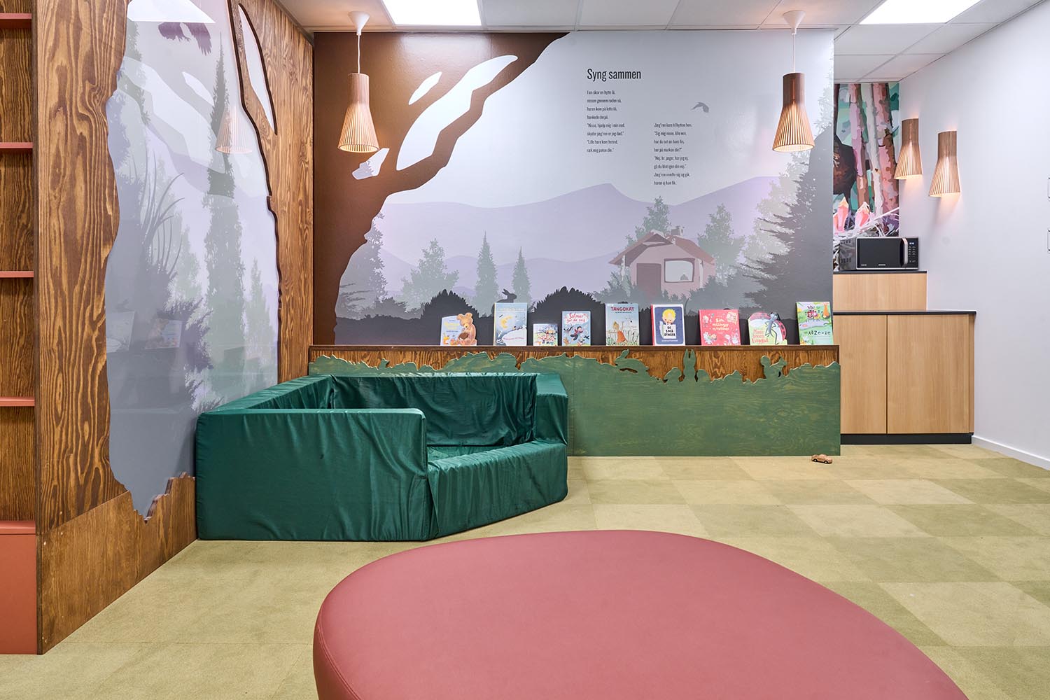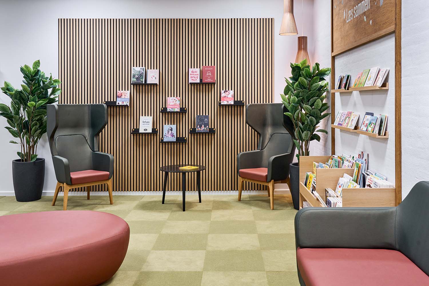 Kom in i den fantasifulla ”lässkogen” i barnavdelningen – komplett med djurgrafik, puffar formade som trädstubbar, bokhyllor i ihåliga träd och mjuka mattor som skapar ett inbjudande rum för högläsning, lek och upptäckter. Inredningen uppmuntrar till gemensam läsning, sinneslekar och nyfikenhet, och specialdesignade möbler från Lammhults Biblioteksdesign säkerställer en harmonisk kombination av funktion och estetik.