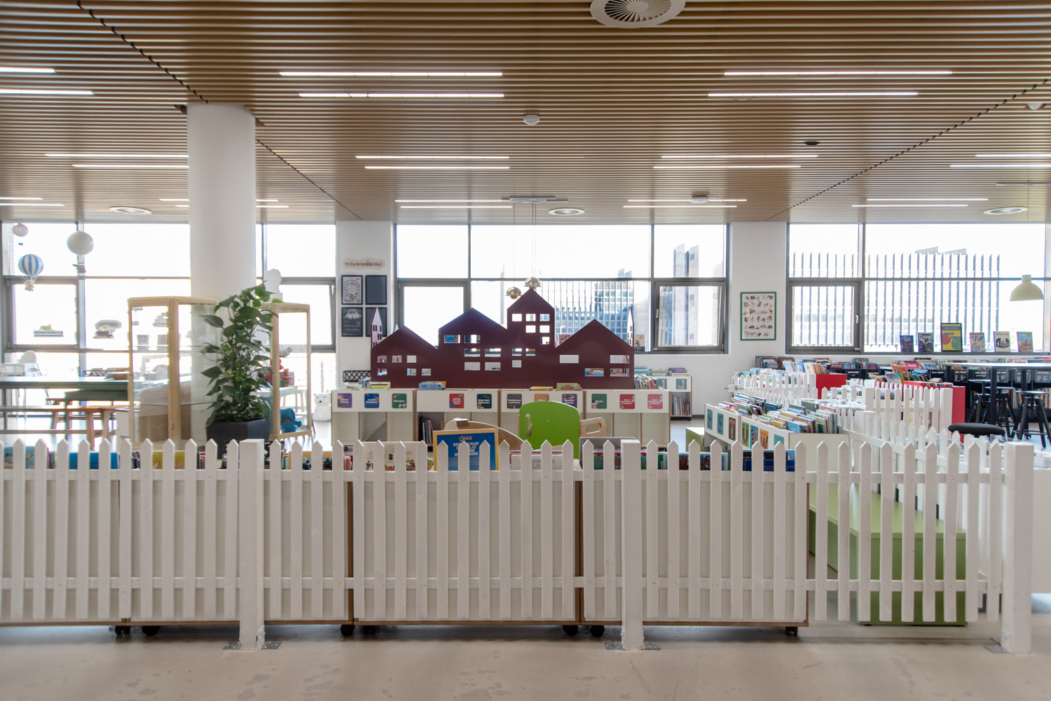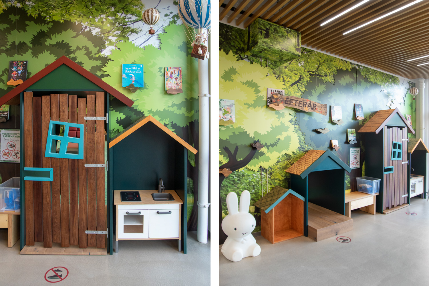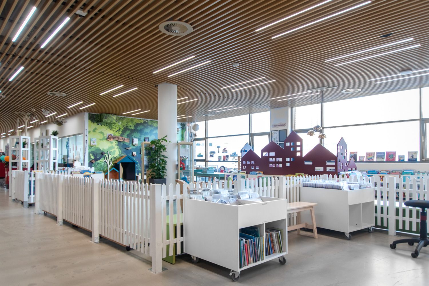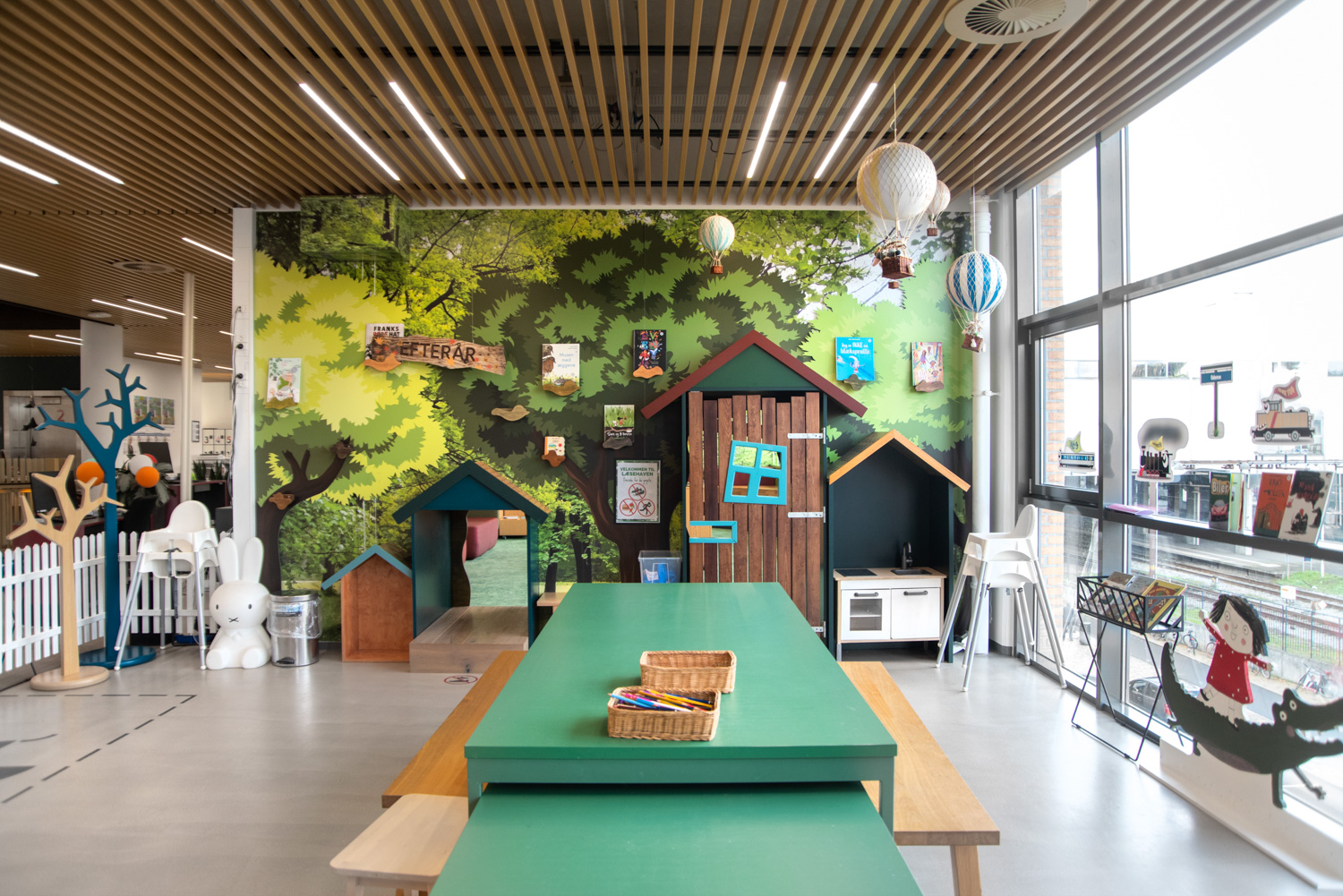 Ett staket ramar in barnavdelningen som också pusslats ihop av gammal och ny inredning. Mellan exponeringslådorna har man skapat zoner för avkoppling, lek och kreativa arrangemang. ”Trädgården” för de minsta är särskilt speciell. Går man in mellan de små husen i skogens kant så hamnar man mitt i en trädgård med gräs, träd, blommor och annat fint från naturen. Det scenografiska har flätats samman med bokexponering så att litteraturen blir en del av upplevelsen.
