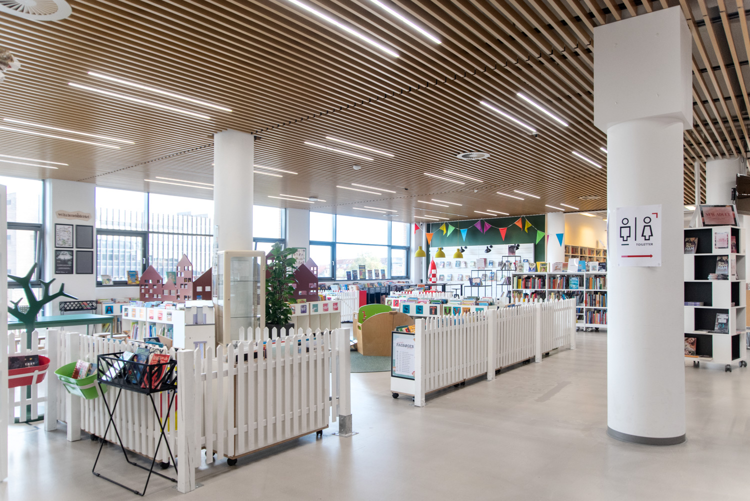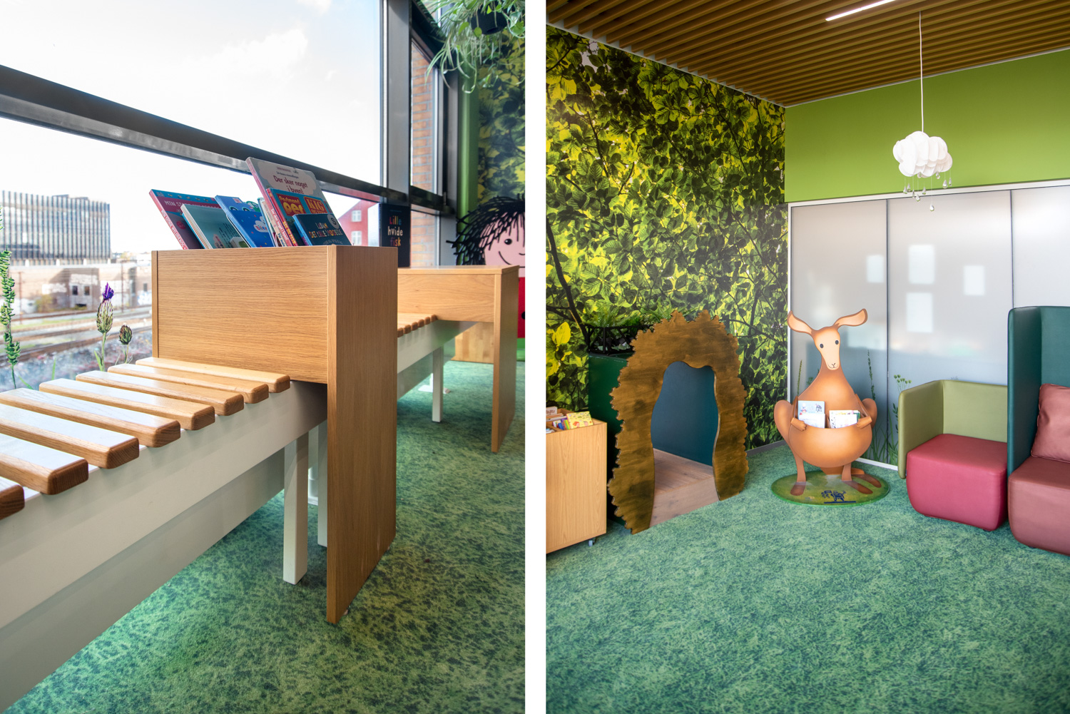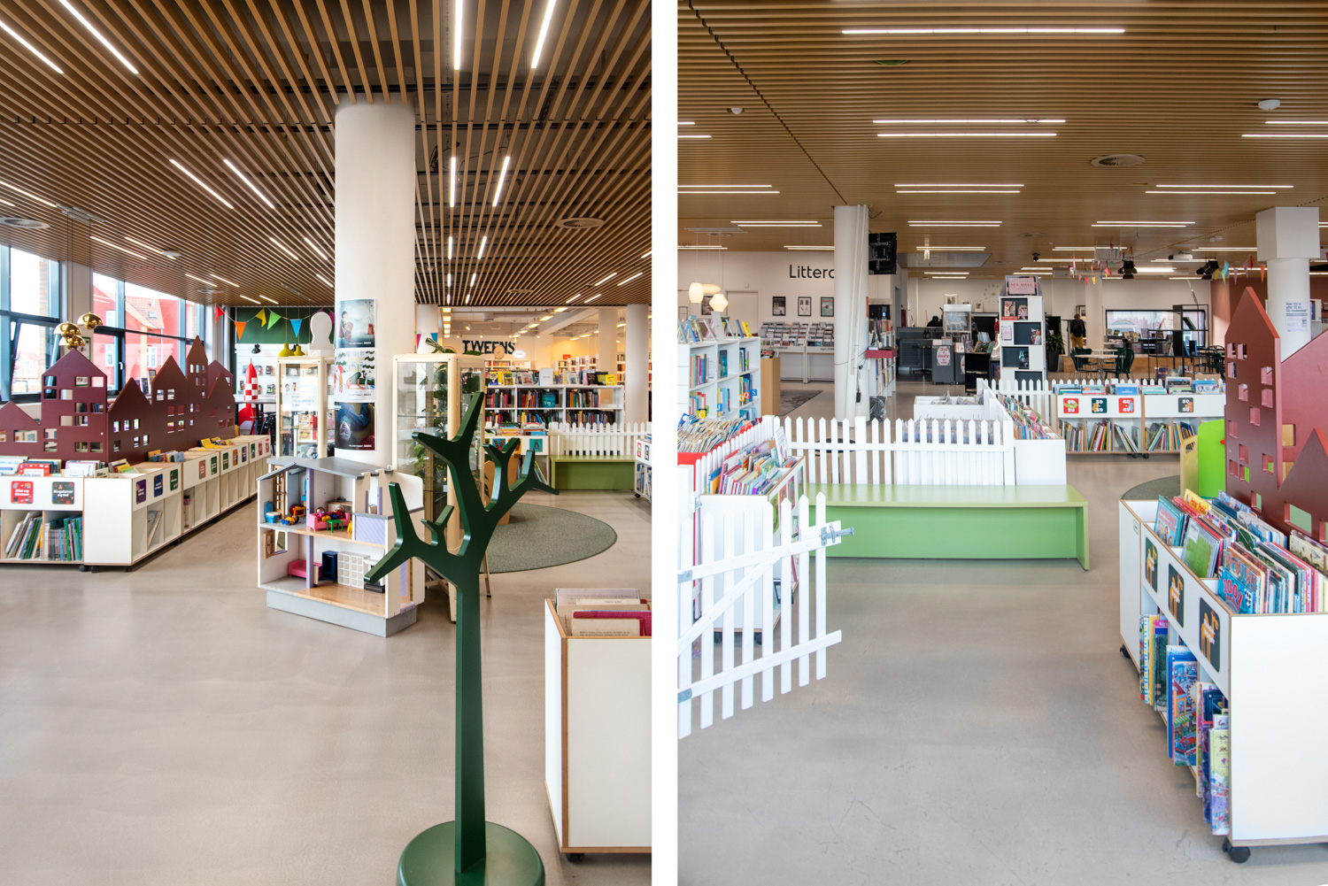 Ett staket ramar in barnavdelningen som också pusslats ihop av gammal och ny inredning. Mellan exponeringslådorna har man skapat zoner för avkoppling, lek och kreativa arrangemang. ”Trädgården” för de minsta är särskilt speciell. Går man in mellan de små husen i skogens kant så hamnar man mitt i en trädgård med gräs, träd, blommor och annat fint från naturen. Det scenografiska har flätats samman med bokexponering så att litteraturen blir en del av upplevelsen.