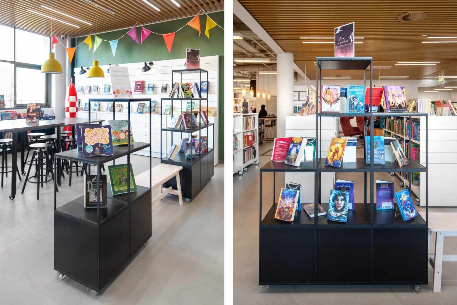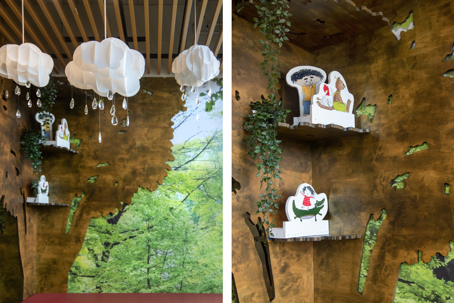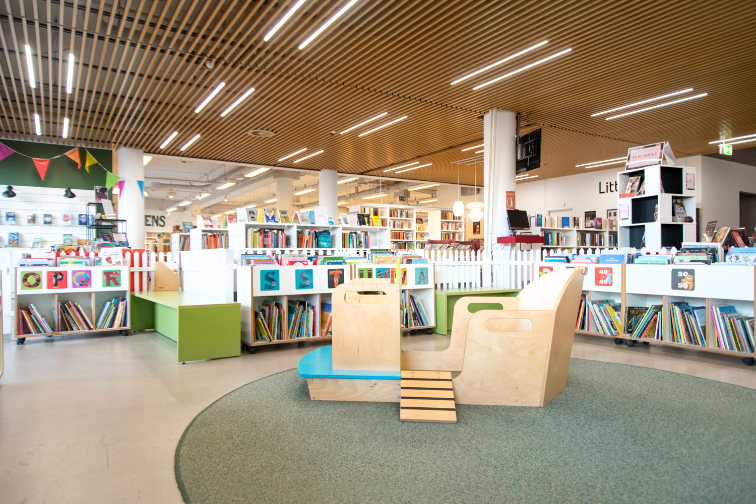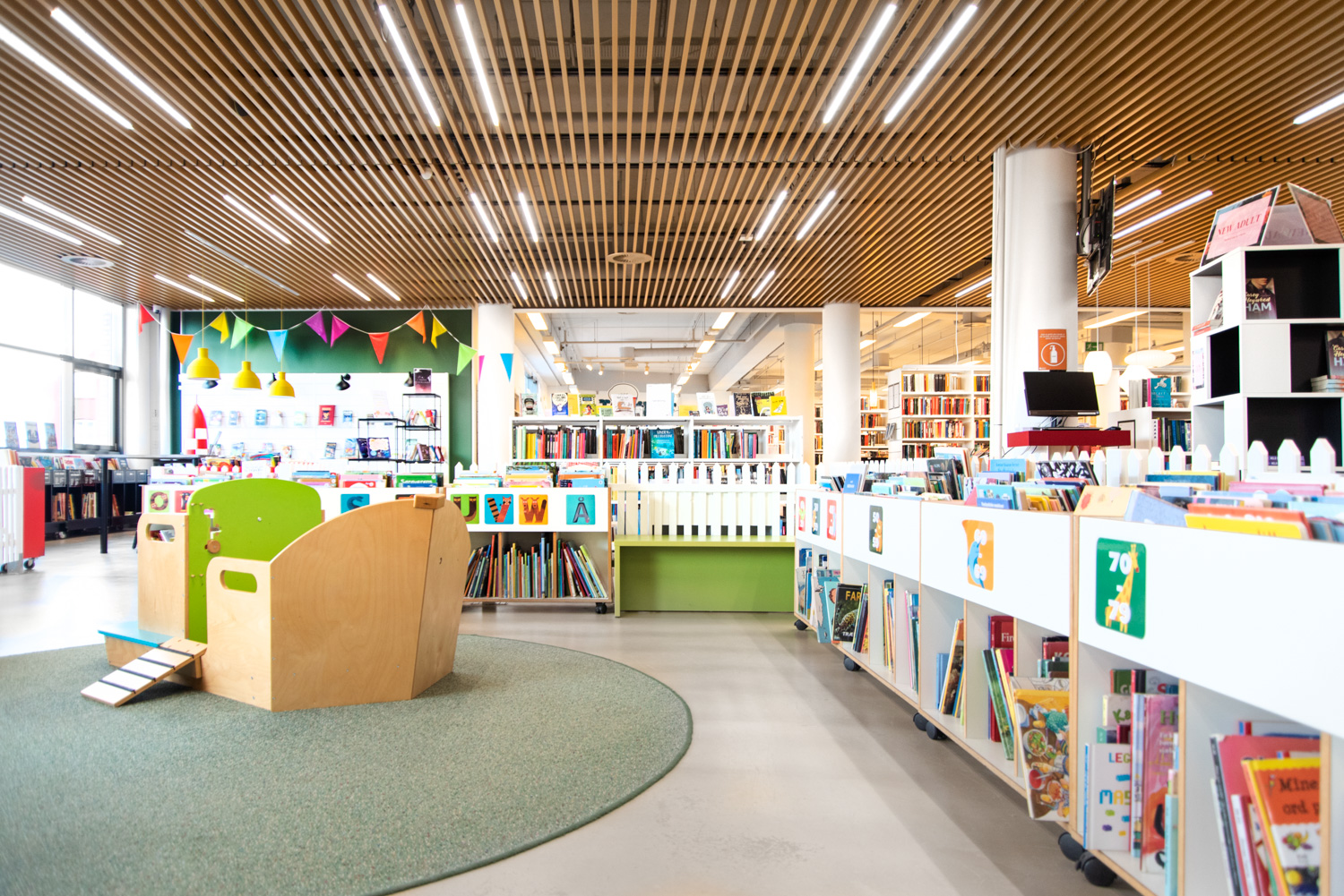Ett staket ramar in barnavdelningen som också pusslats ihop av gammal och ny inredning. Mellan exponeringslådorna har man skapat zoner för avkoppling, lek och kreativa arrangemang. ”Trädgården” för de minsta är särskilt speciell. Går man in mellan de små husen i skogens kant så hamnar man mitt i en trädgård med gräs, träd, blommor och annat fint från naturen. Det scenografiska har flätats samman med bokexponering så att litteraturen blir en del av upplevelsen.