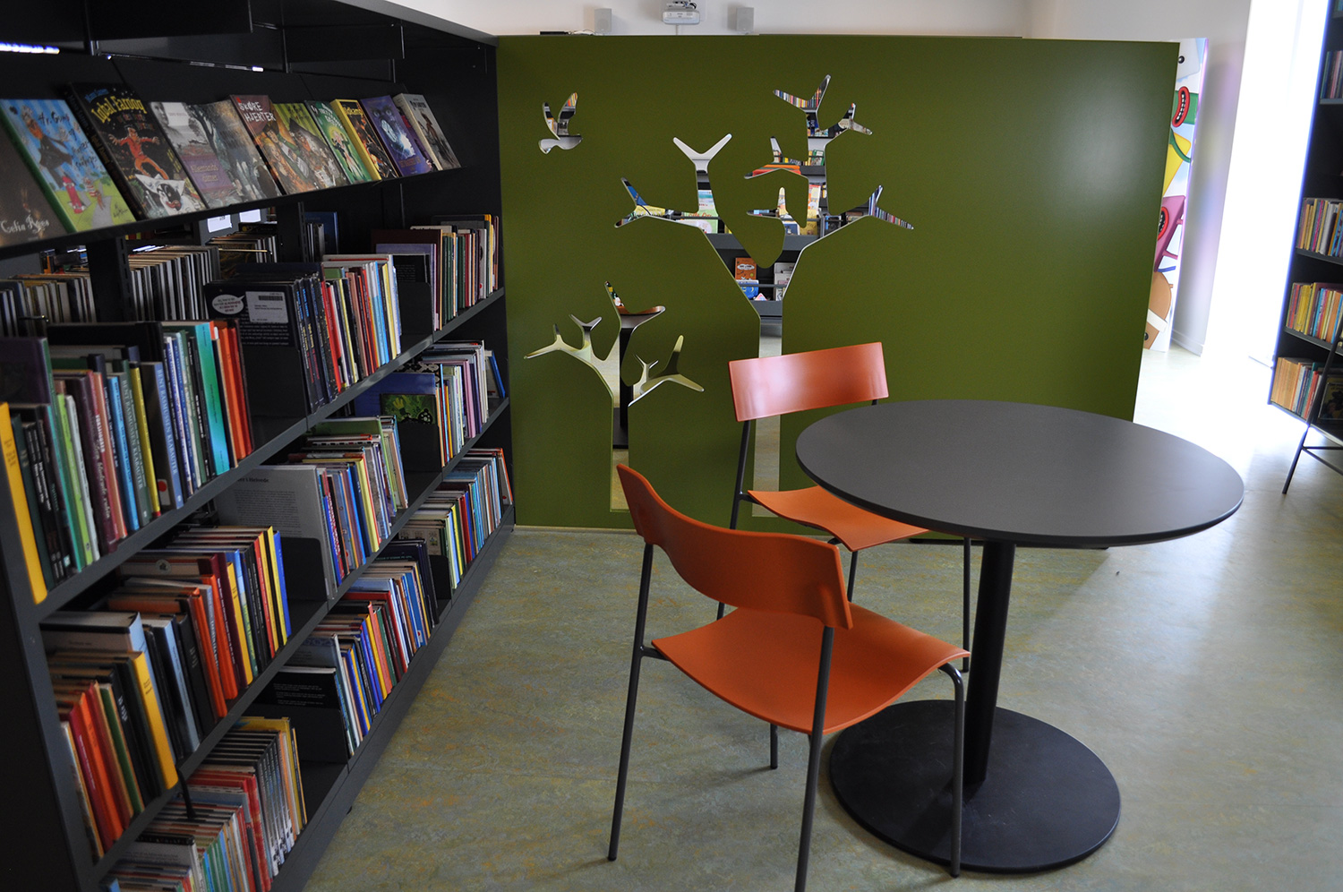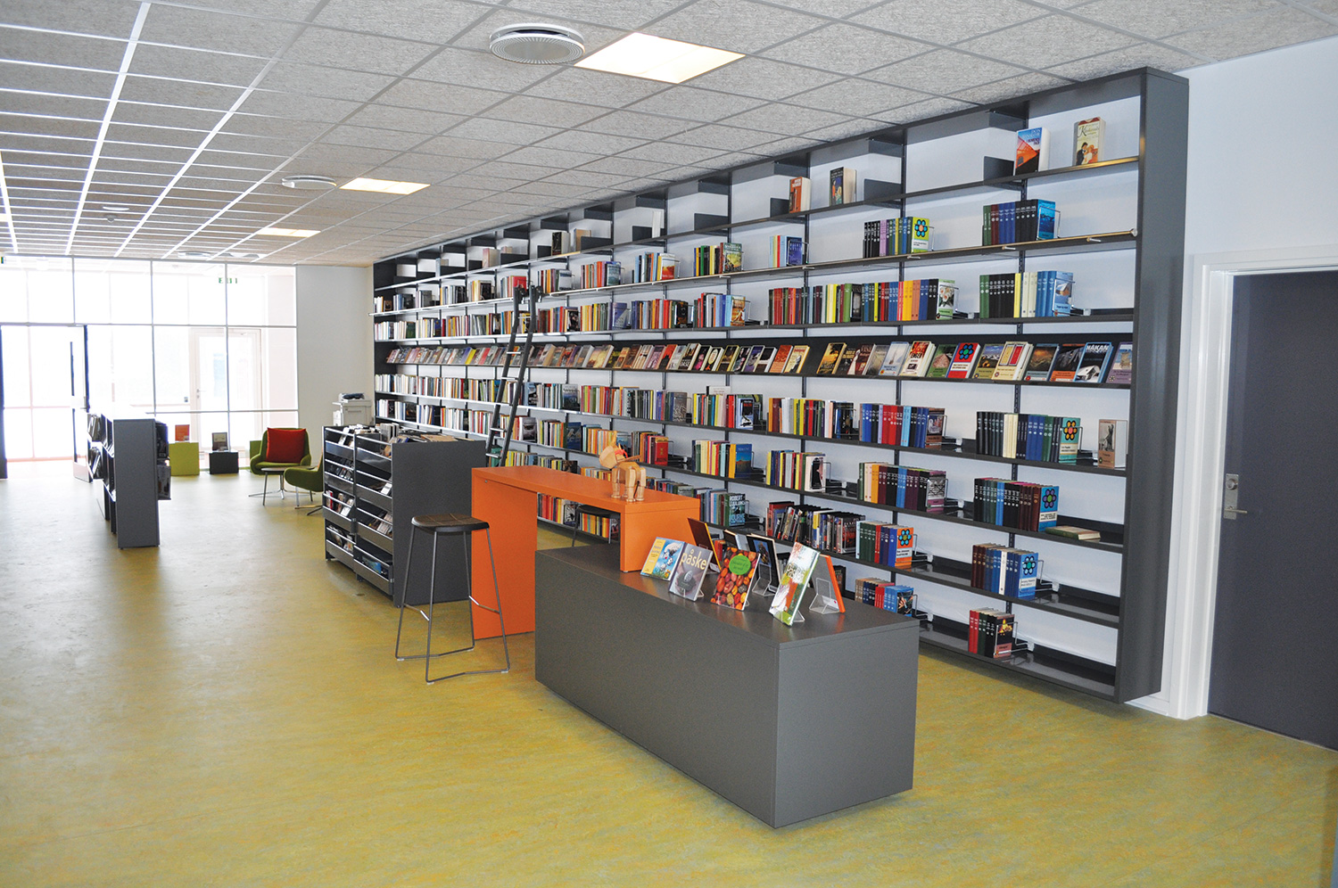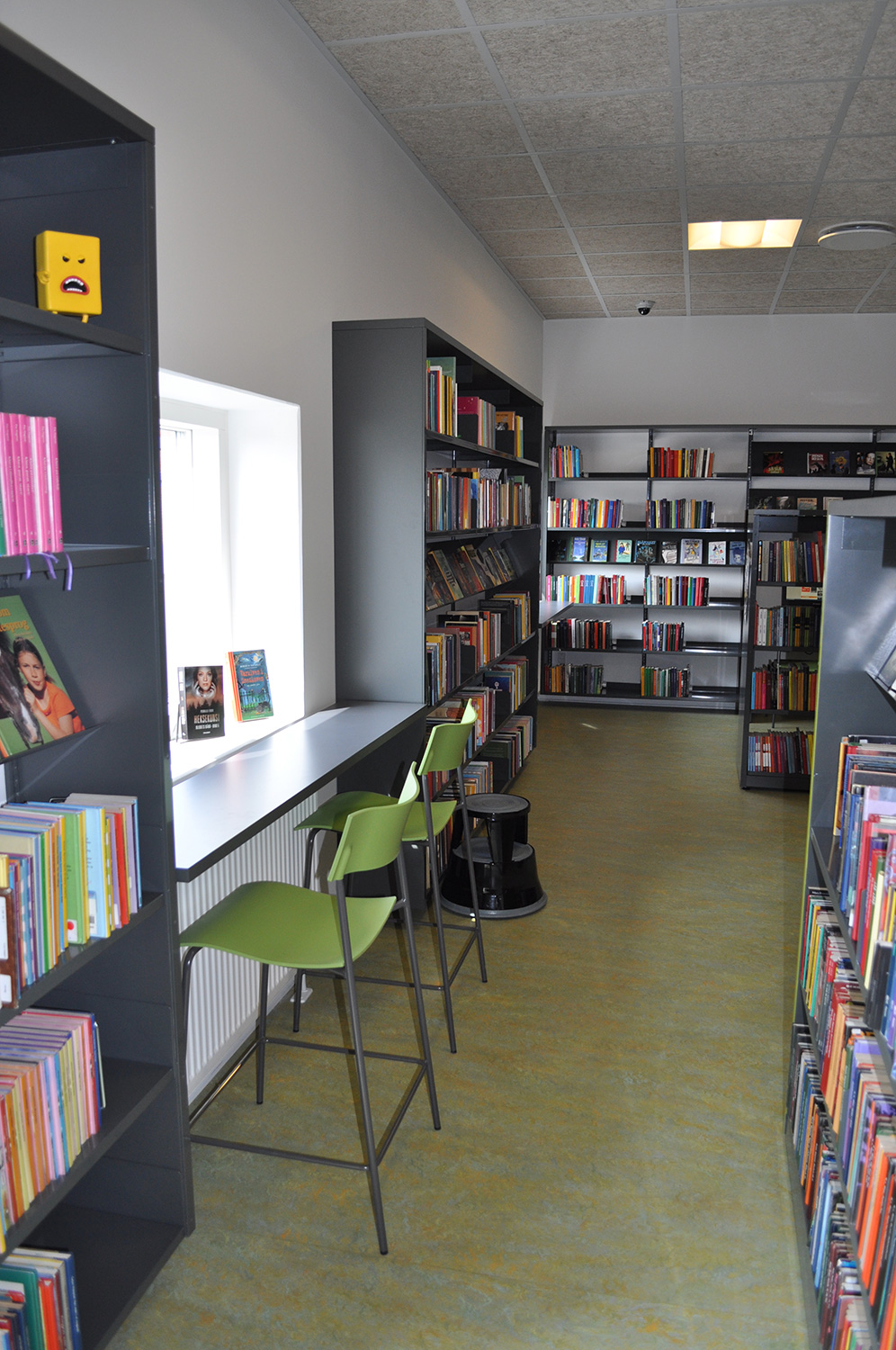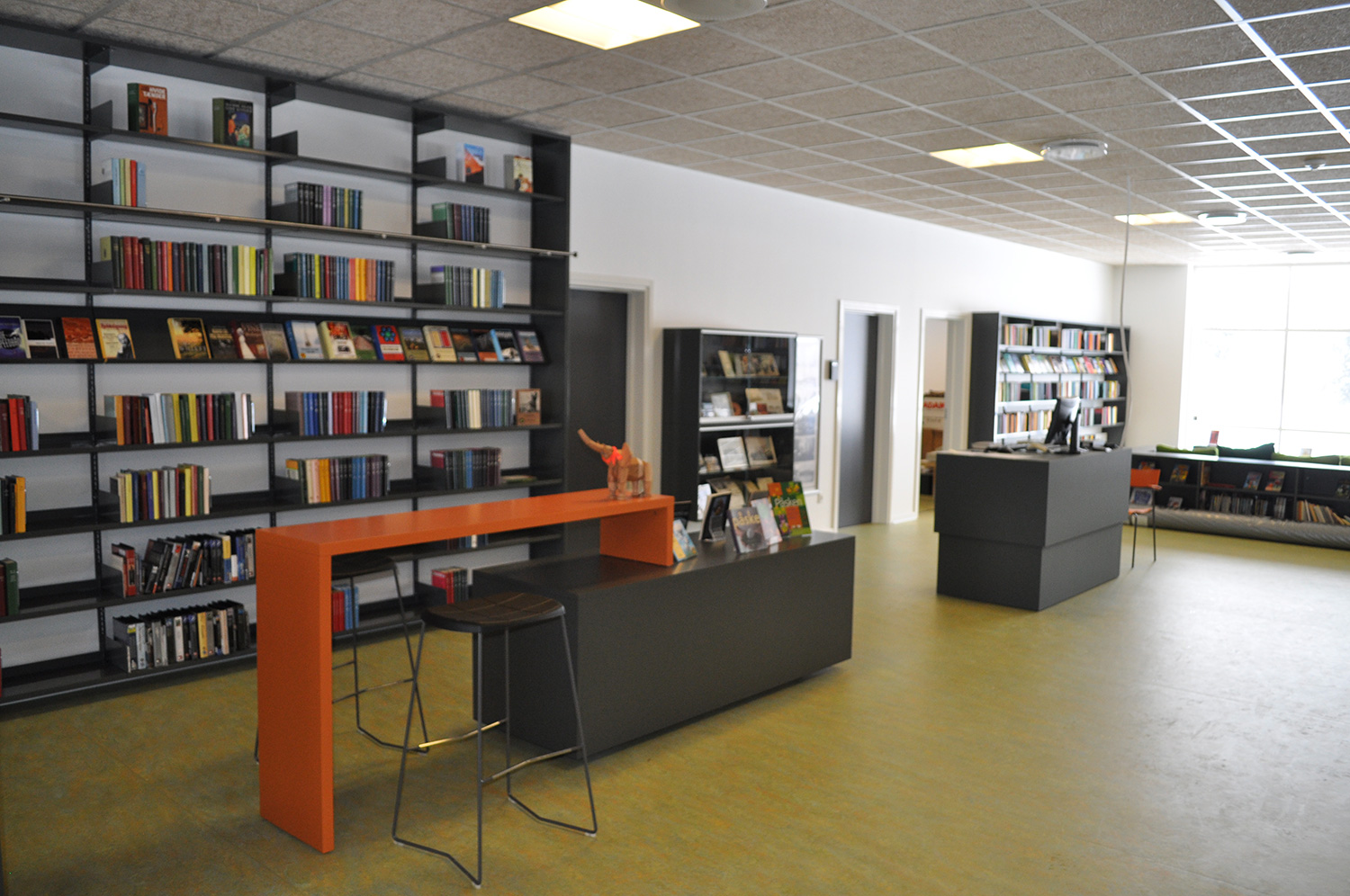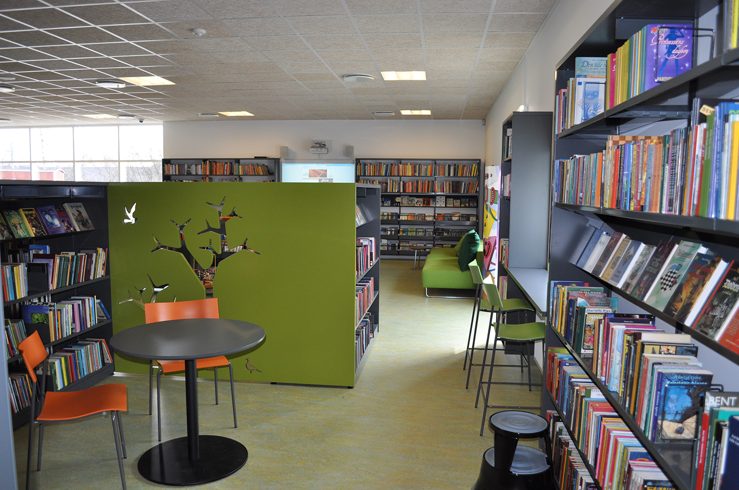 Det har en personlig stil och en hemtrevlig atmosfär med specialtillverkade hyllor, integrerade datorbord och många andra skräddarsydda lösningar. Till exempel färgrika väggar mellan hyllorna som skapar roliga avskärmade ytor för besökarna.
