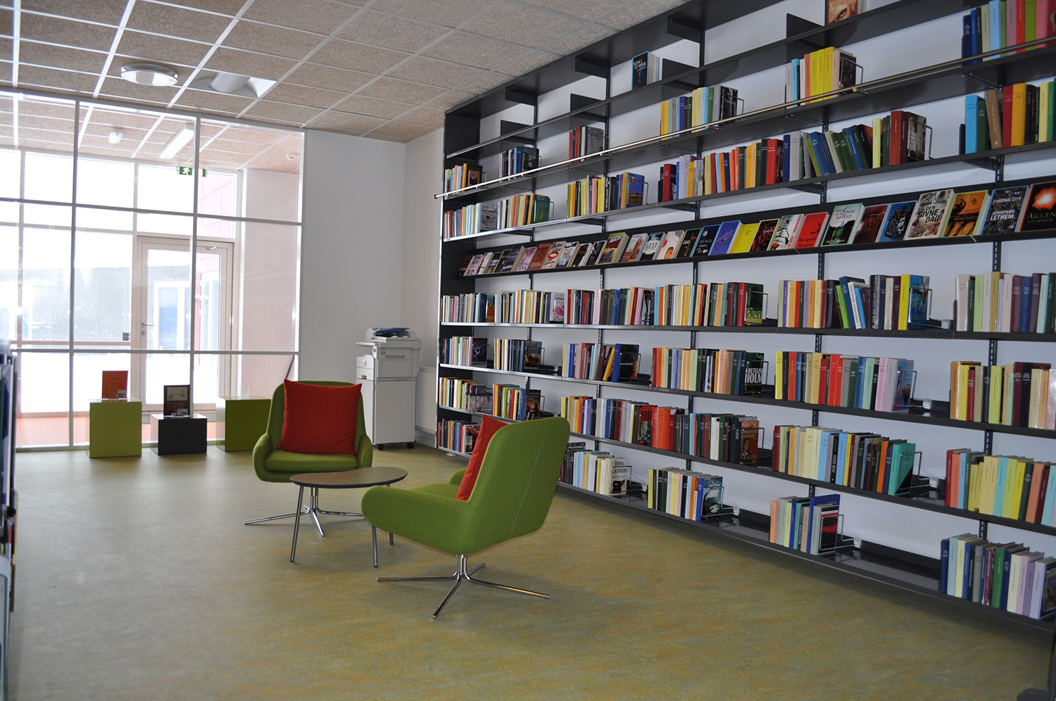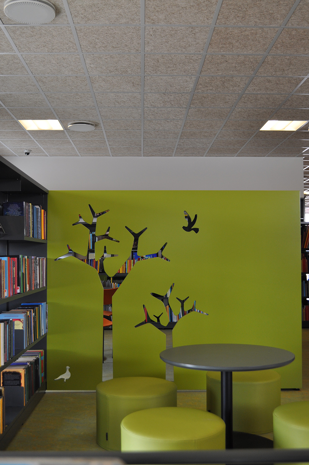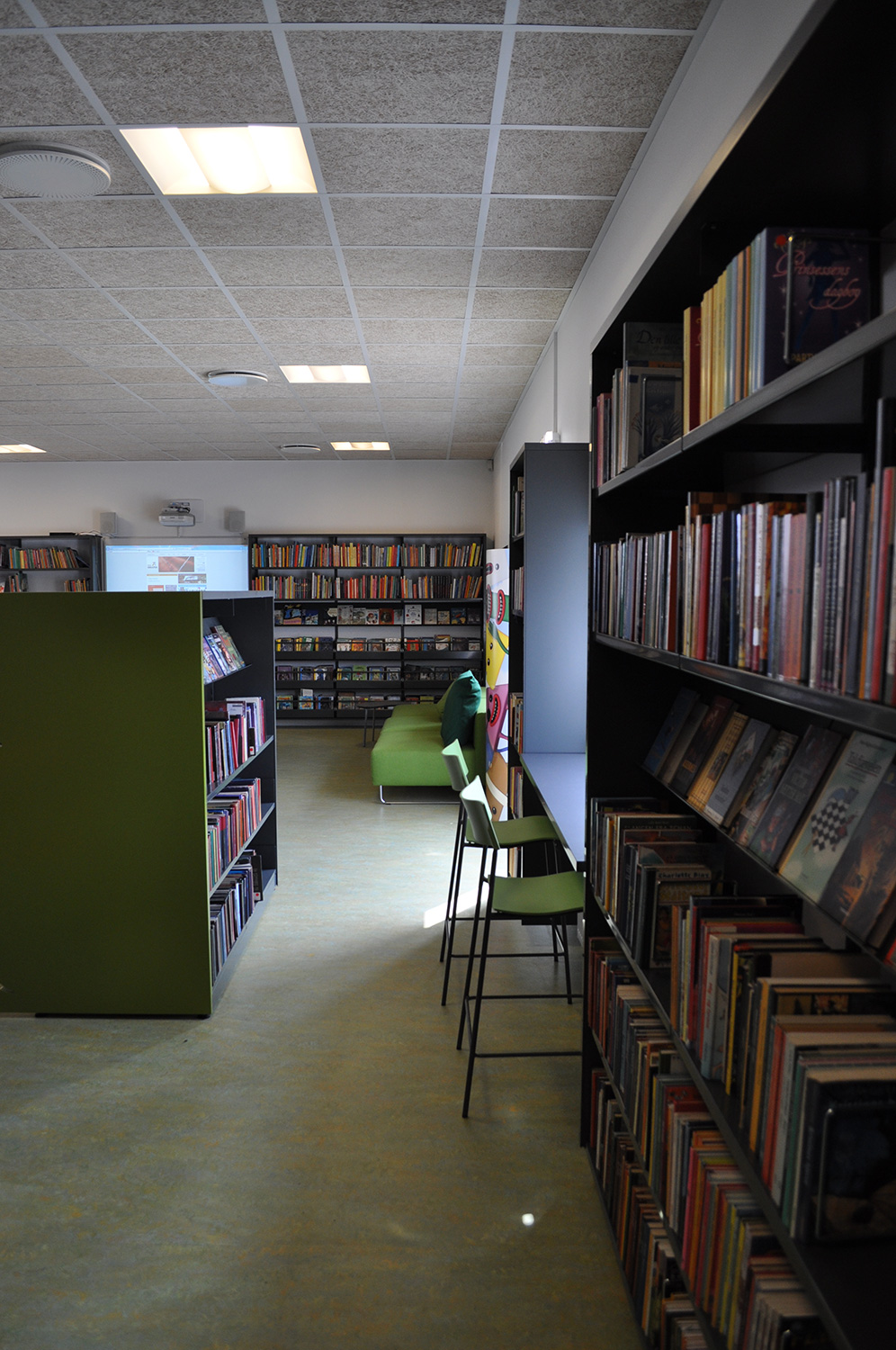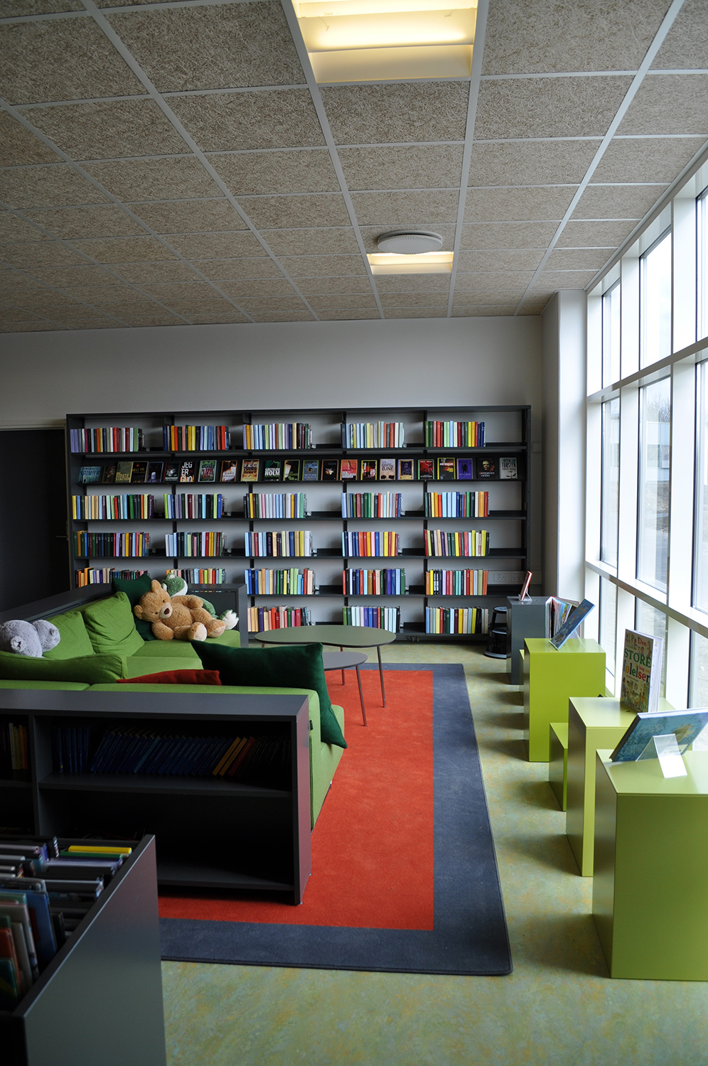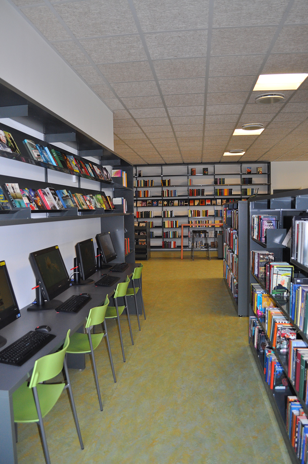 Det har en personlig stil och en hemtrevlig atmosfär med specialtillverkade hyllor, integrerade datorbord och många andra skräddarsydda lösningar. Till exempel färgrika väggar mellan hyllorna som skapar roliga avskärmade ytor för besökarna.