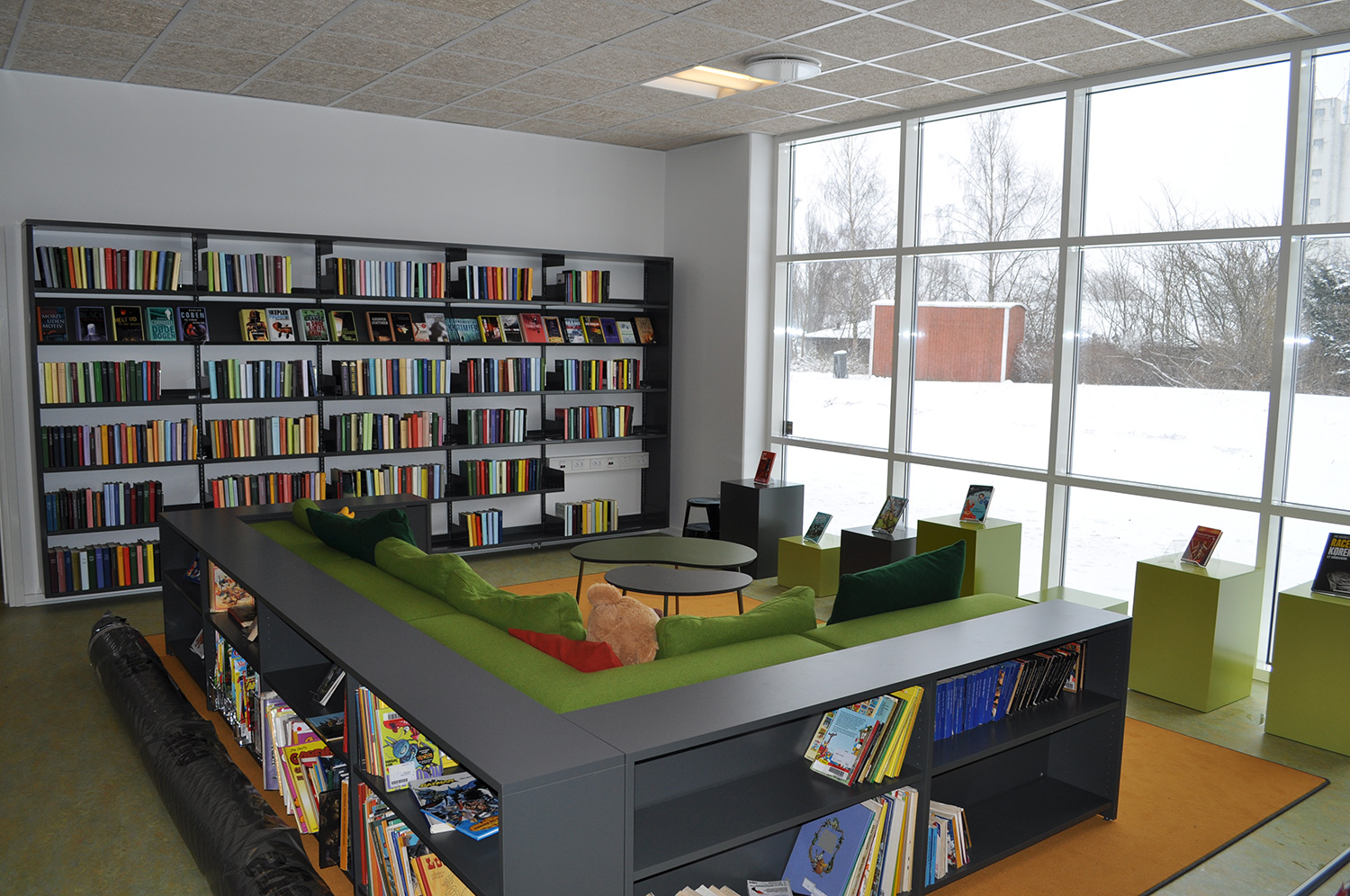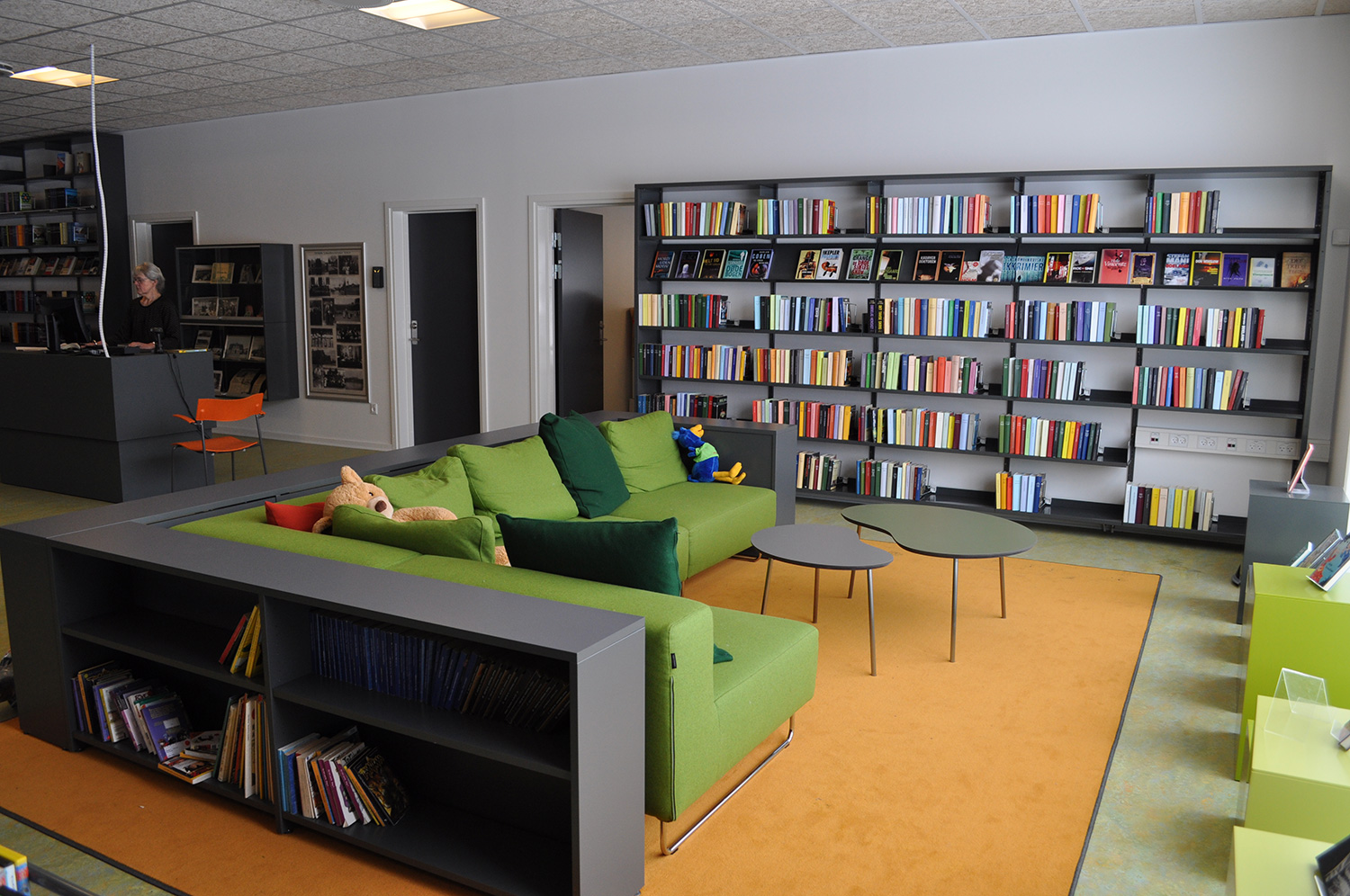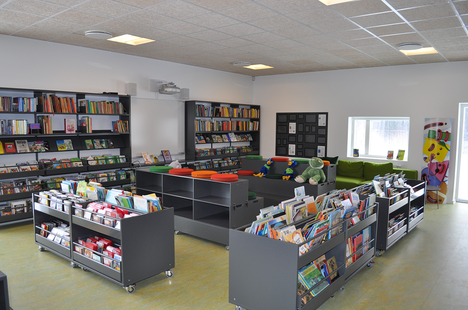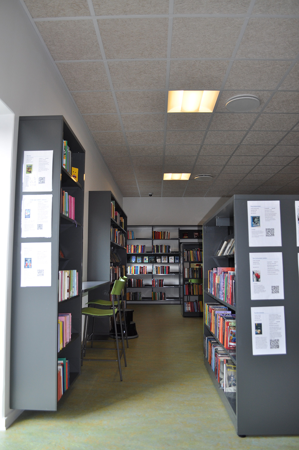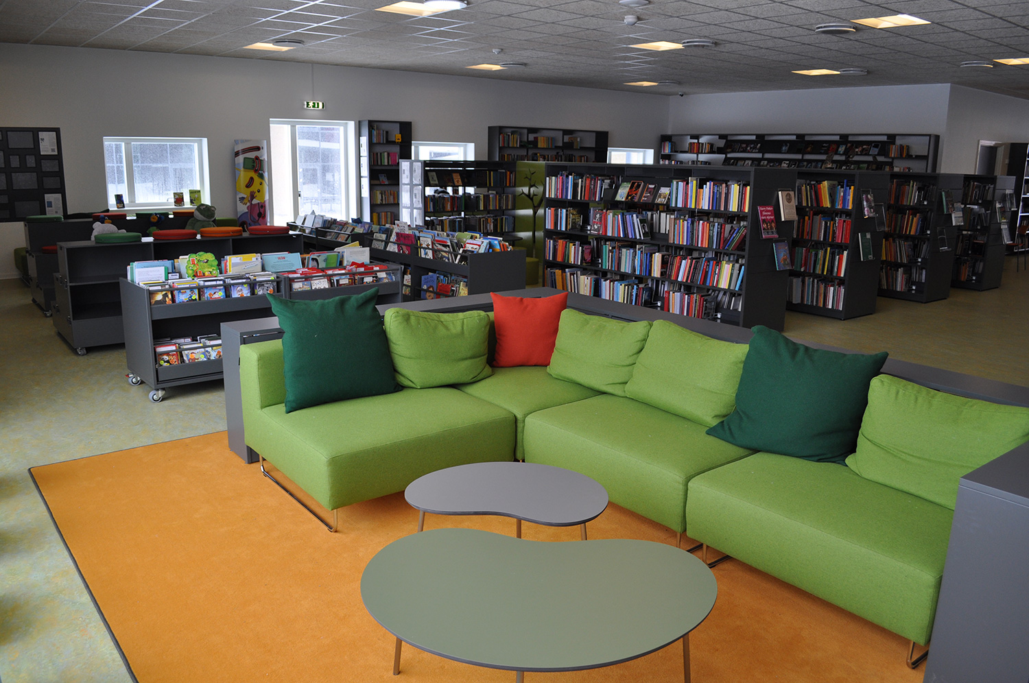 Det har en personlig stil och en hemtrevlig atmosfär med specialtillverkade hyllor, integrerade datorbord och många andra skräddarsydda lösningar. Till exempel färgrika väggar mellan hyllorna som skapar roliga avskärmade ytor för besökarna.