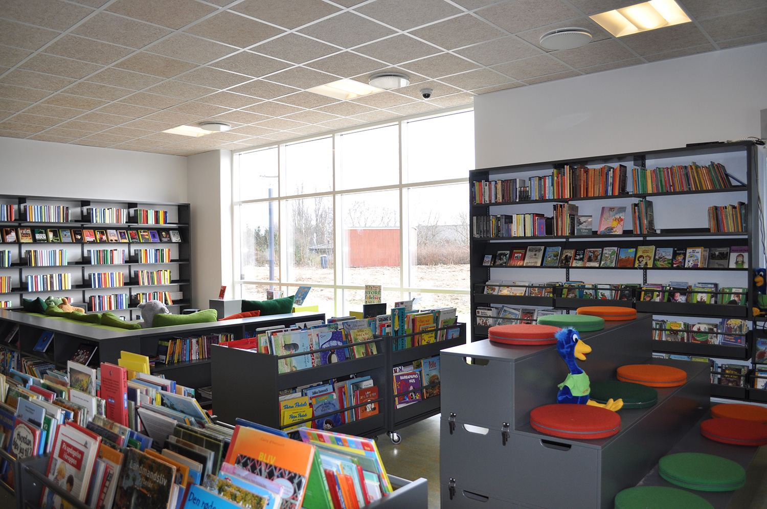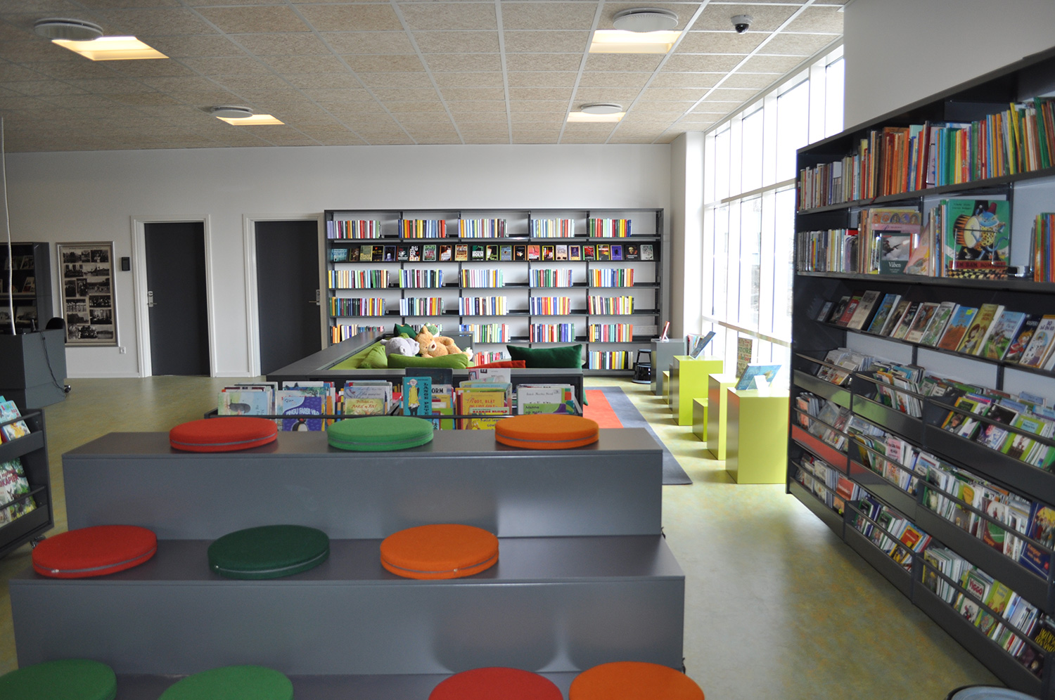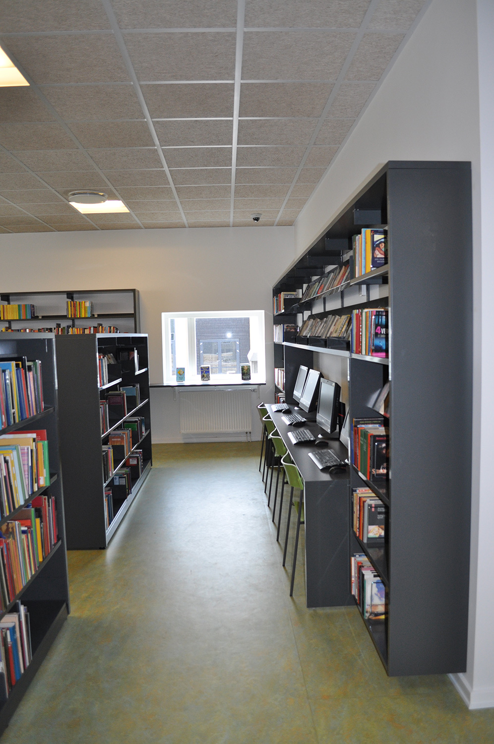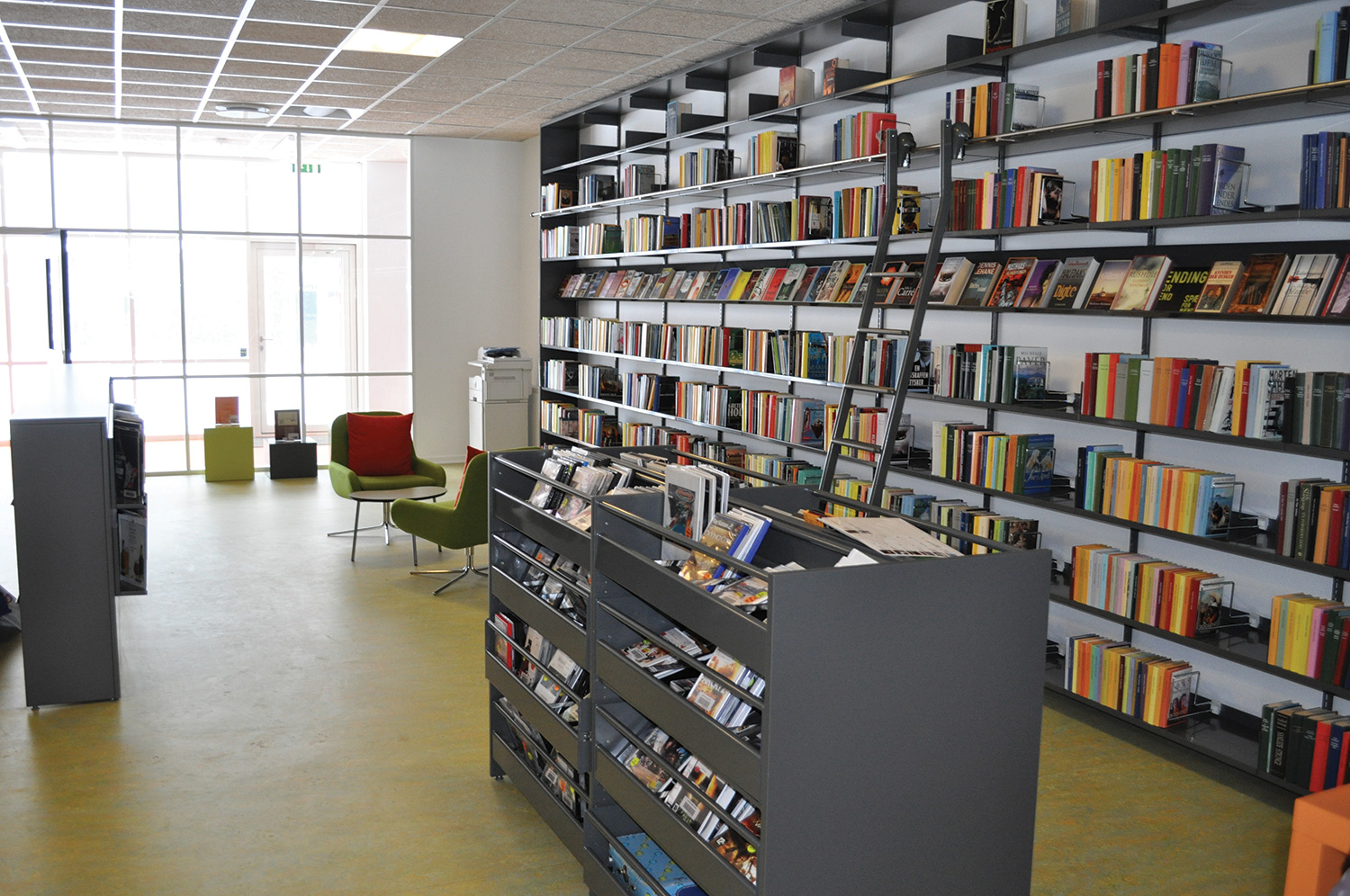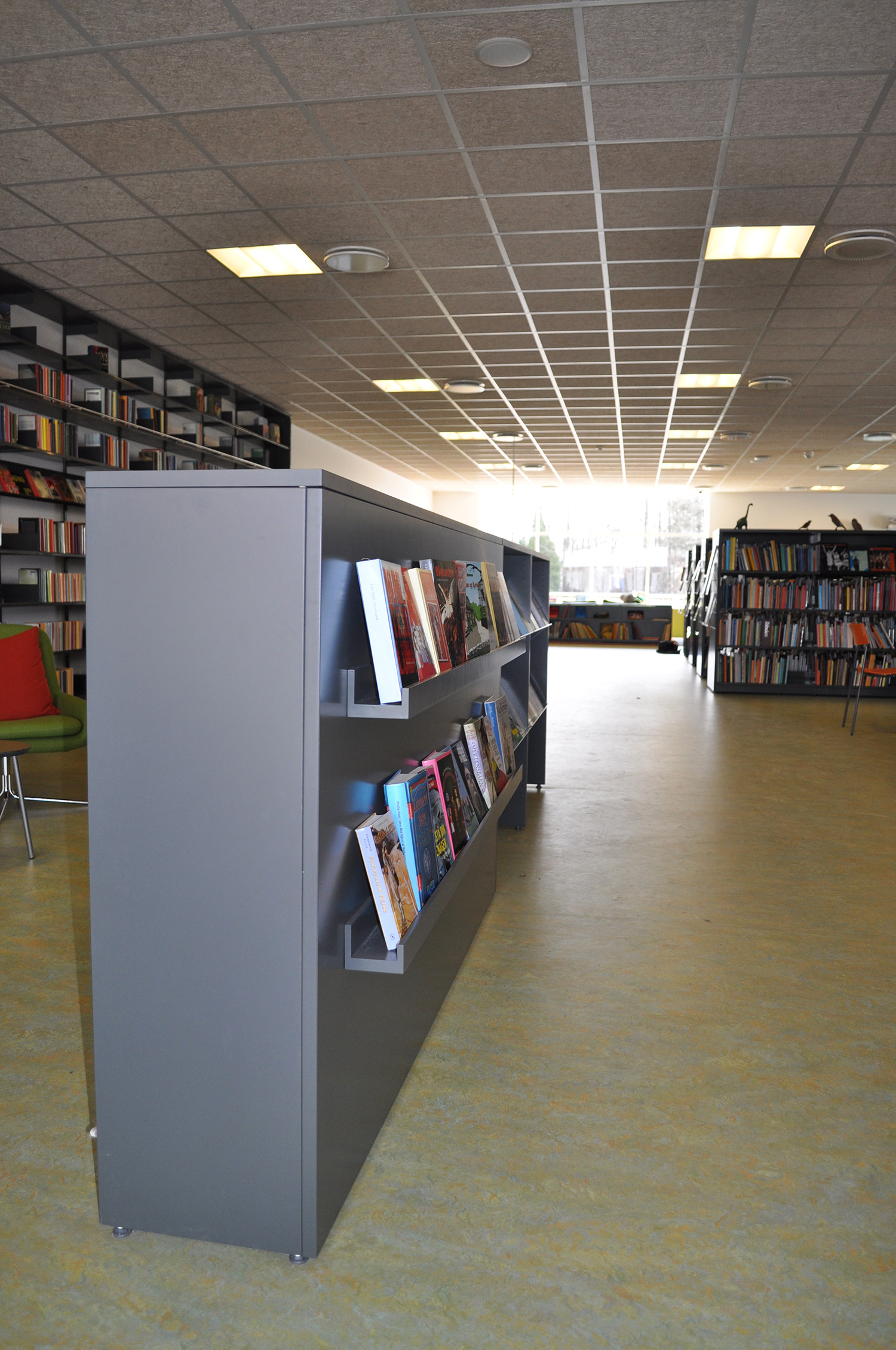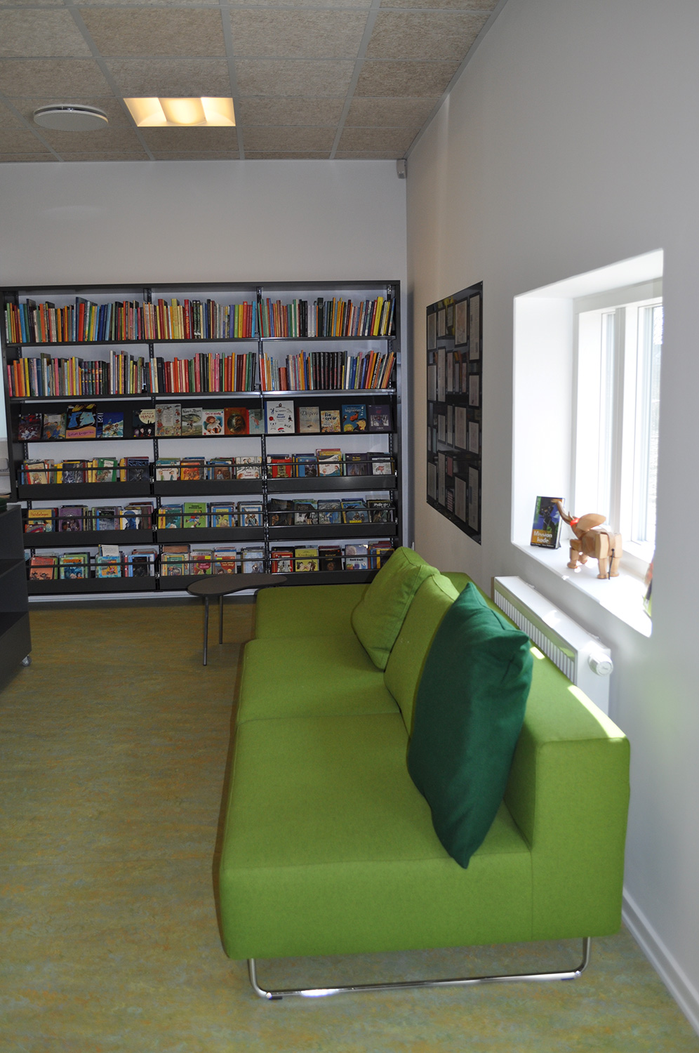 Det har en personlig stil och en hemtrevlig atmosfär med specialtillverkade hyllor, integrerade datorbord och många andra skräddarsydda lösningar. Till exempel färgrika väggar mellan hyllorna som skapar roliga avskärmade ytor för besökarna.