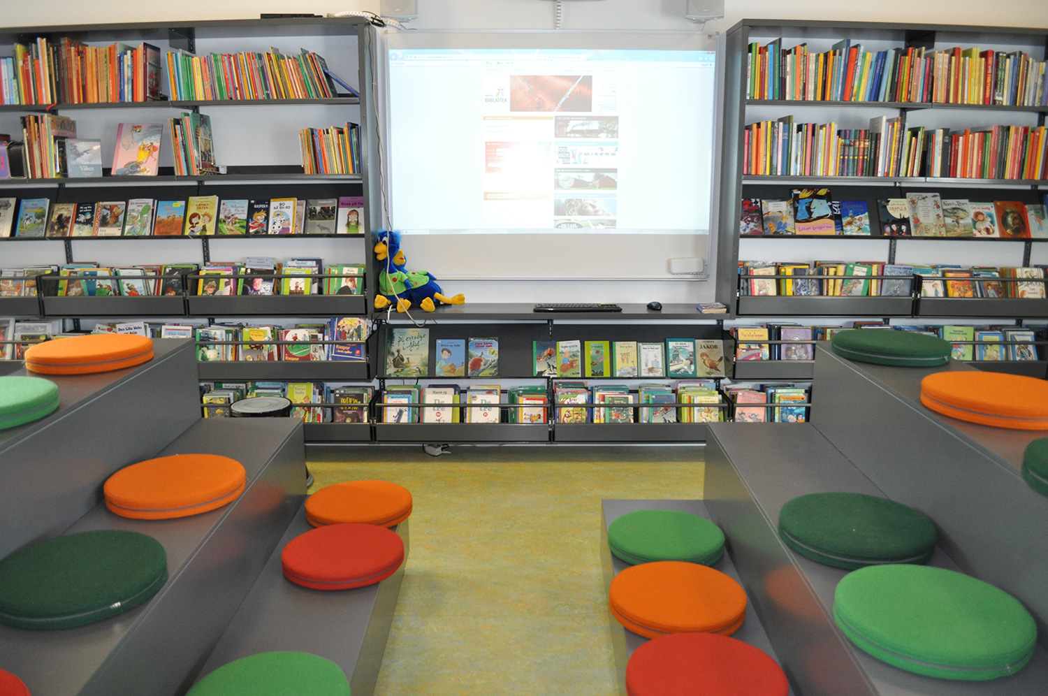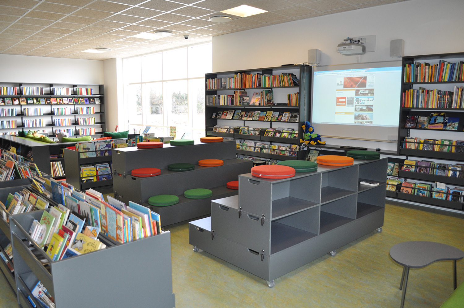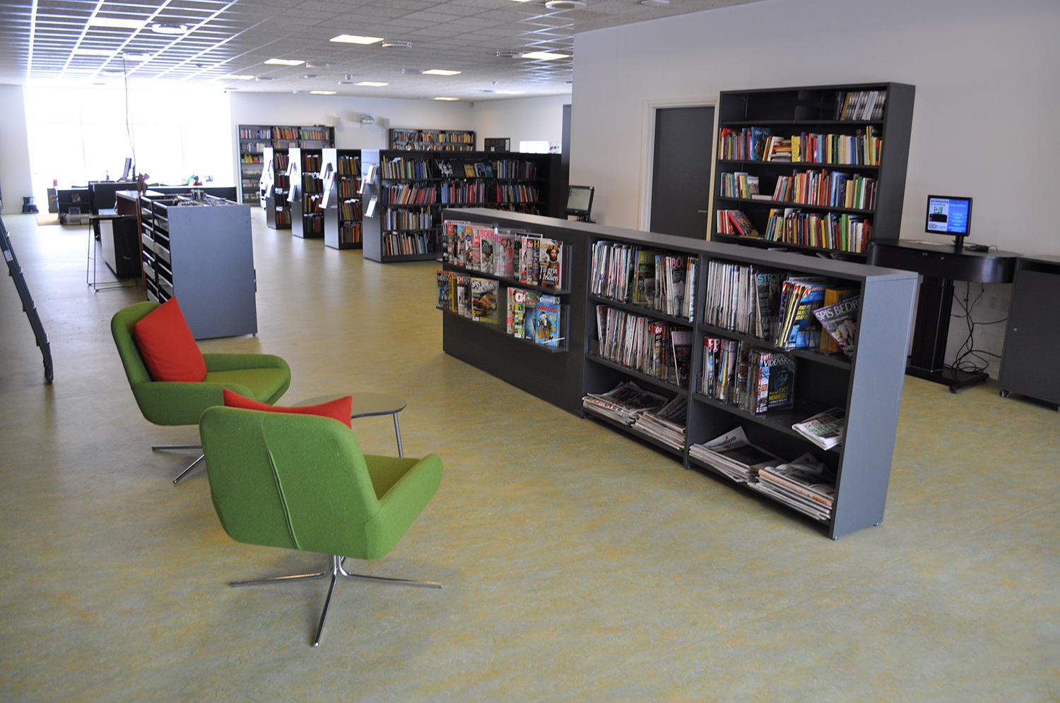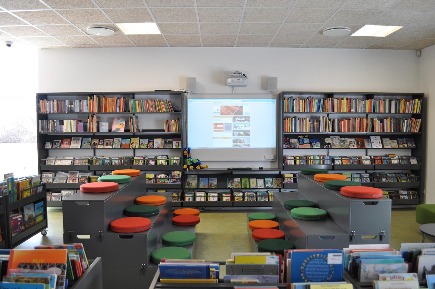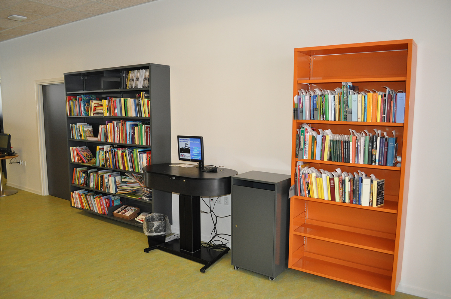 Det har en personlig stil och en hemtrevlig atmosfär med specialtillverkade hyllor, integrerade datorbord och många andra skräddarsydda lösningar. Till exempel färgrika väggar mellan hyllorna som skapar roliga avskärmade ytor för besökarna.