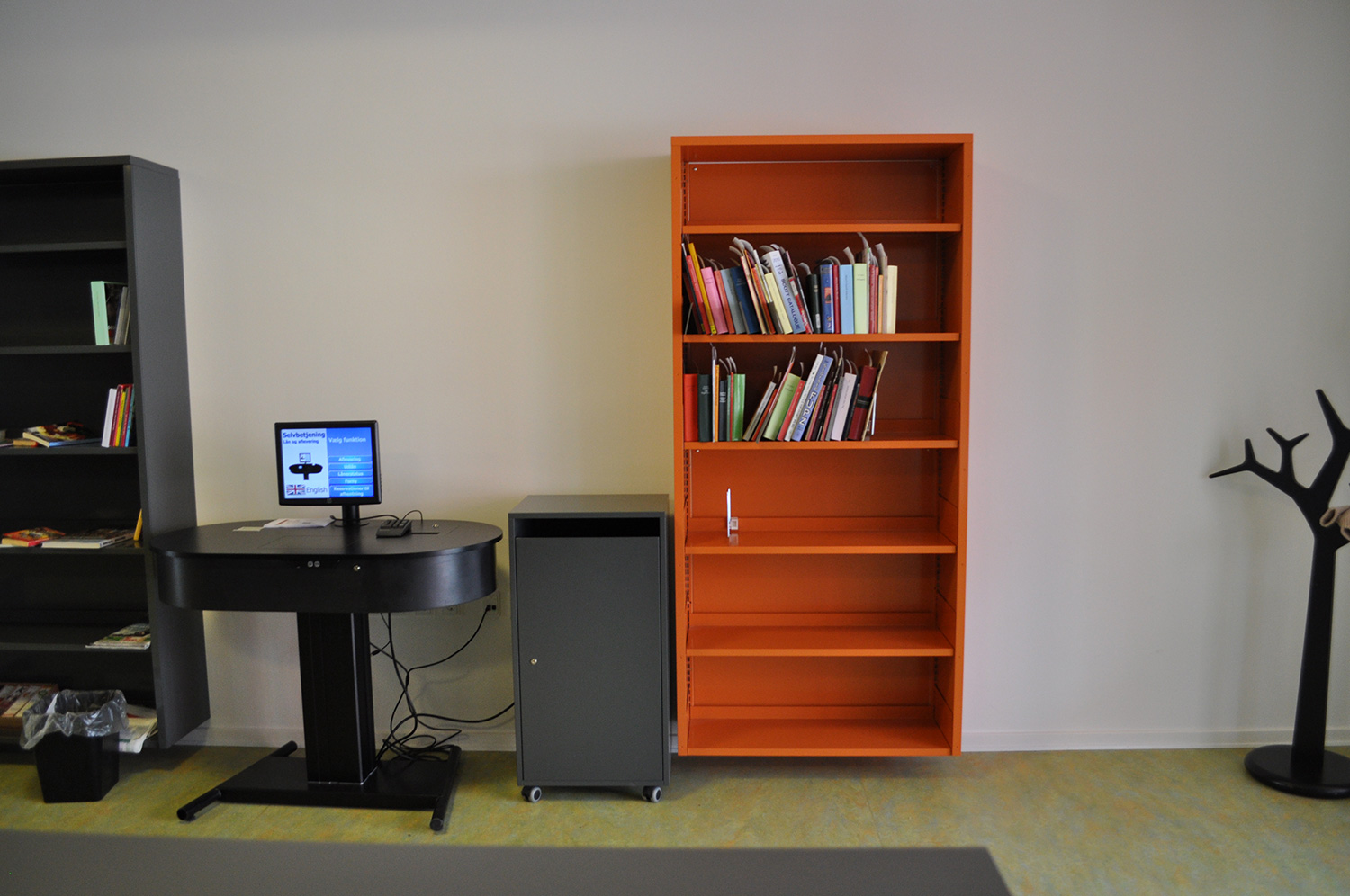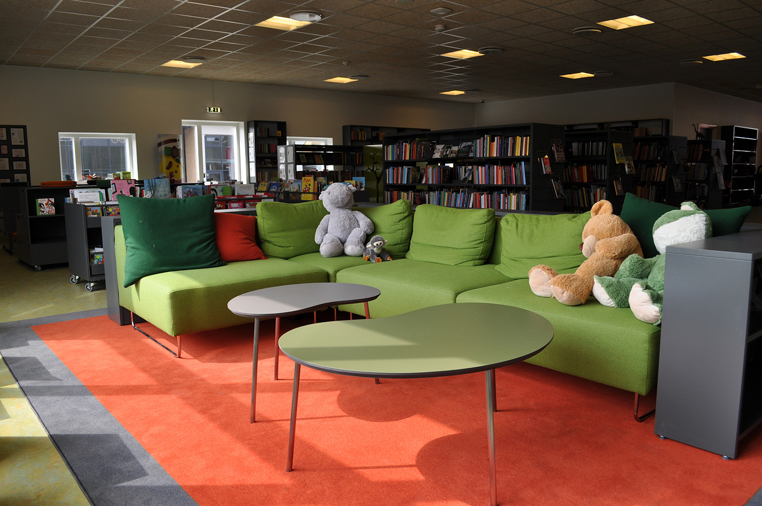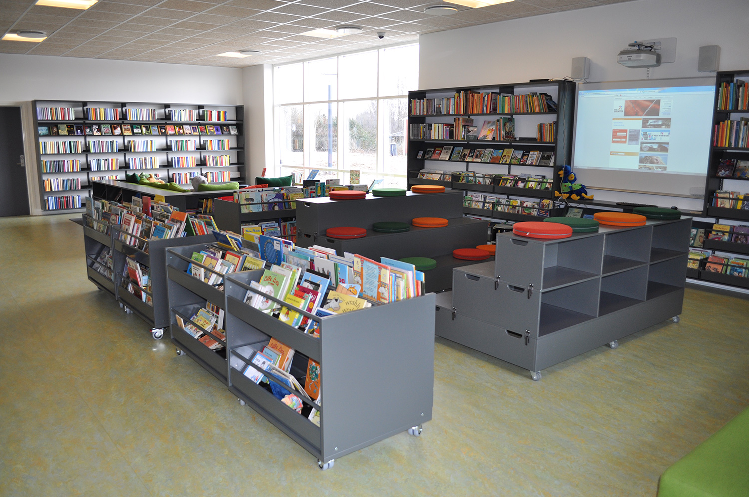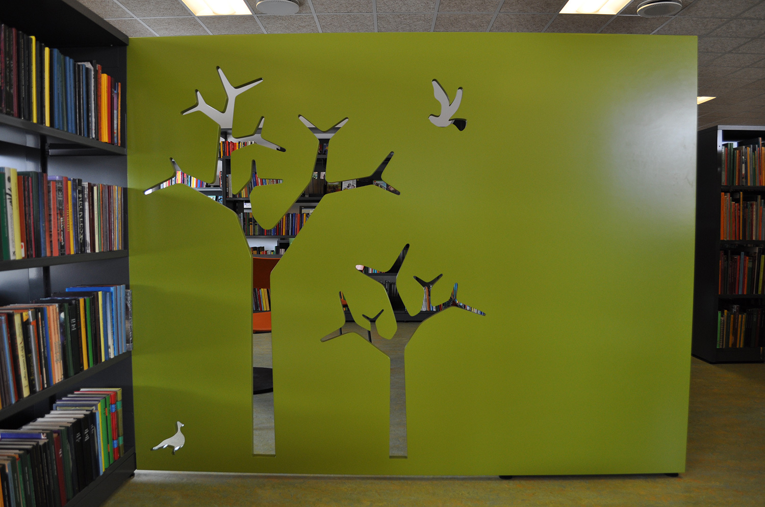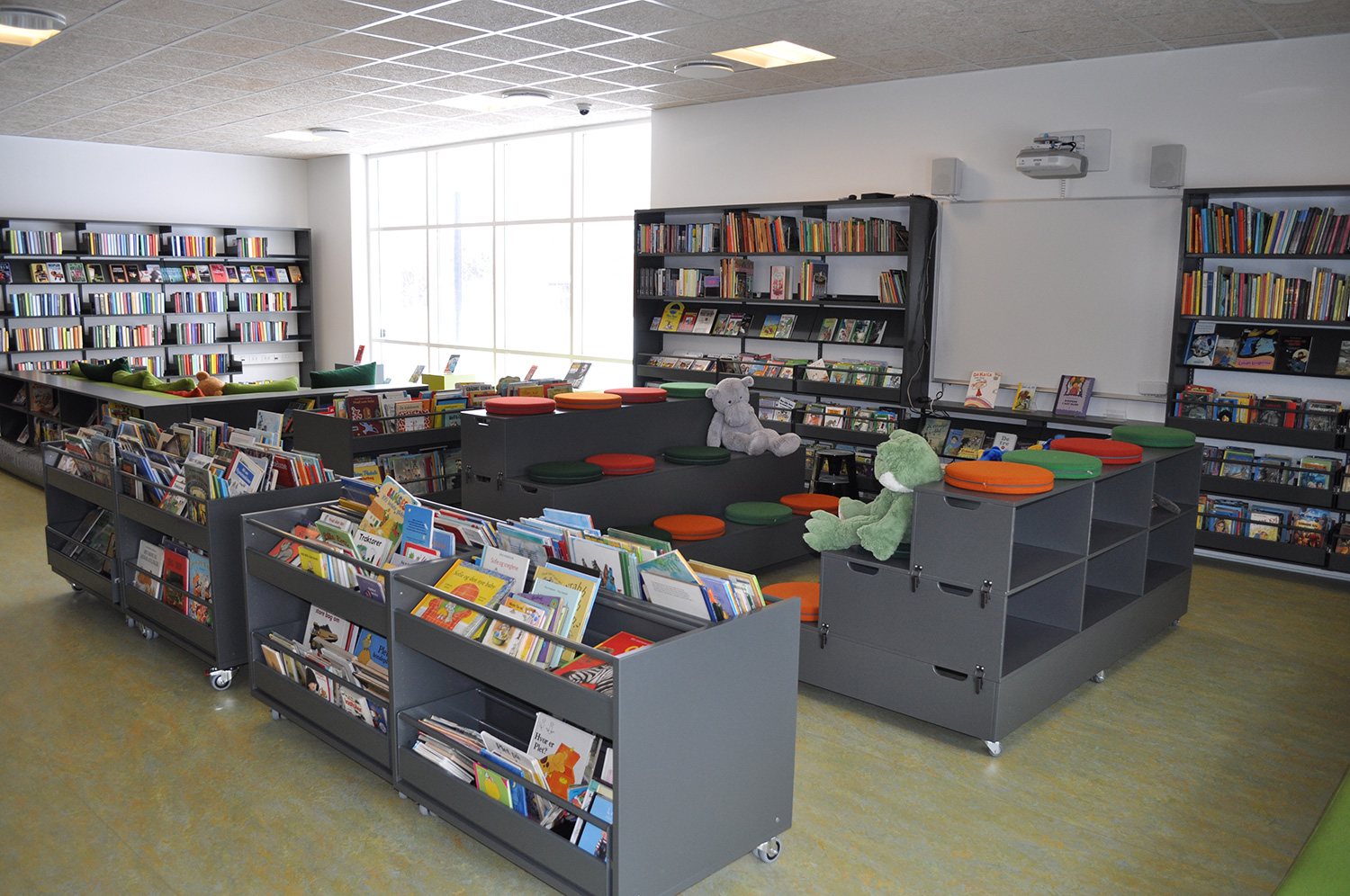 Det har en personlig stil och en hemtrevlig atmosfär med specialtillverkade hyllor, integrerade datorbord och många andra skräddarsydda lösningar. Till exempel färgrika väggar mellan hyllorna som skapar roliga avskärmade ytor för besökarna.