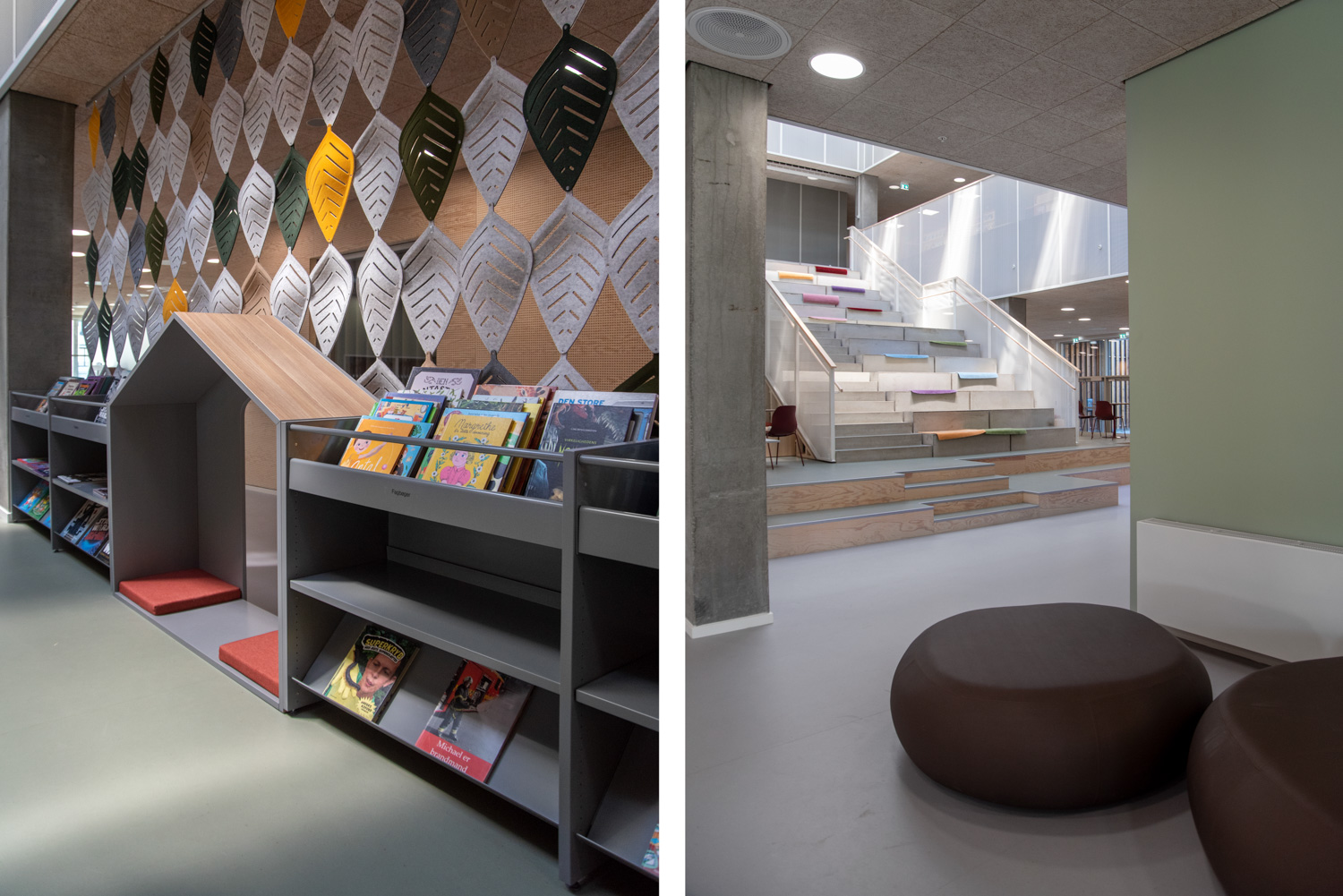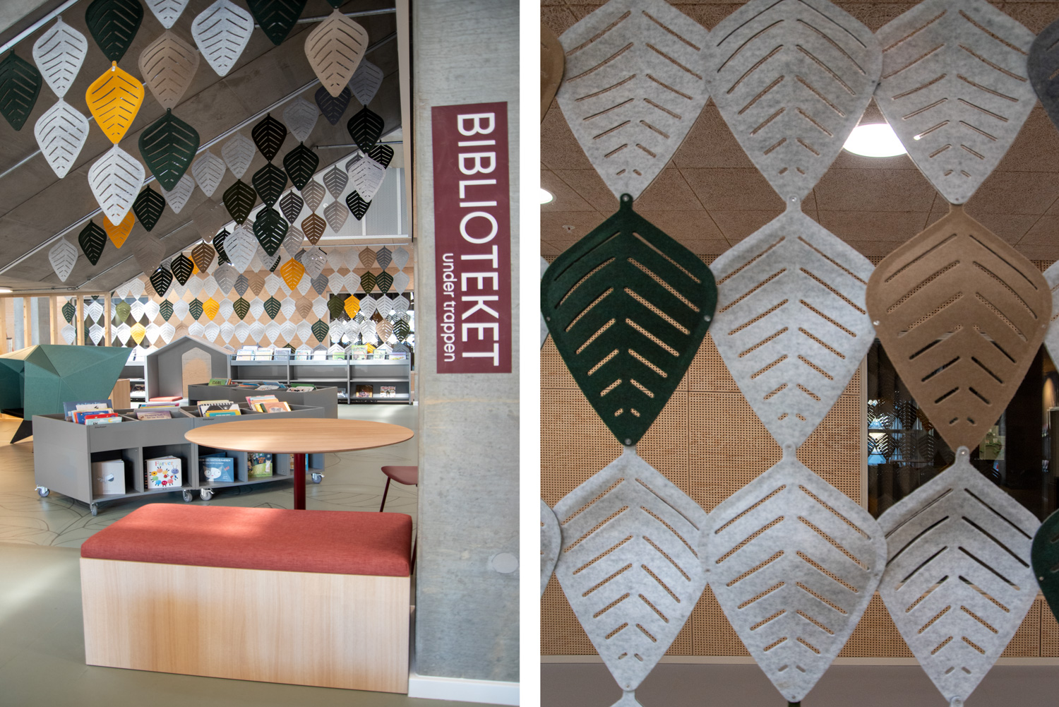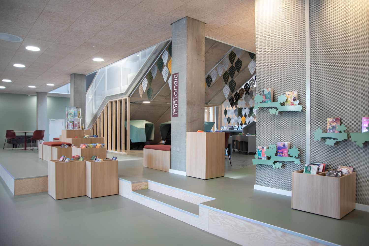 Området utmärker sig med sina många dekorativa element som skapar ett lekande, biofilt uttryck samtidigt som det naturligt faller in i helheten eftersom färgerna valts med respekt för kulturhusets varma färgskala av röda och blågröna färger.
