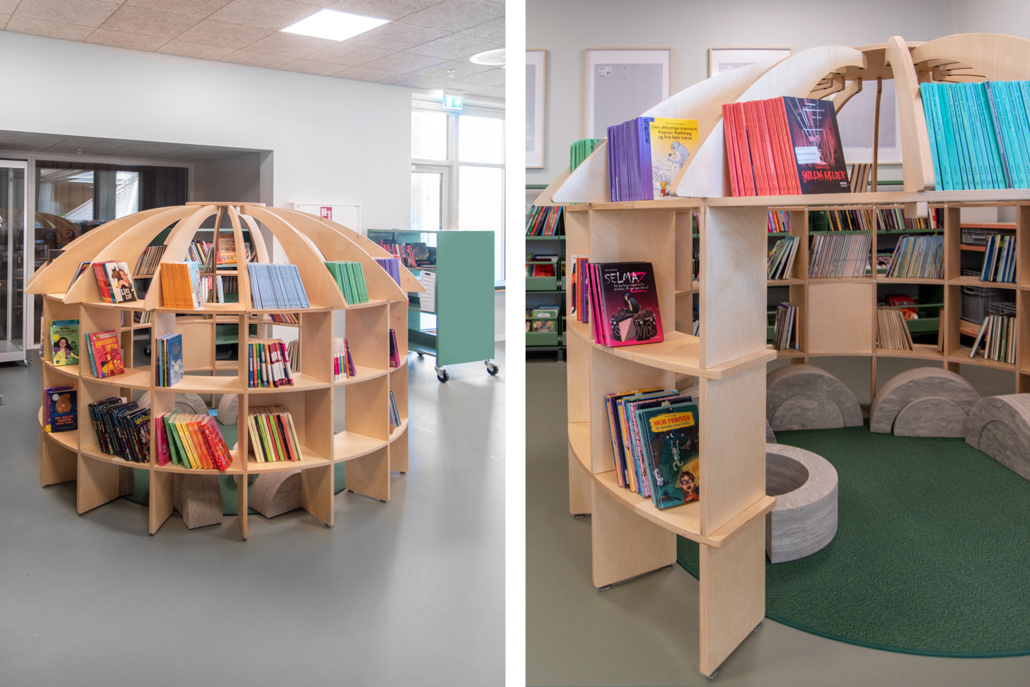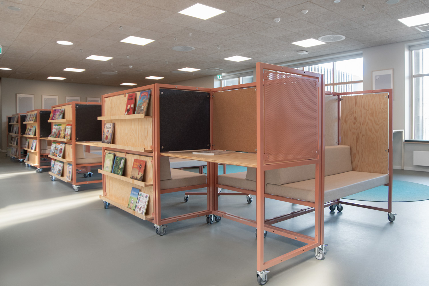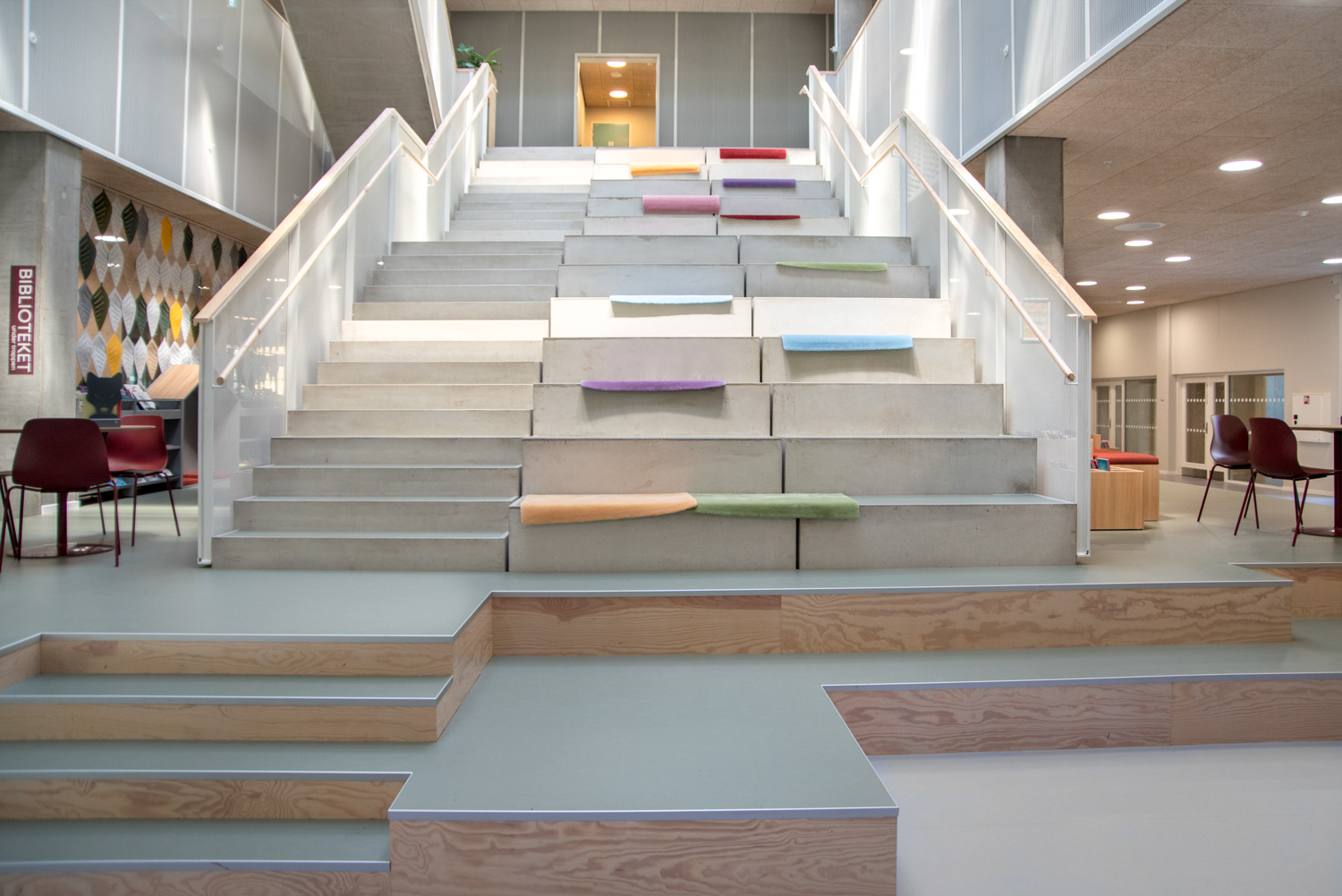 ”Biblioteket under trappan” fungerar därför också som ett väntområde för dem som använder idrottshallarna. Exponeringspodierna med inbyggda sittplatser öppnar upp mot Kultursalen och uppmuntrar besökarna till att tillbringa tid bland böckerna. Du väljer själv om du vill rikta uppmärksamheten mot husets aktiviteter eller dra dig tillbaka till en av läsgrottorna.