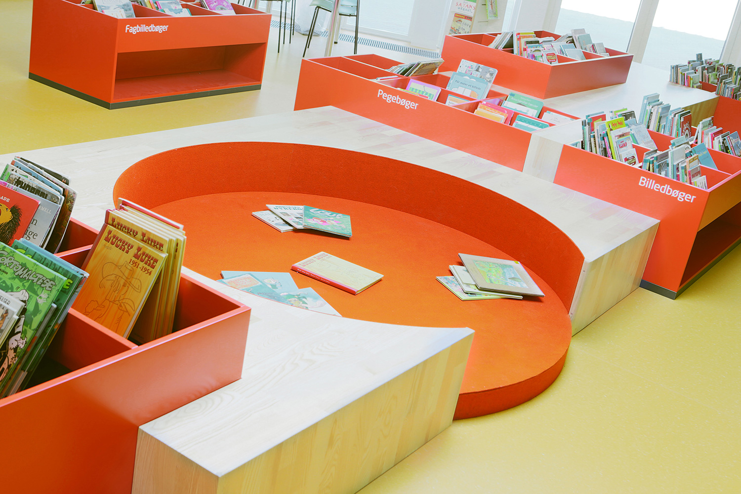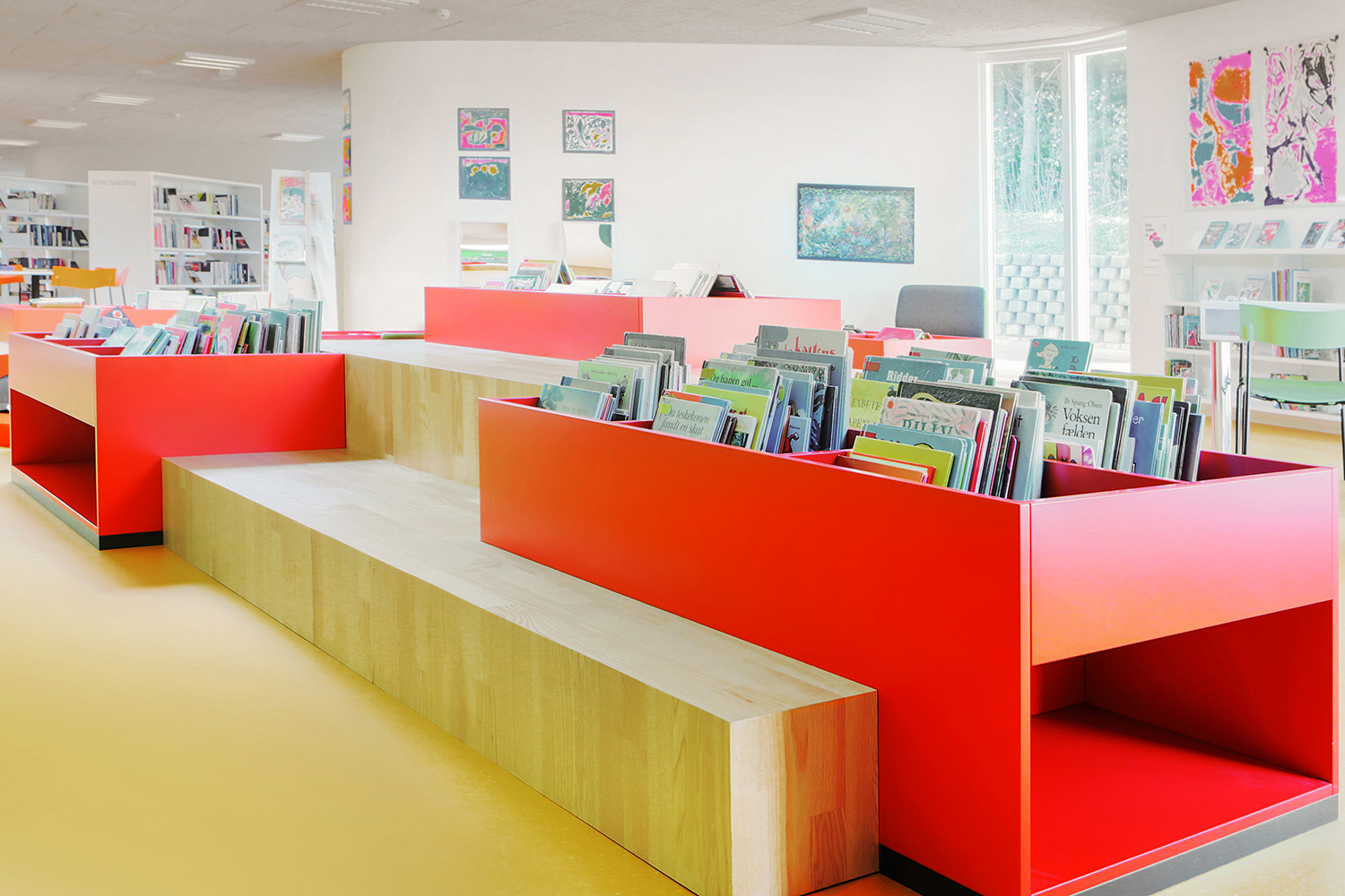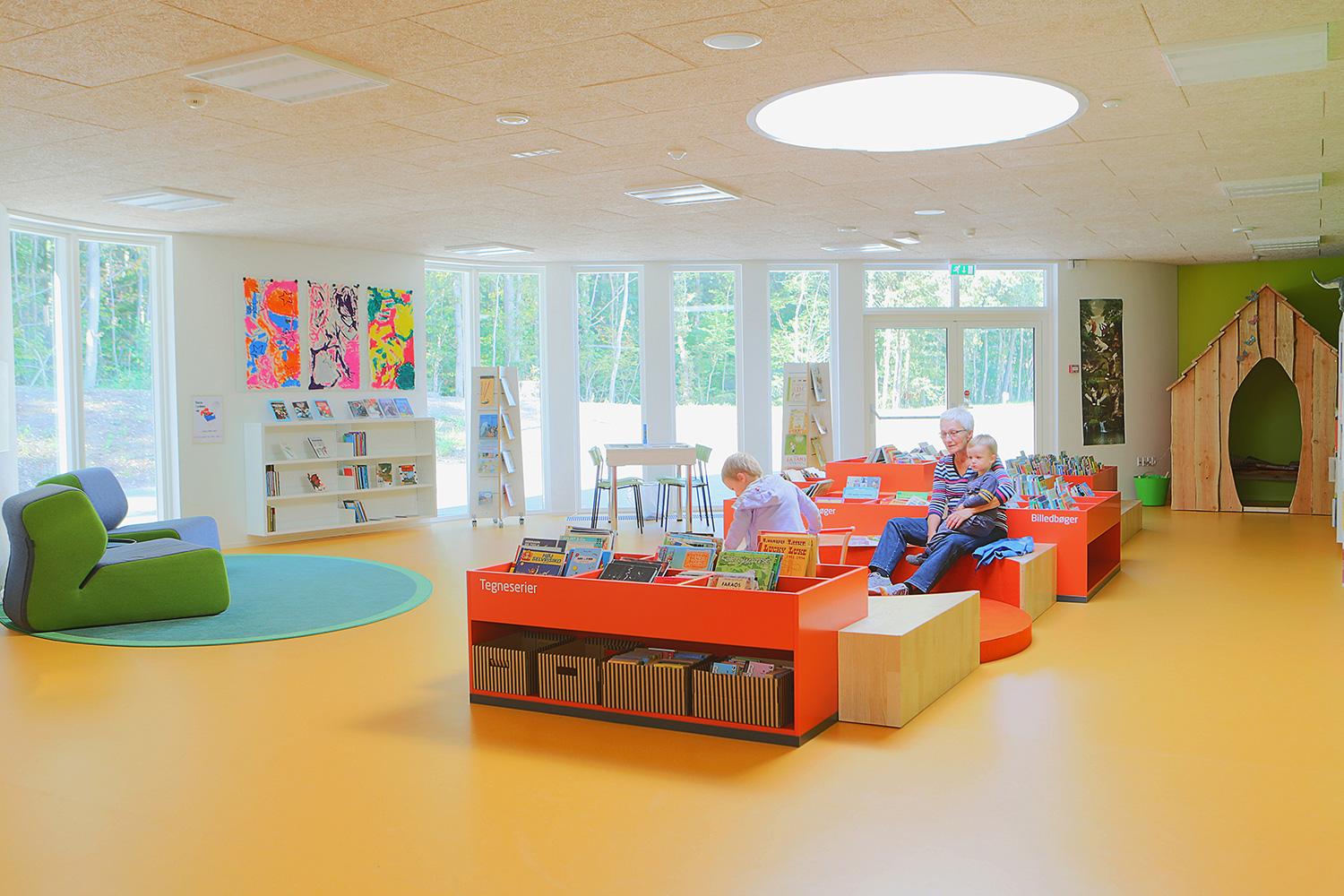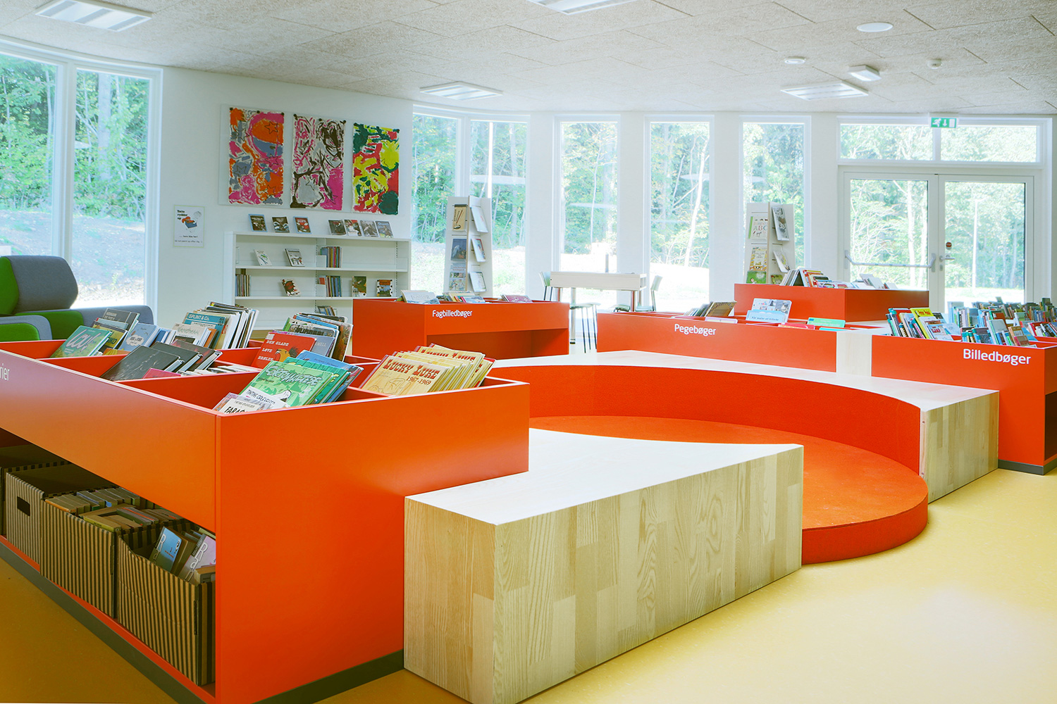 I barnavdelningen finns en stor specialritad lek-sittmöbel med inbyggda bilderbokslådor. Vägghängda hyllor i förskjutna höjder skapar dynamik i rummet. Mobila orange utställningsmoduler är placerade i hyllorna för att väcka uppmärksamhet för utvalda ämnen eller för att skapa mindre specialutställningar.