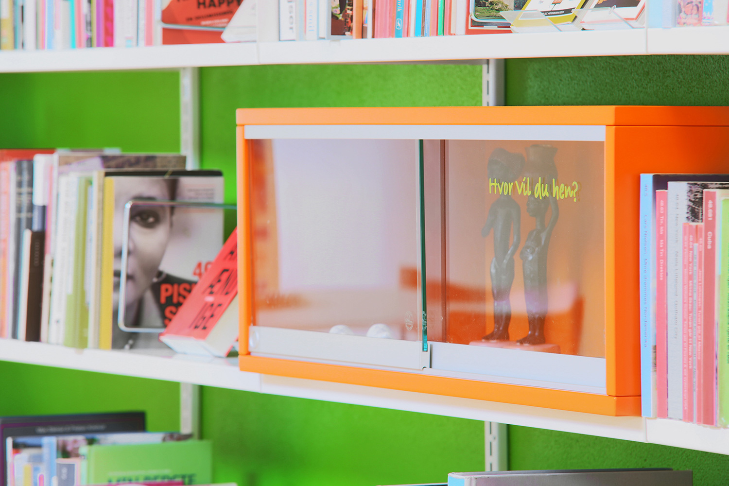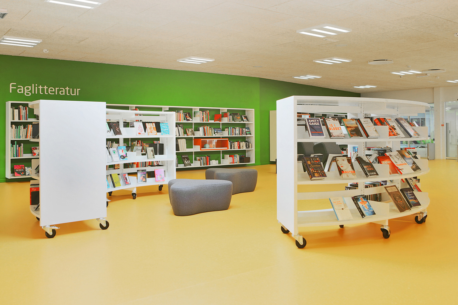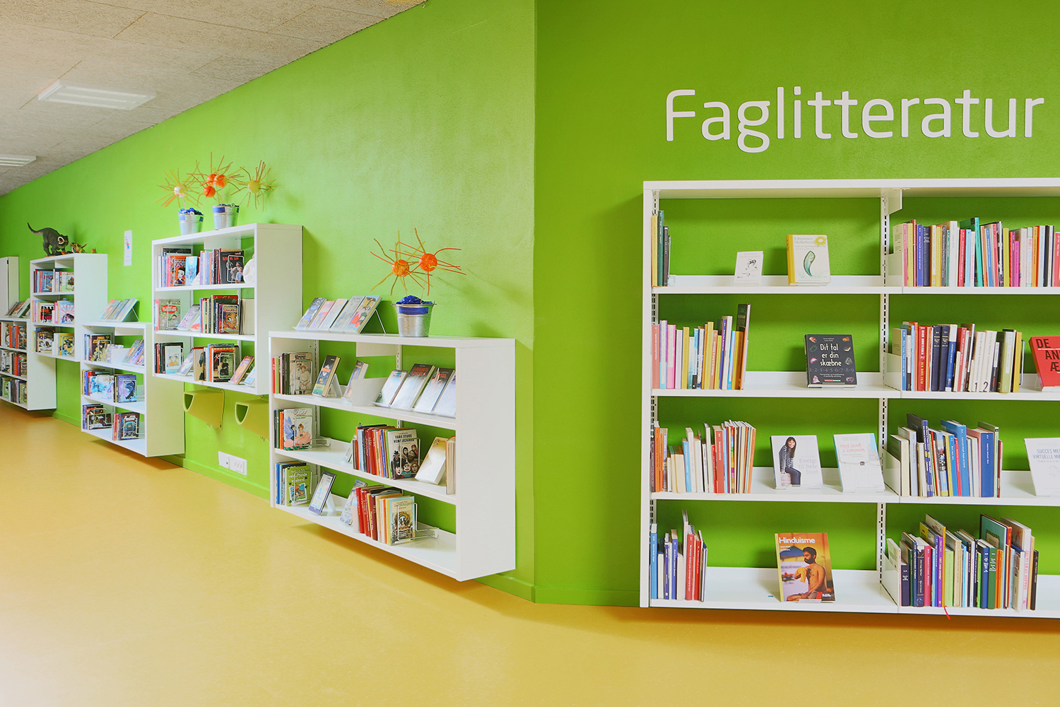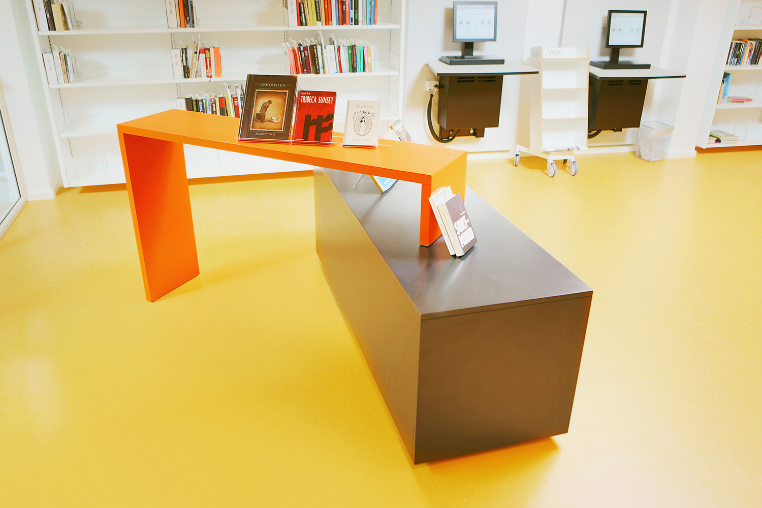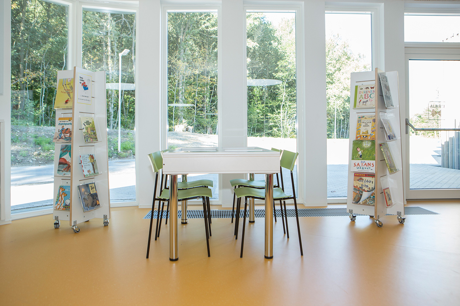 I barnavdelningen finns en stor specialritad lek-sittmöbel med inbyggda bilderbokslådor. Vägghängda hyllor i förskjutna höjder skapar dynamik i rummet. Mobila orange utställningsmoduler är placerade i hyllorna för att väcka uppmärksamhet för utvalda ämnen eller för att skapa mindre specialutställningar.