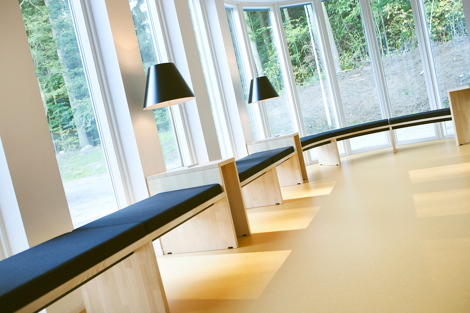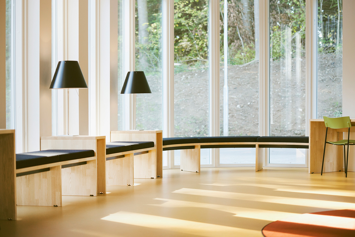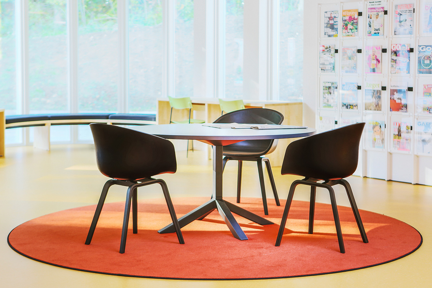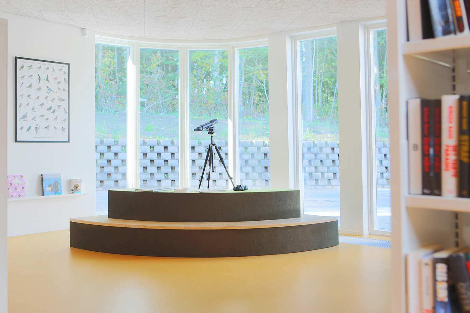 Naturen står också i fokus för bibliotekets inredning. Ett exempel är att det längs fönsterpartiet placerats projektanpassade möbler i ask där dagsljuset utnyttjas till fullo. Dessutom ger en specialproducerad utkikstrappa klädd med filt möjlighet att betrakta naturen på närmare håll. Naturens gröna färger dras in i biblioteket och harmonierar med de övriga gula och orange färgerna.