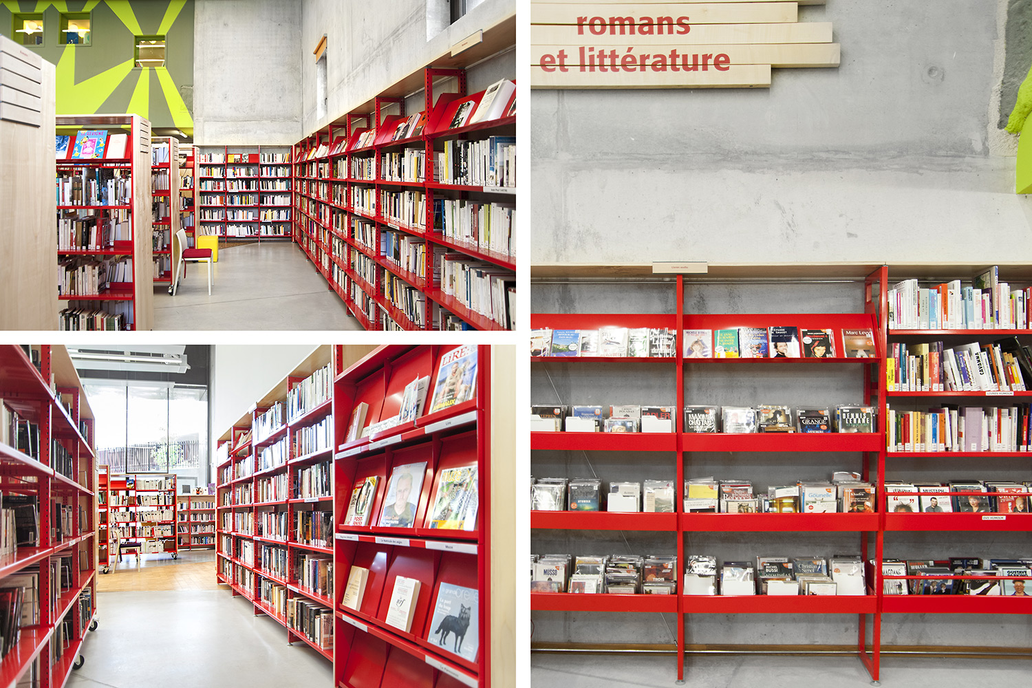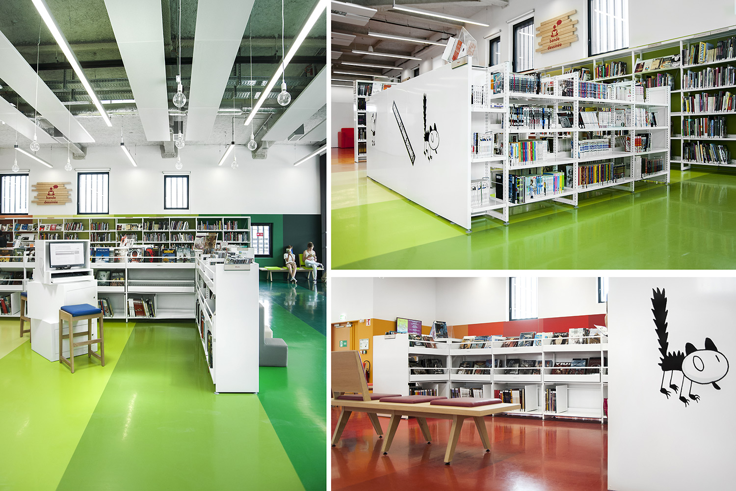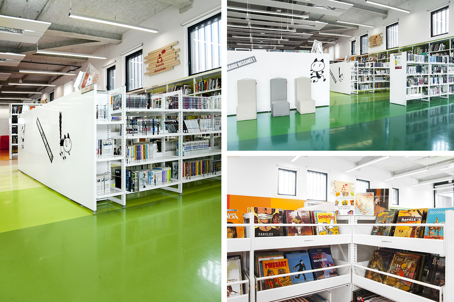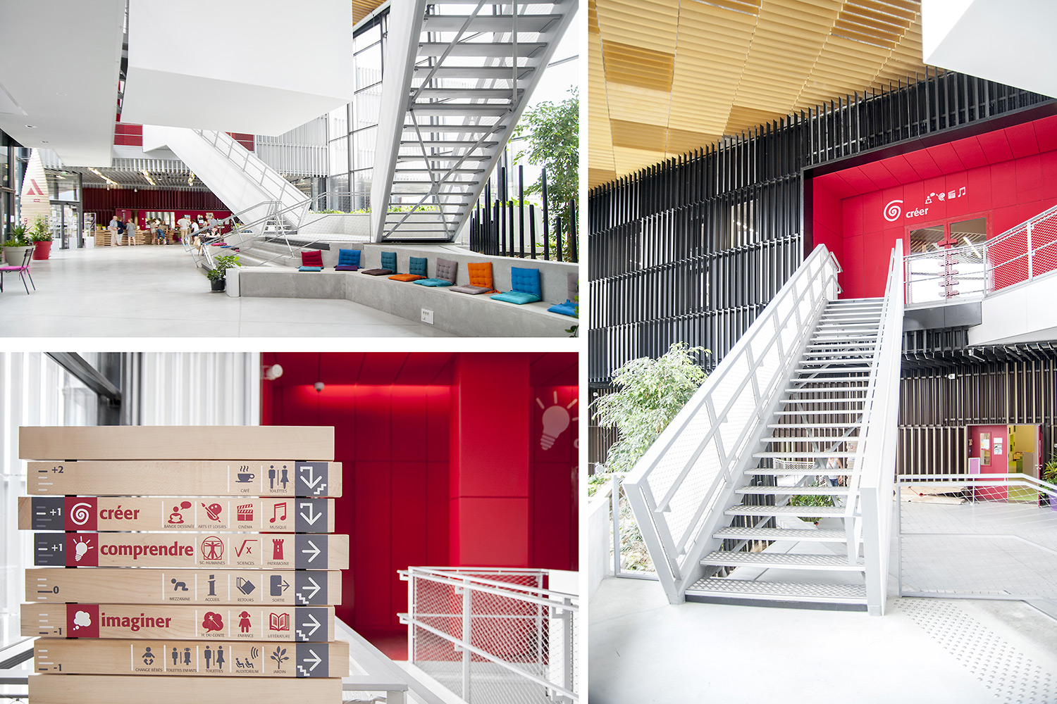 ”Skapande” är ett utrymme dedikerat till seriealbum, film, musik och konst. ”Förståelse” täcker kunskapsområden med plats för det nedtecknade kulturarvet och då även specifikt Chareneregionens historia. Här finns både offentliga och privata utrymmen för läsning och studier. Avdelningen ”Fantasi” sammanför barn- och litteratur samt ger tillgång till både gården och till hörsalen.