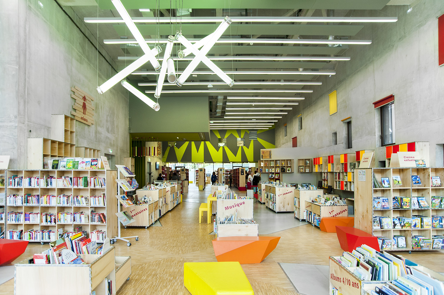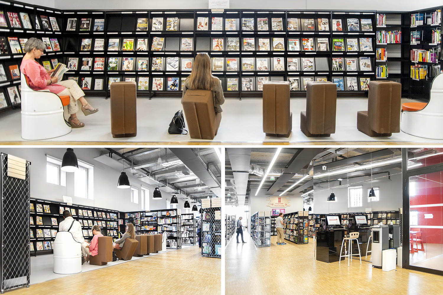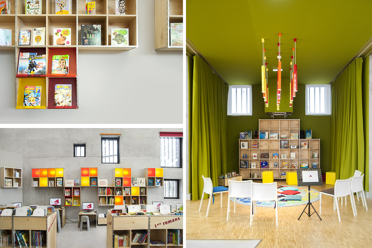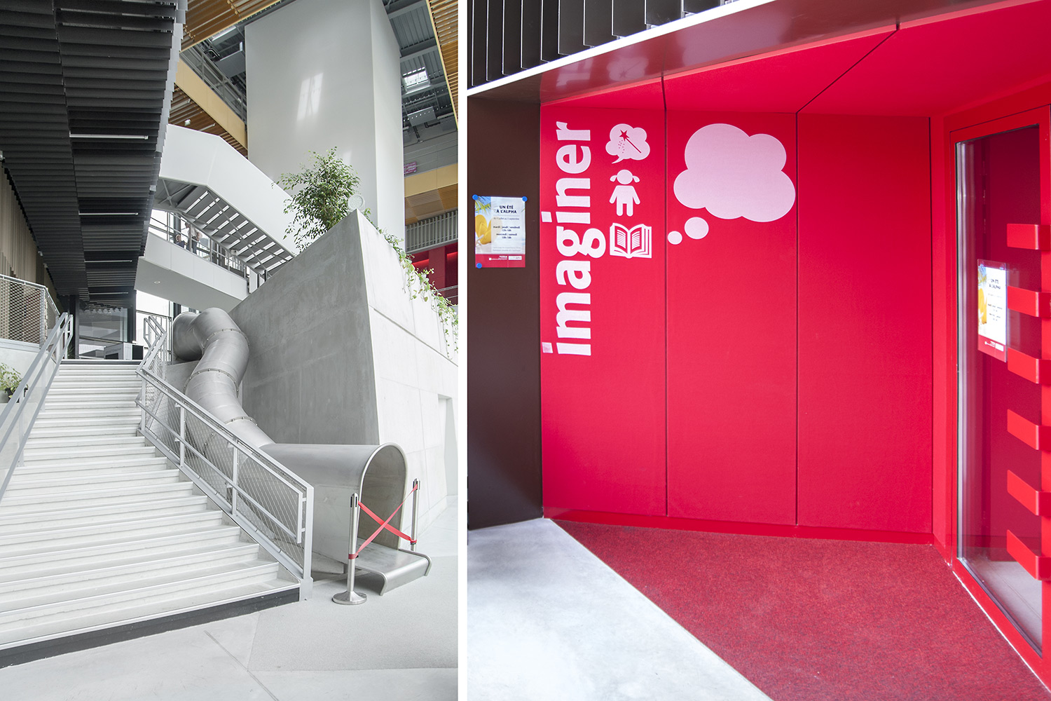 ”Skapande” är ett utrymme dedikerat till seriealbum, film, musik och konst. ”Förståelse” täcker kunskapsområden med plats för det nedtecknade kulturarvet och då även specifikt Chareneregionens historia. Här finns både offentliga och privata utrymmen för läsning och studier. Avdelningen ”Fantasi” sammanför barn- och litteratur samt ger tillgång till både gården och till hörsalen.